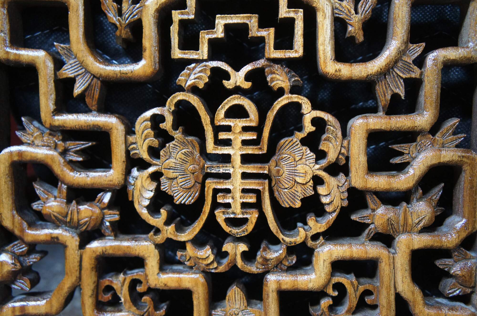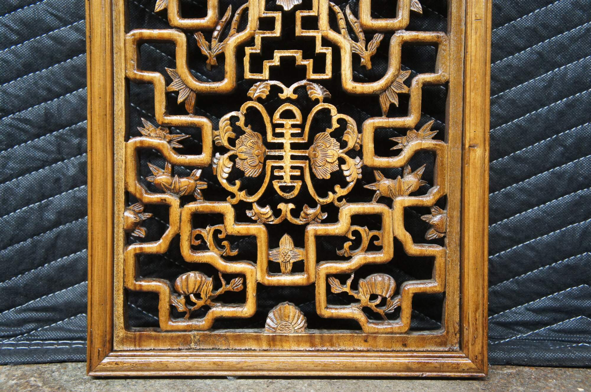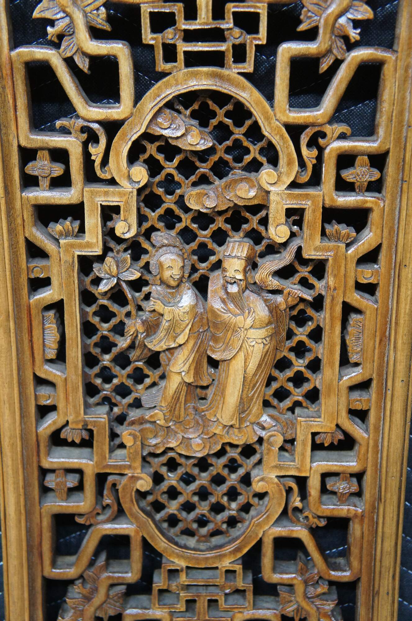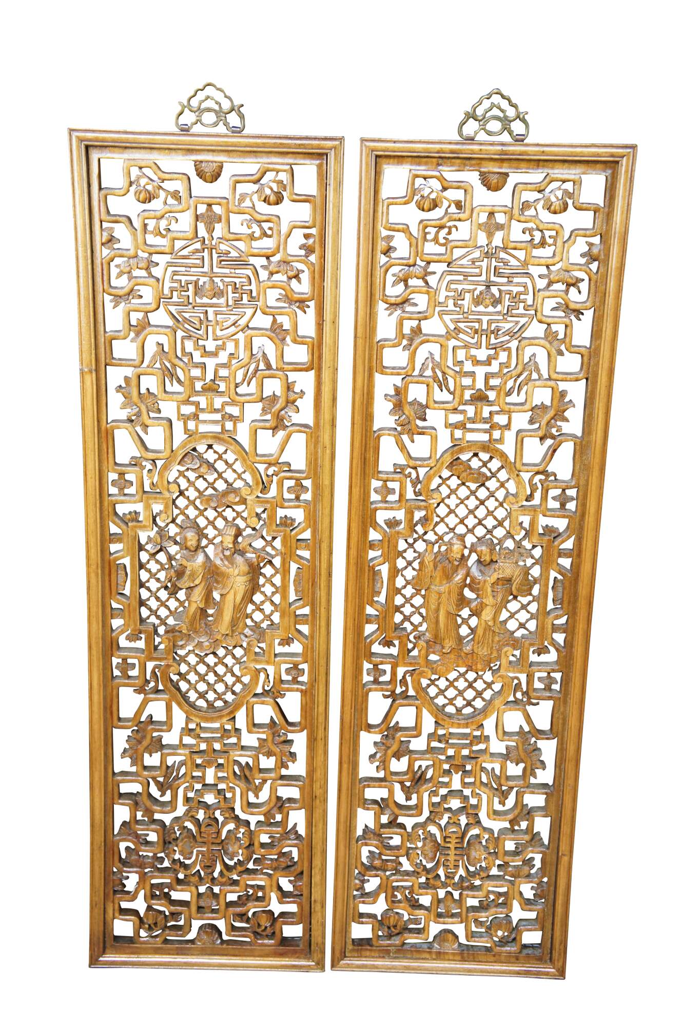 4 Vintage Chinese hardwood Qing Dynasty inspired carved panels. Features a pierced and scrolled detail with foliate, Chinese Greek key and immortal figures with lattice backing. Hangs via brass handle along the top.