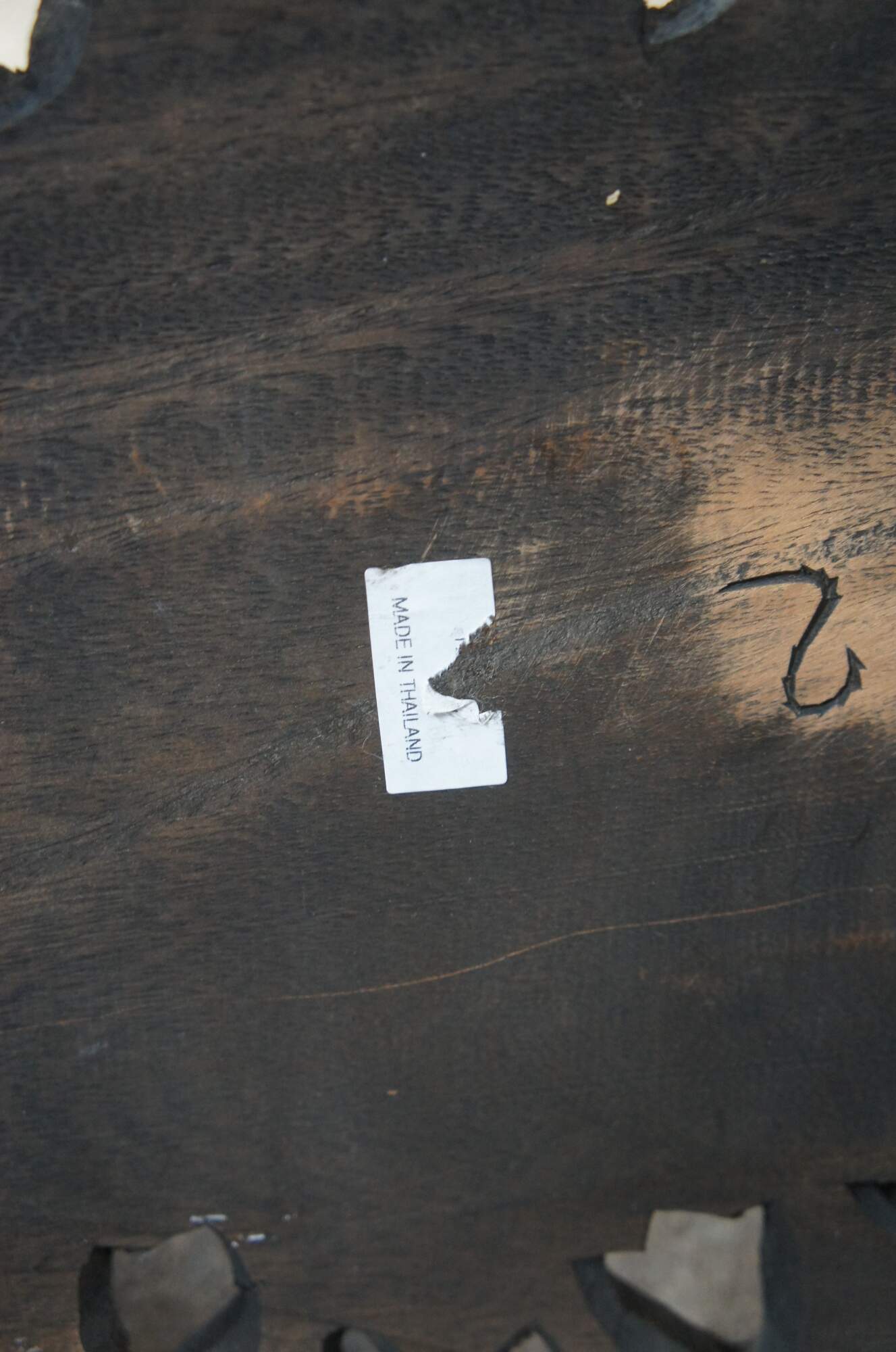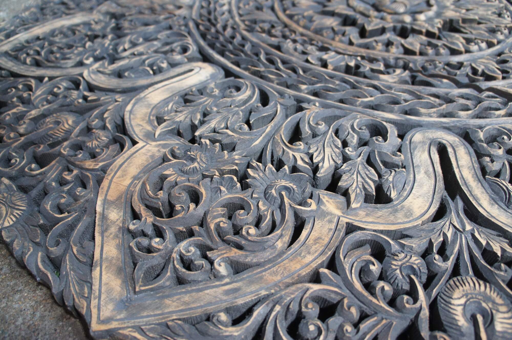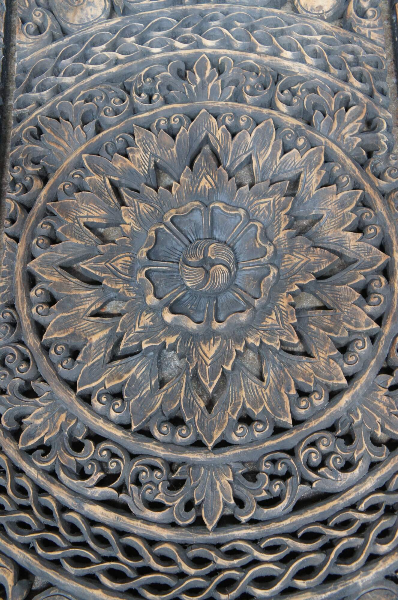 Intricate 3 piece Lotus medallion teak carved wall plaques. Handmade in Thailand. Each section hangs via metal bracket along the back.