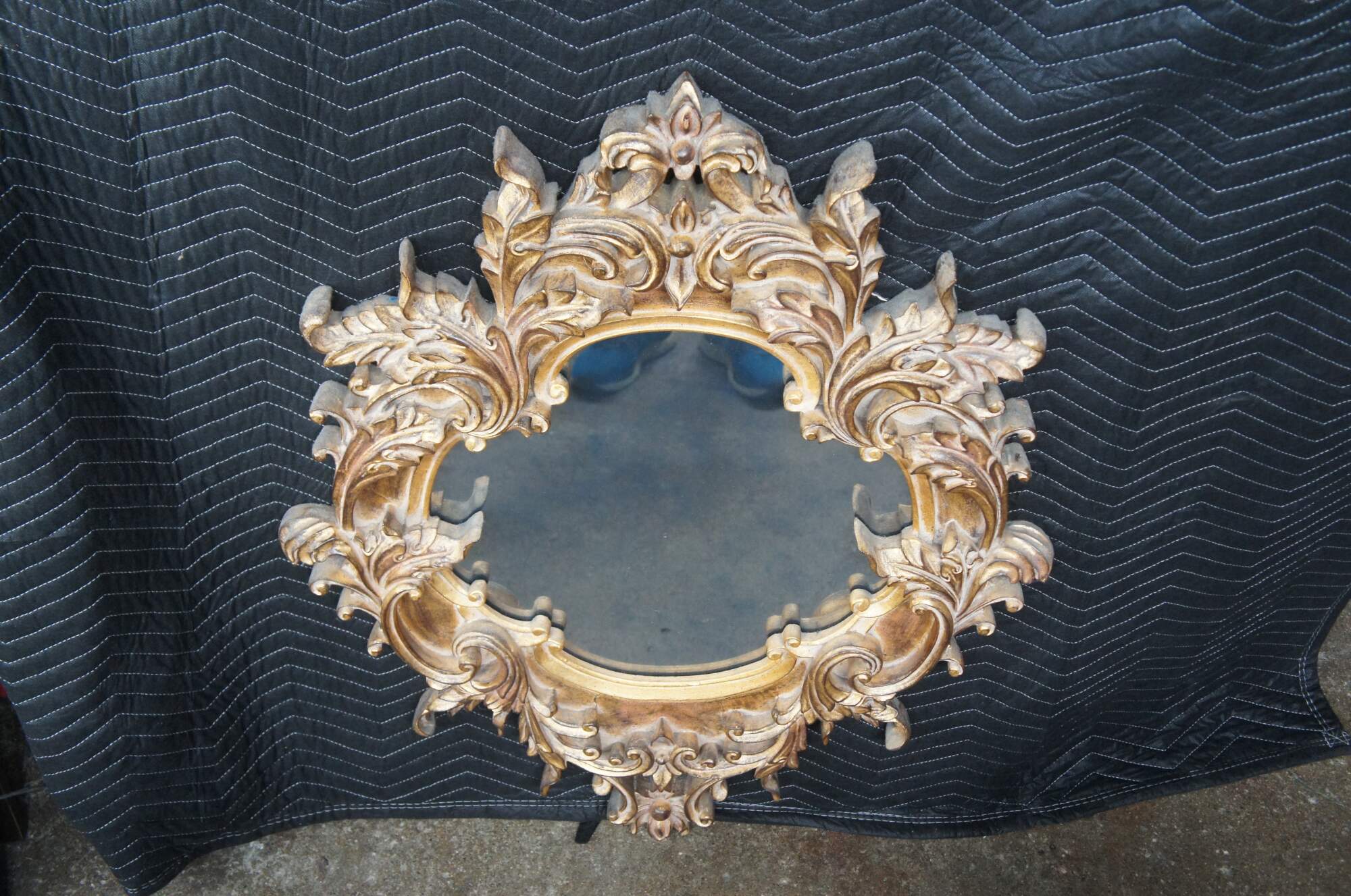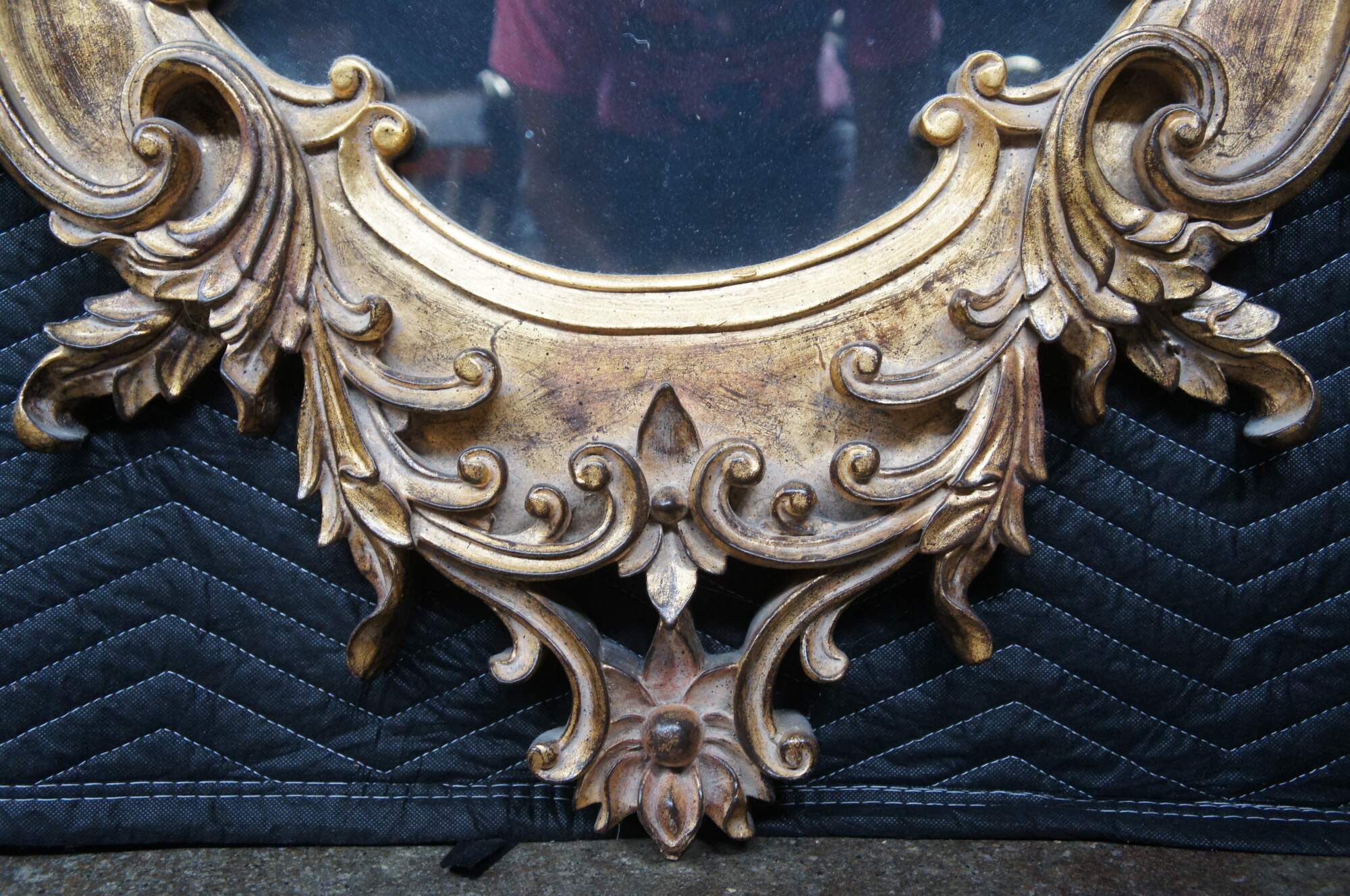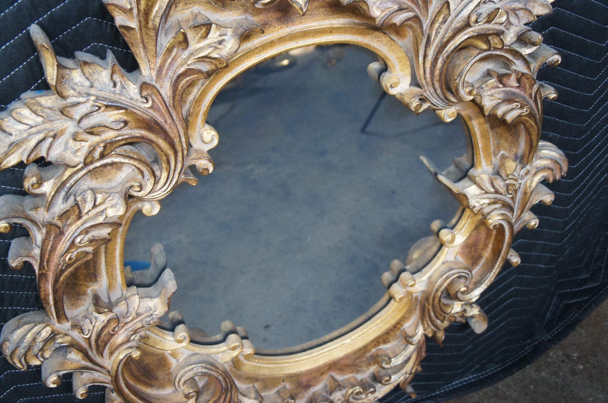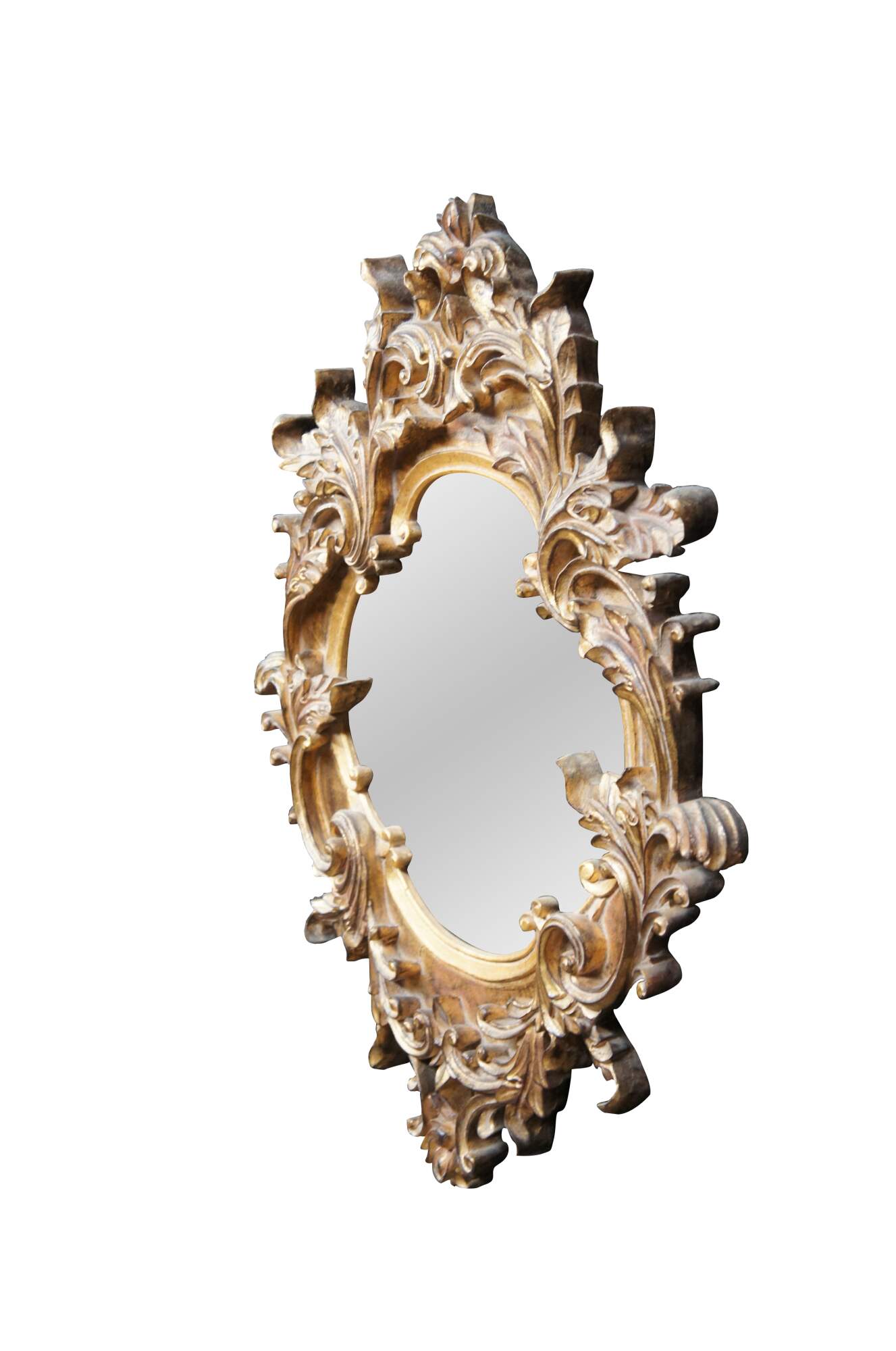 Vintage Raschella Collection wall or vanity mirror featuring Italian Regency styling with ornate Baroque / Rococo florals and acanthus leaves. Finished in Plum Gold. The glass is antiqued