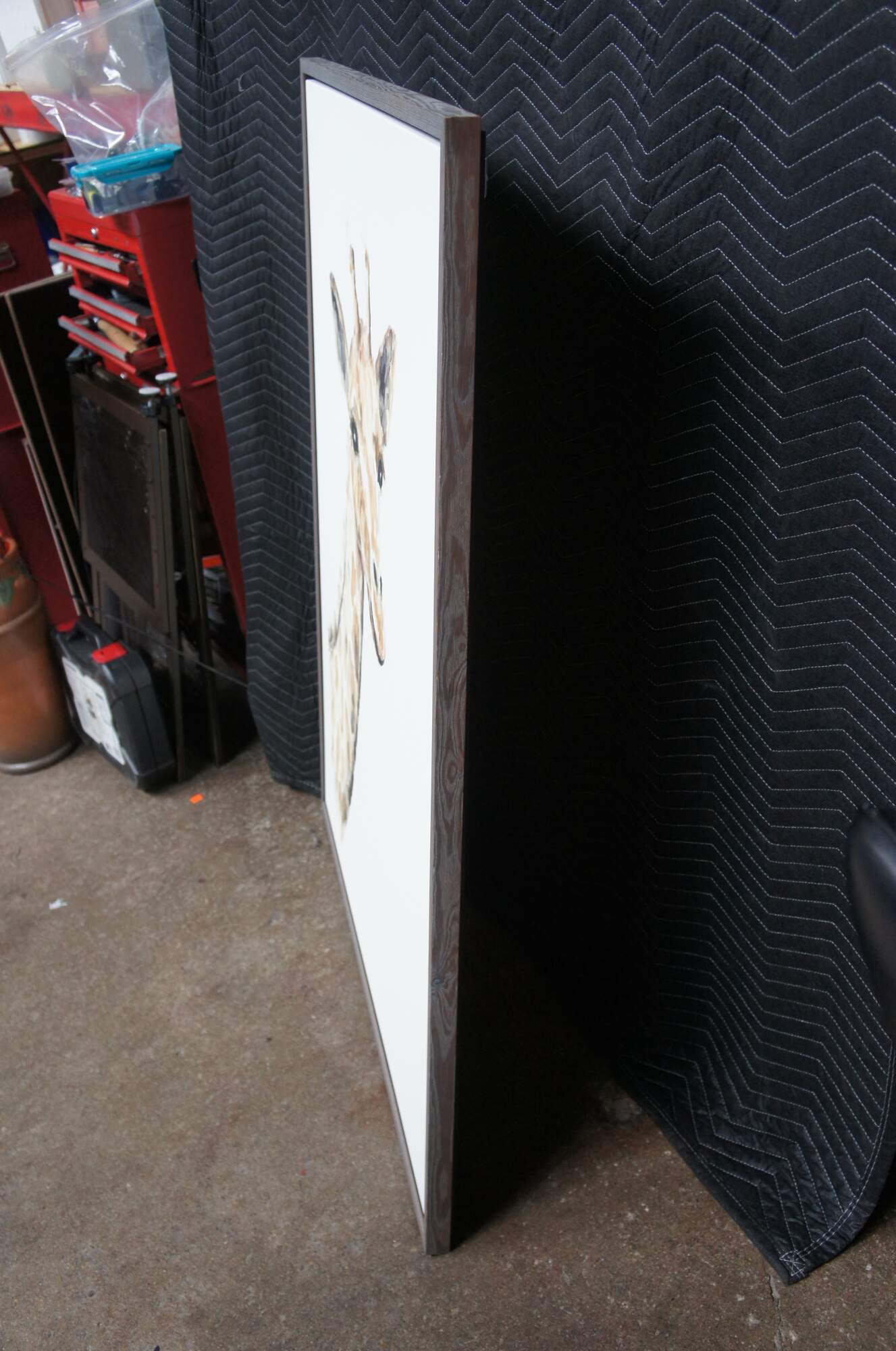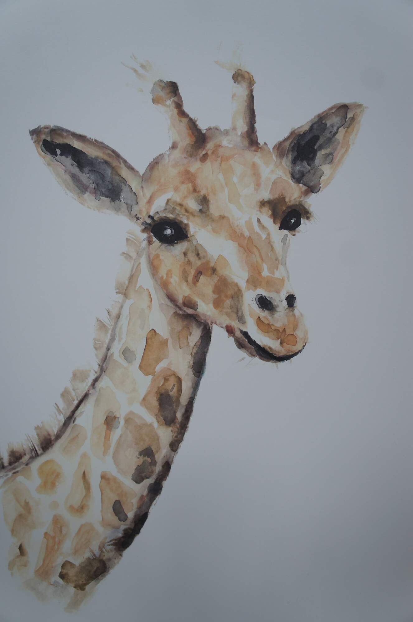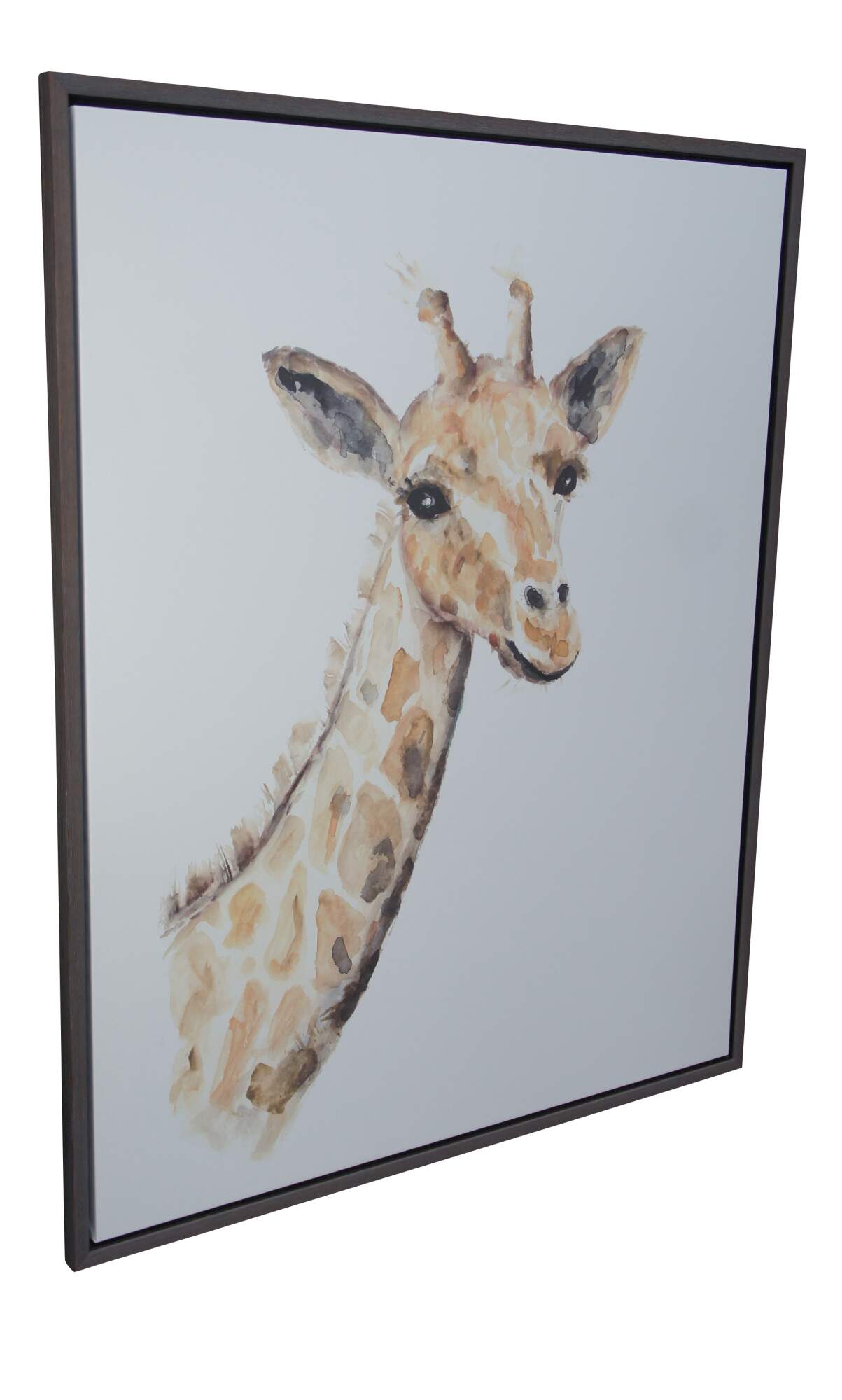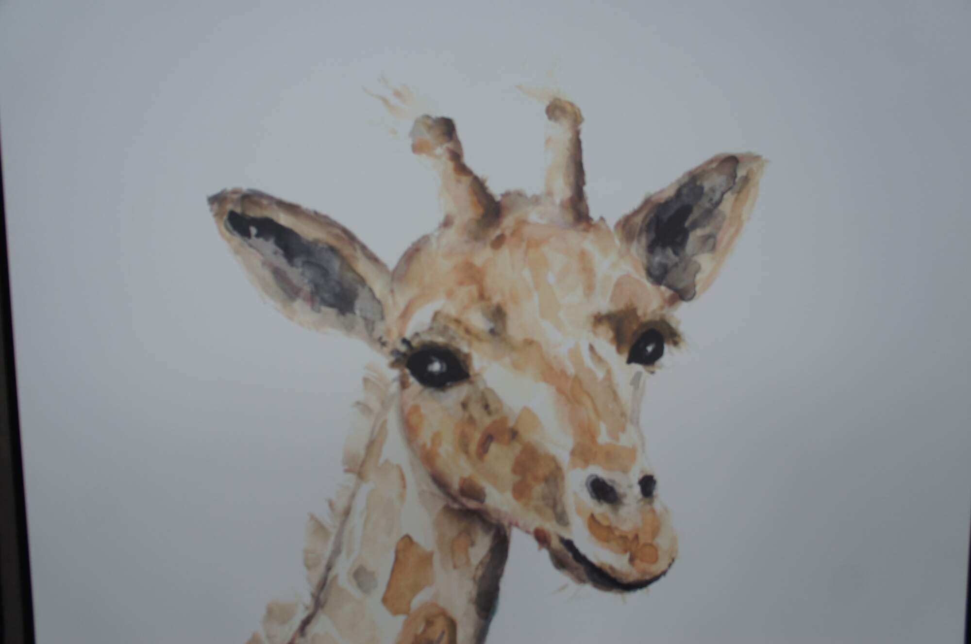 A fun giraffe watercolor painting on canvas from Restoration Hardware. Framed in oak by the Larson Juhl an industry leader in framing.