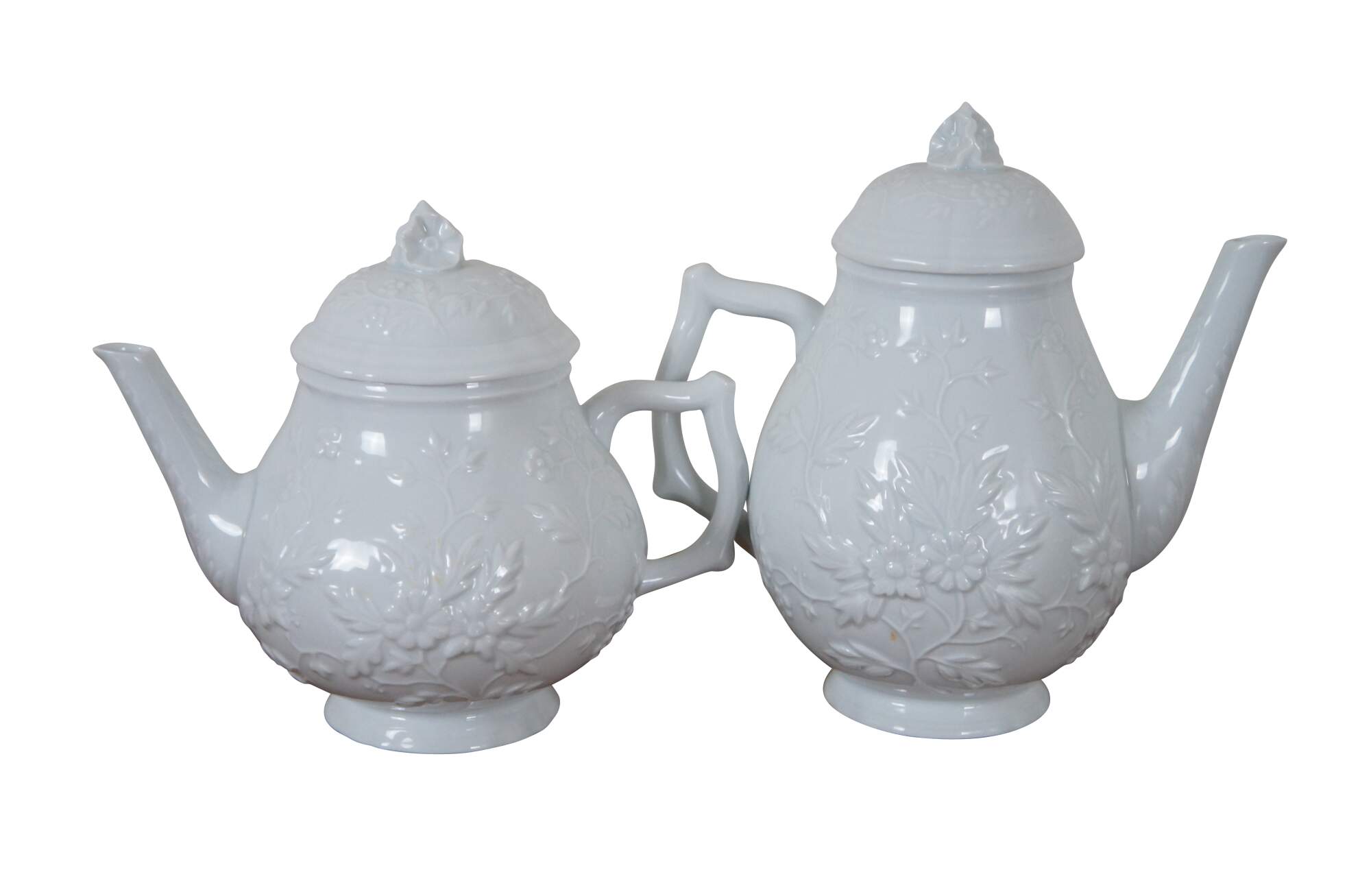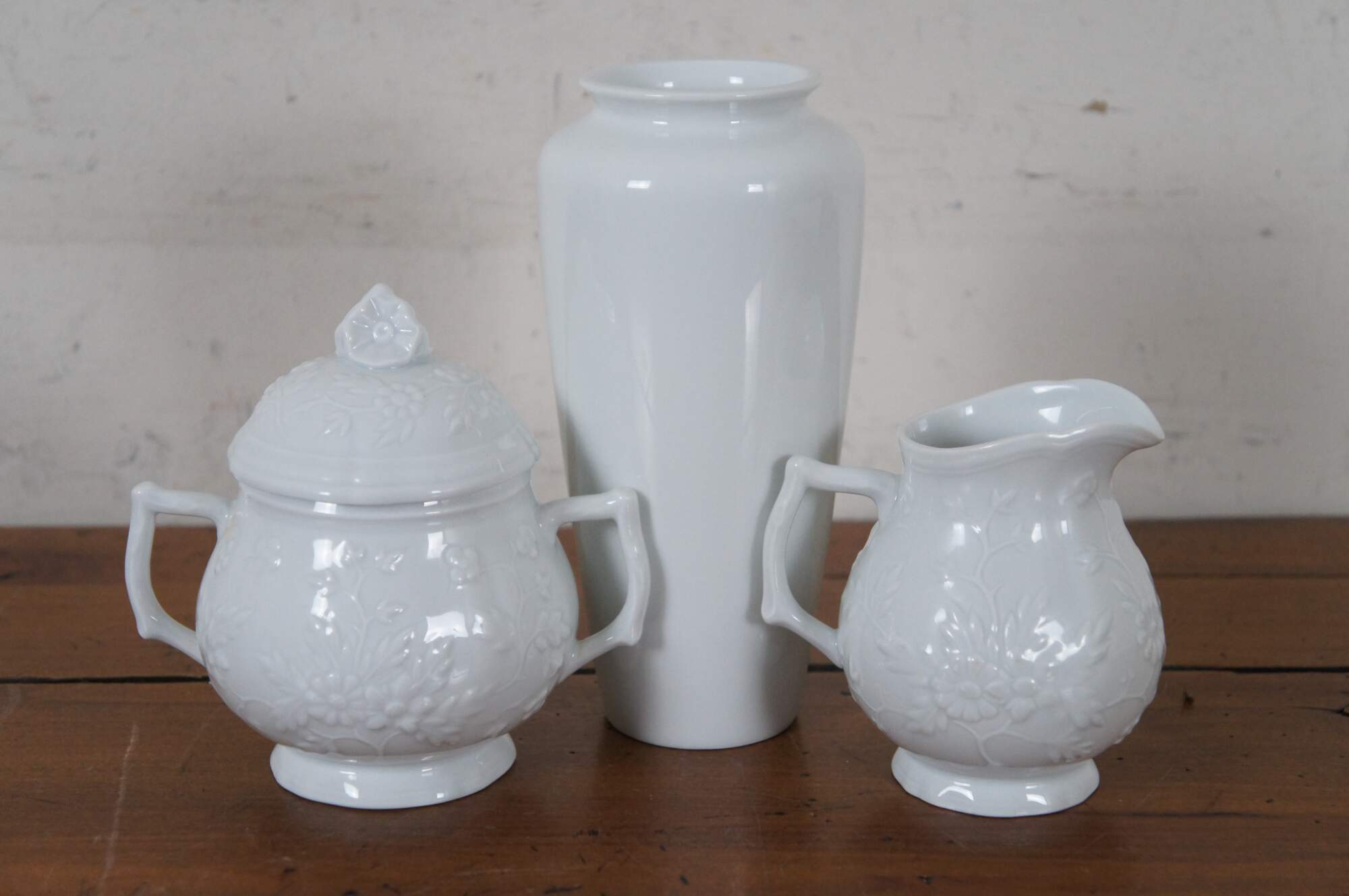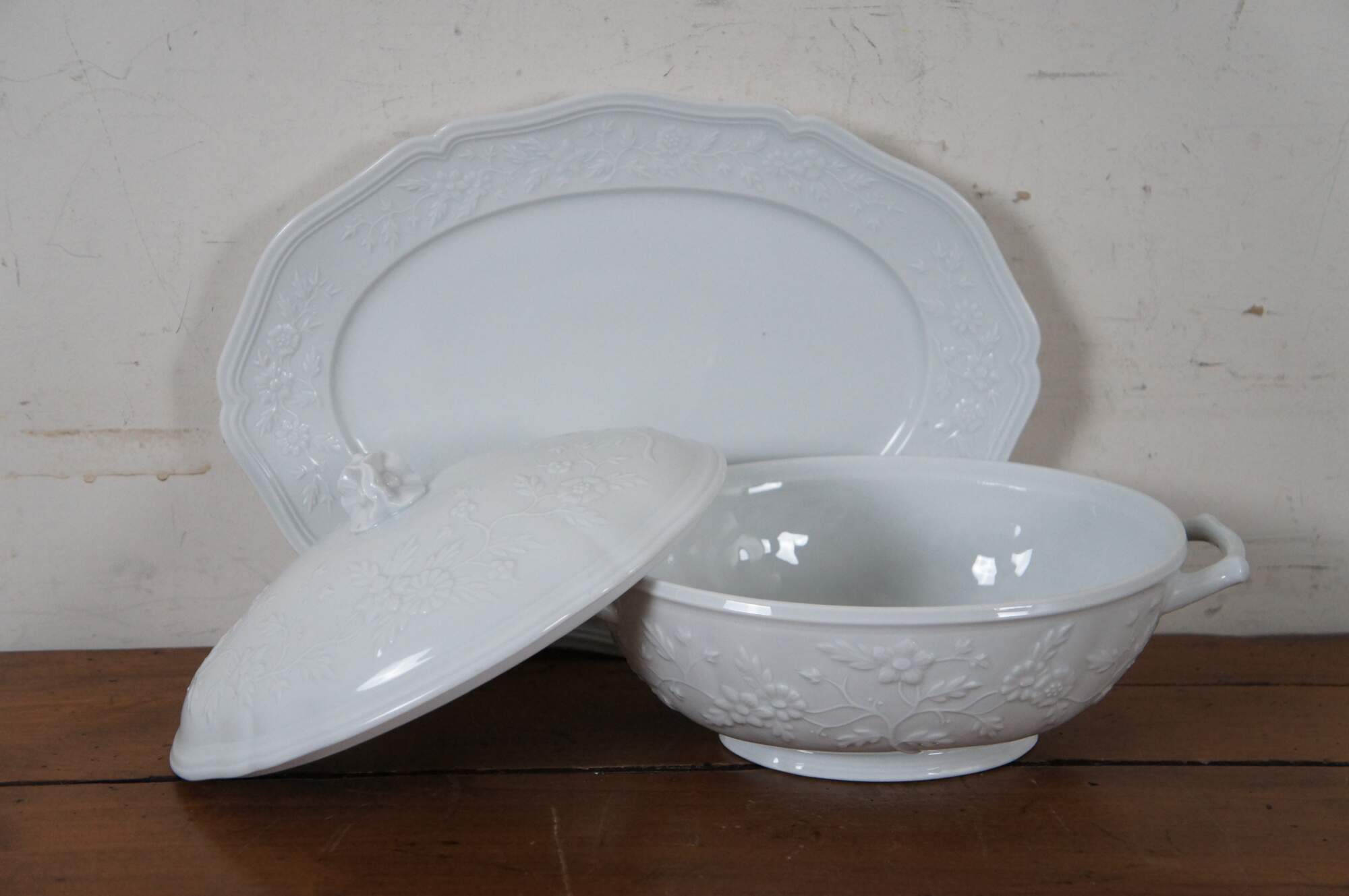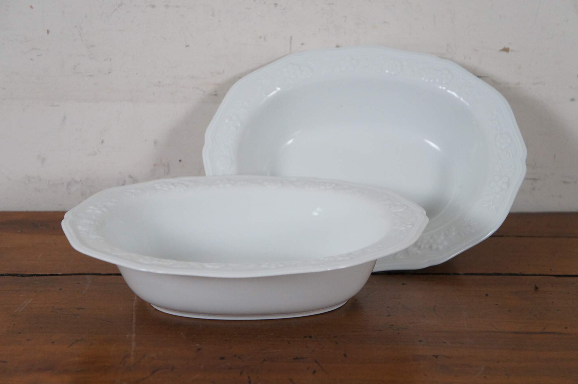 Vintage 76 piece embossed white floral Limoges porcelain dinnerware set with service for 8 in the Hawthorne (Hawthorn) pattern. Produced by Ceralene / A. Raynaud et Cie of Limoges, France. Variety of marks suggest this set was purchased and pieced together over a number of years.