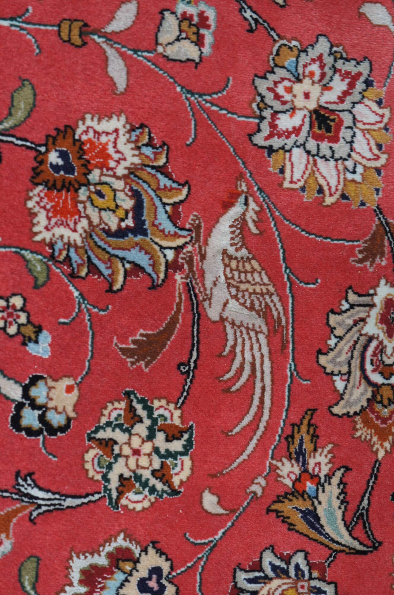 Very high quality vintage hand knotted Persian Tabriz. Features silk and wool pile featuring a red field with central medallion and floral all over design with birds. Reds, Blues, Tans, Creme, Pink, Greens, Yellows, Orange, Browns