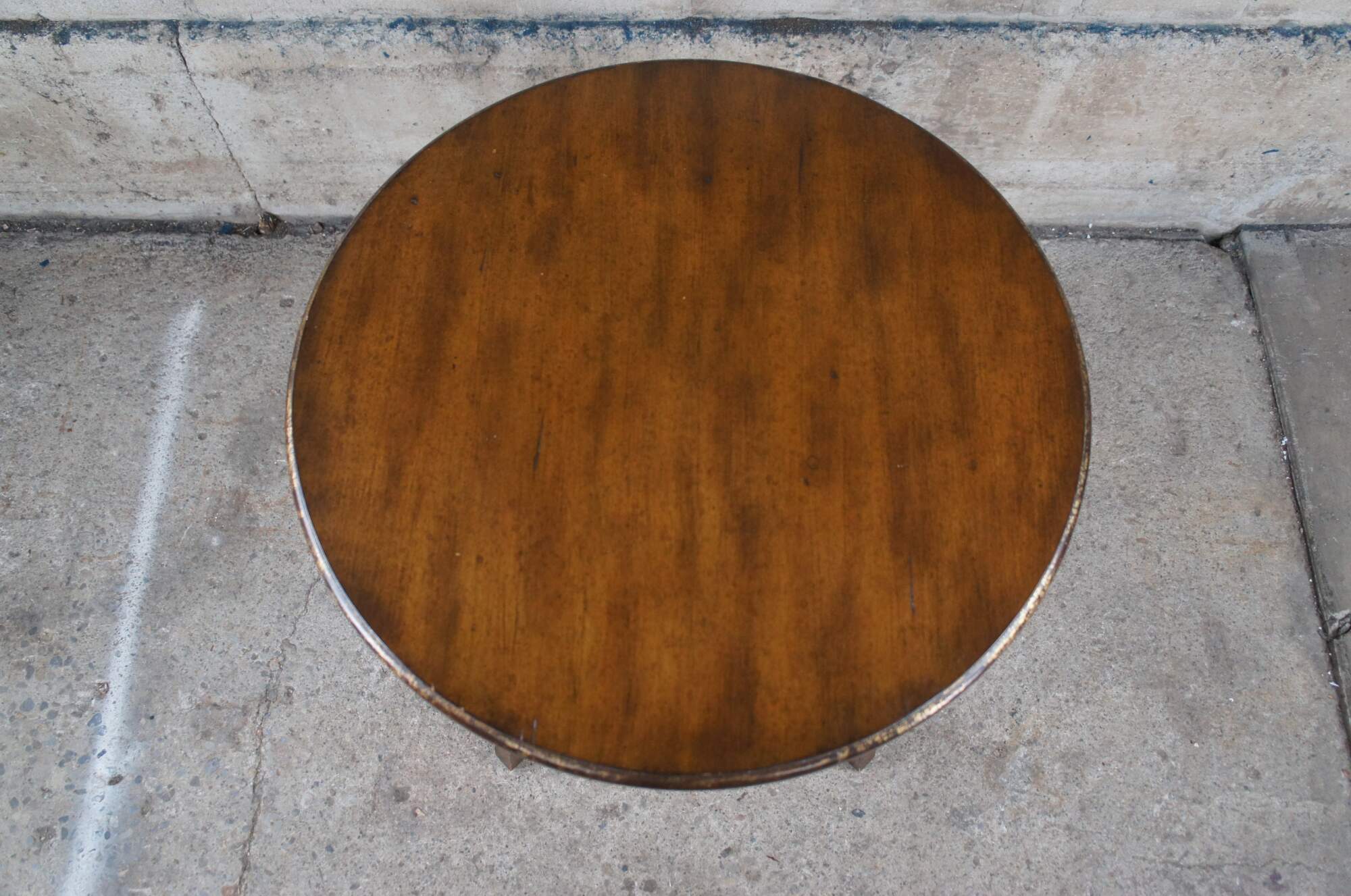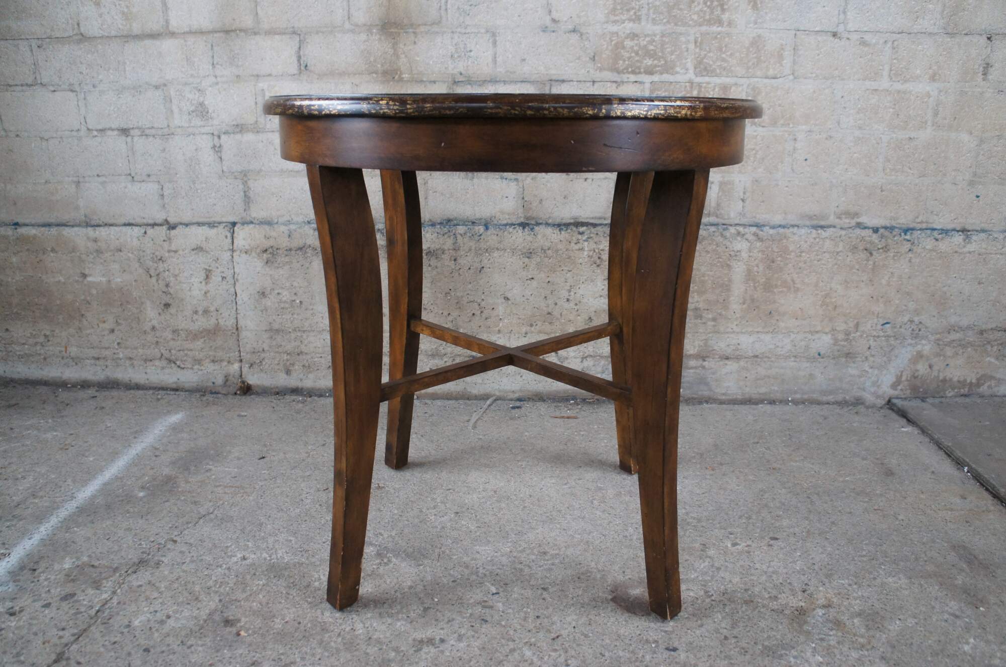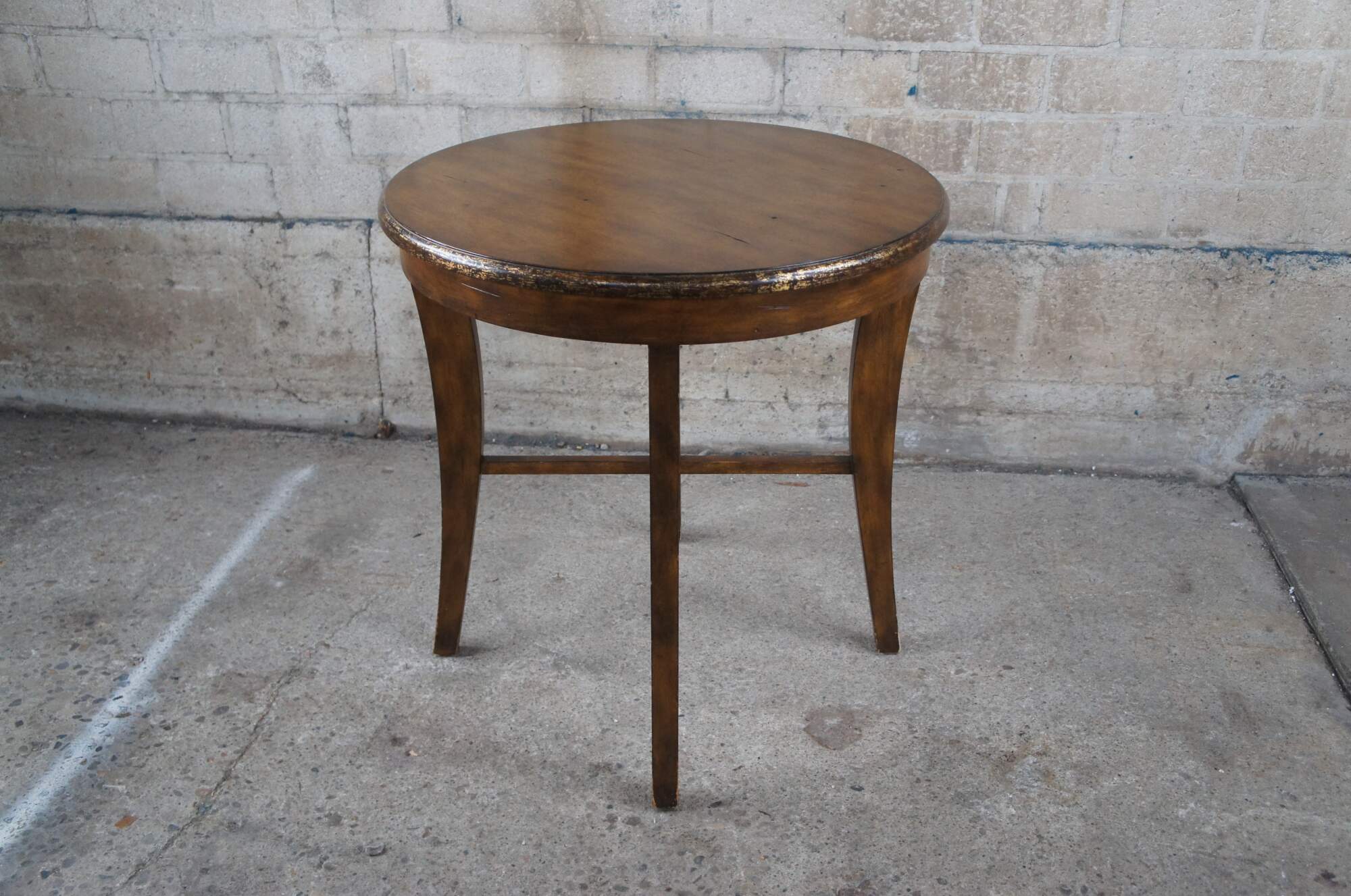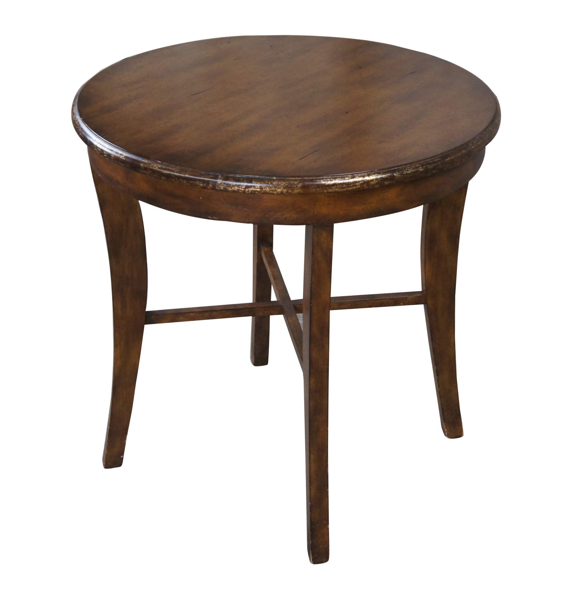 Vintage mahogany finished center or accent table featuring round form with an antiqued rubbed gold paint edge over four legs connected by x support and slightly flared legs.