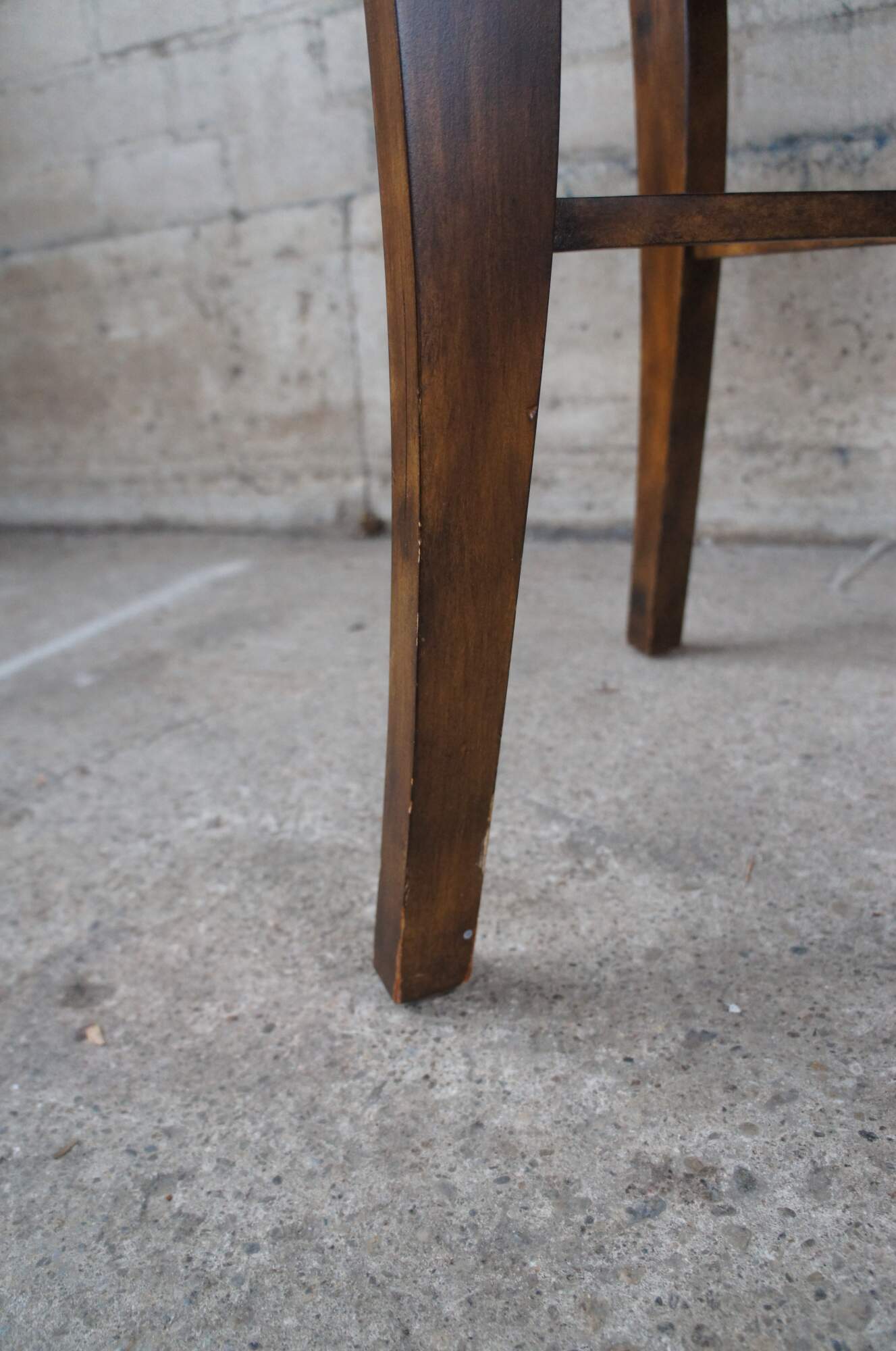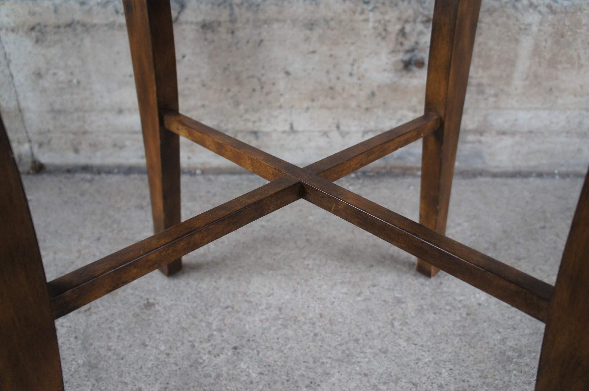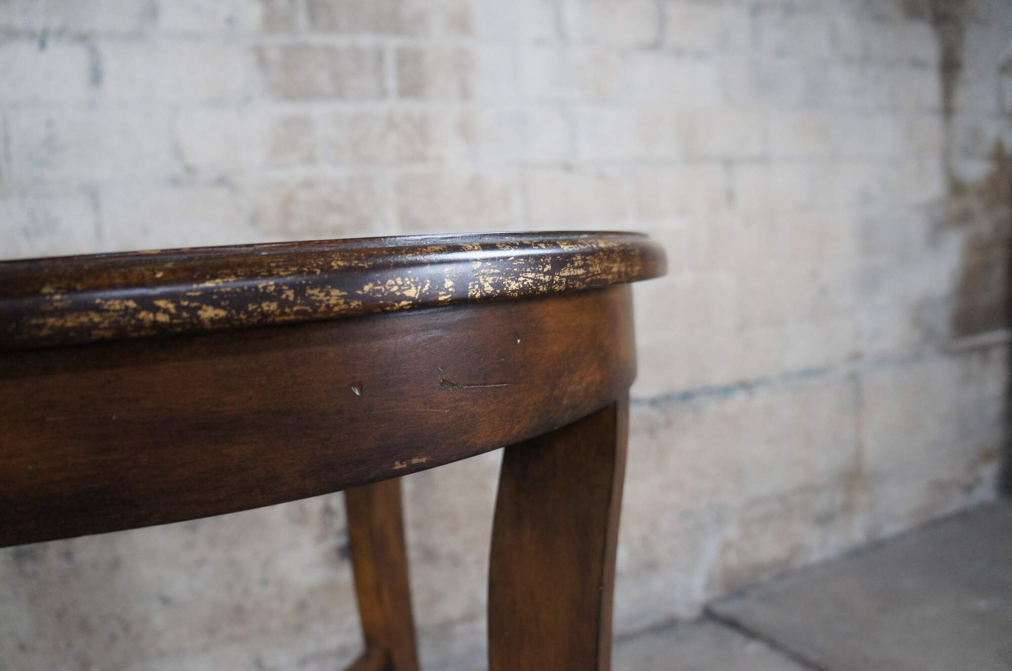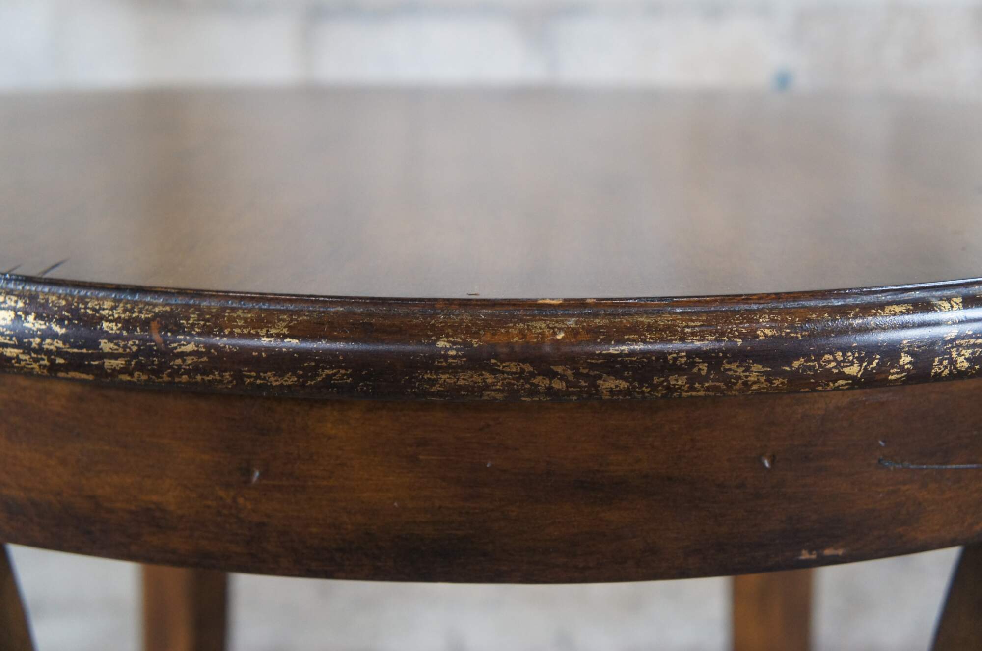 Vintage mahogany finished center or accent table featuring round form with an antiqued rubbed gold paint edge over four legs connected by x support and slightly flared legs.
