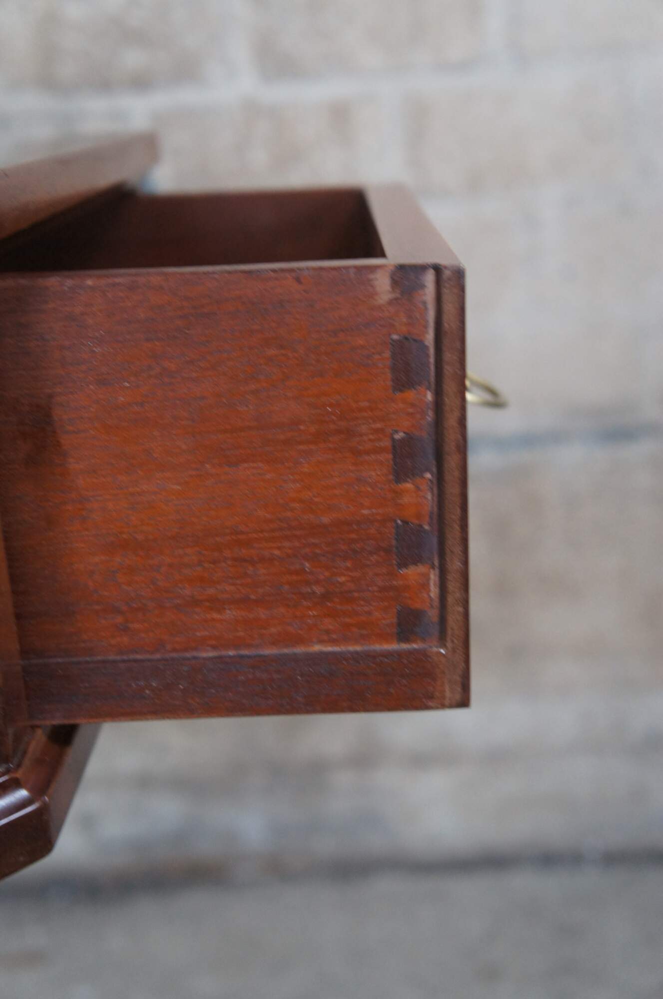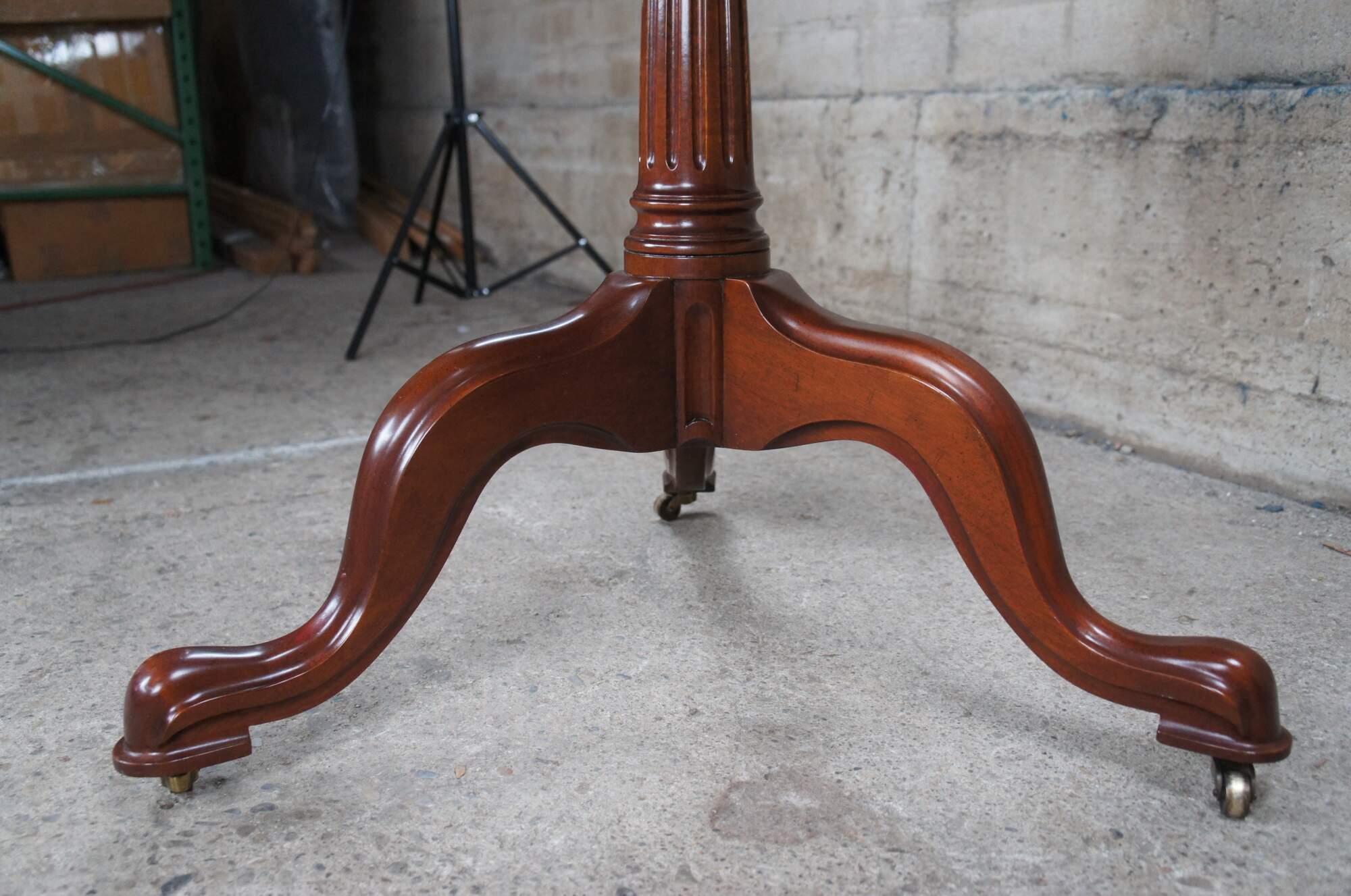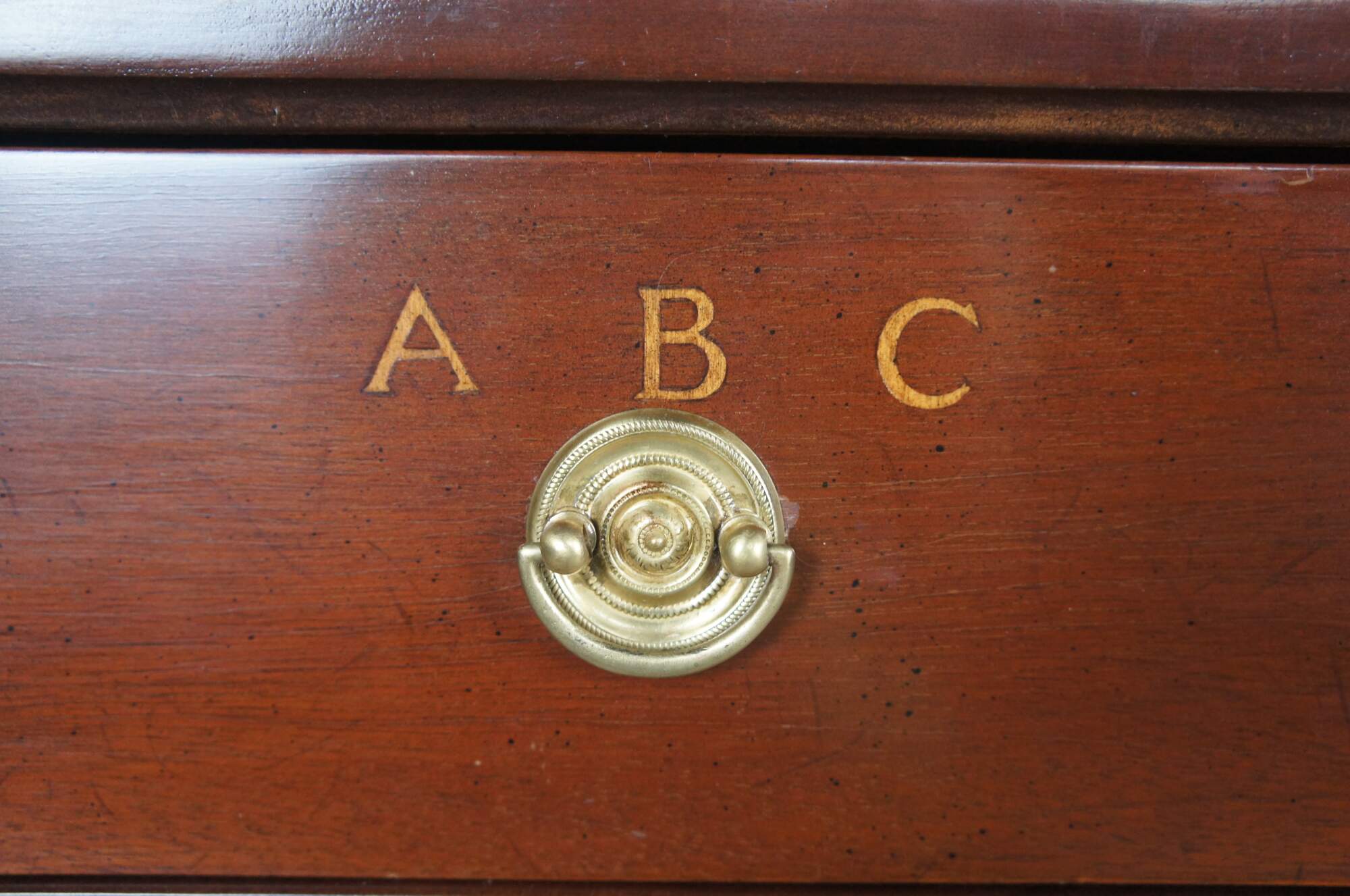 A beautiful mahogany File or Rent table by Kittinger. This table is part of the Thomas Jefferson collection that was authorized by the Thomas Jefferson Memorial Foundation. It is a reproduction of the original table which was used by Thomas Jefferson and is located in the Monticello Library today. It has an octagonal top with hand-turned/hand-carved fluted pedestal baseending in a hoof foot. The four dovetailed drawers and four hinged door compartments have inlaid boxwood alphabetical lettering. The top swivels 360 degrees. Originally Purchased from William W. Sauer Associates Ltd. Virginia Beach, VA in 1997.