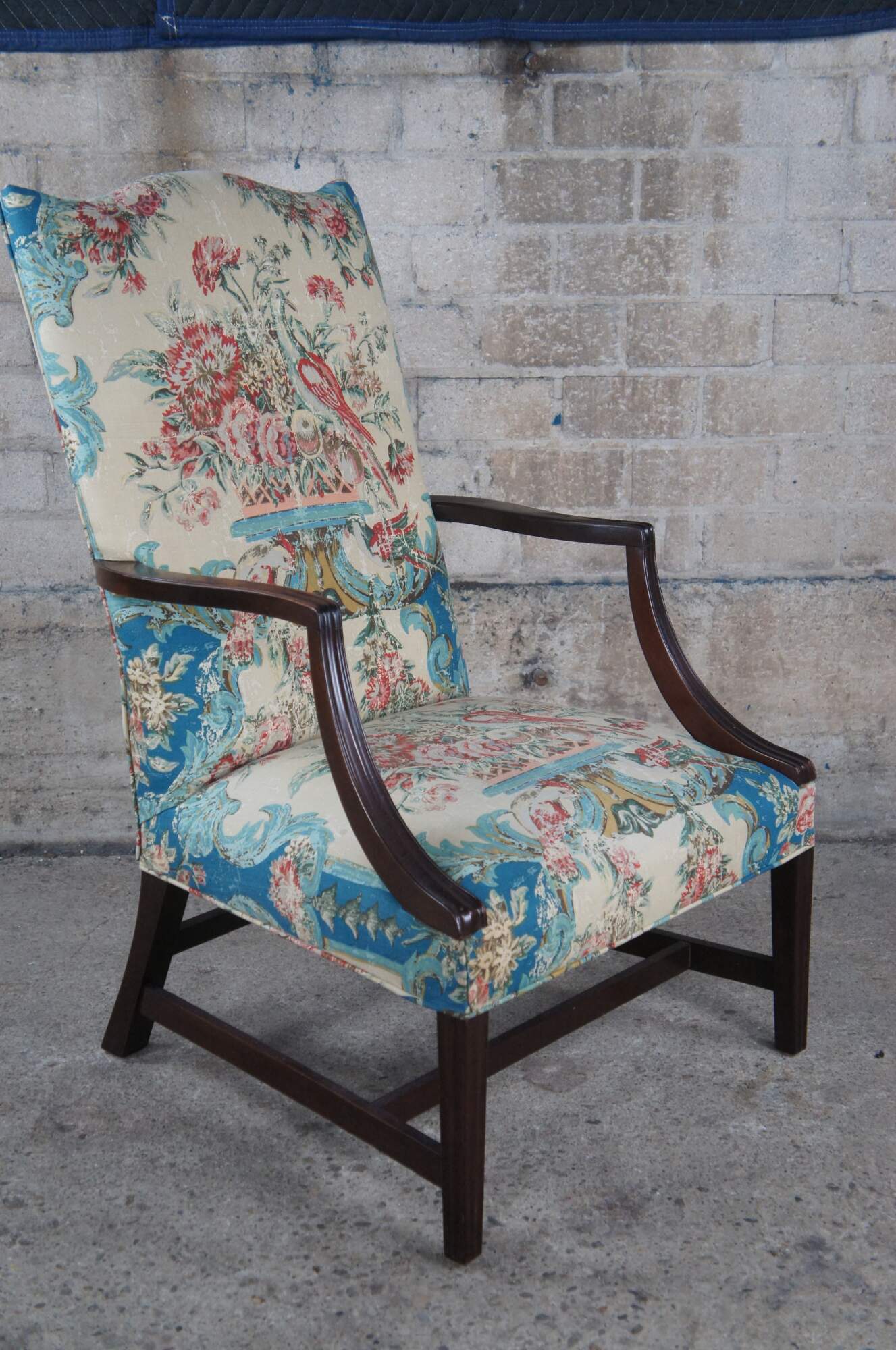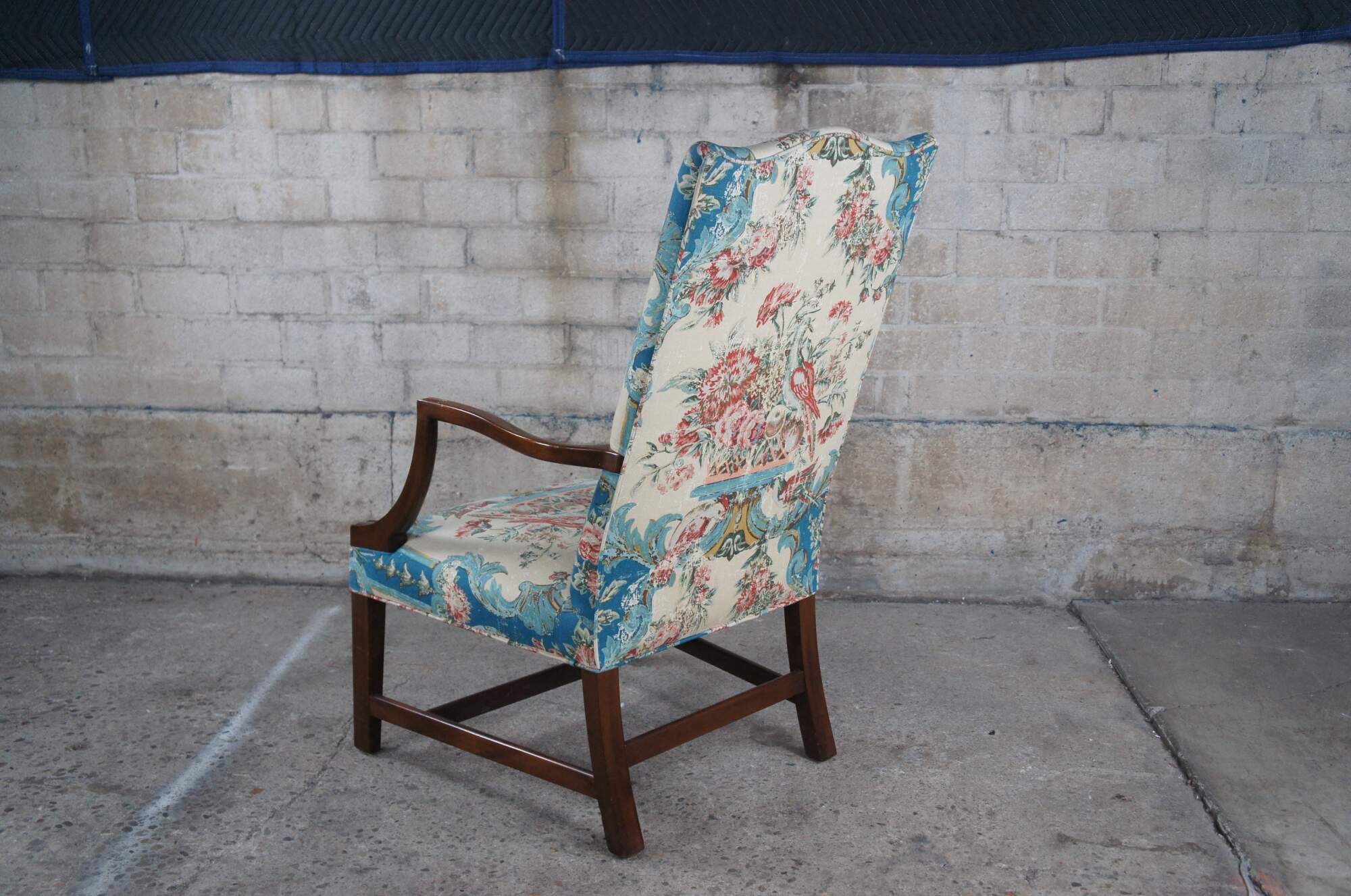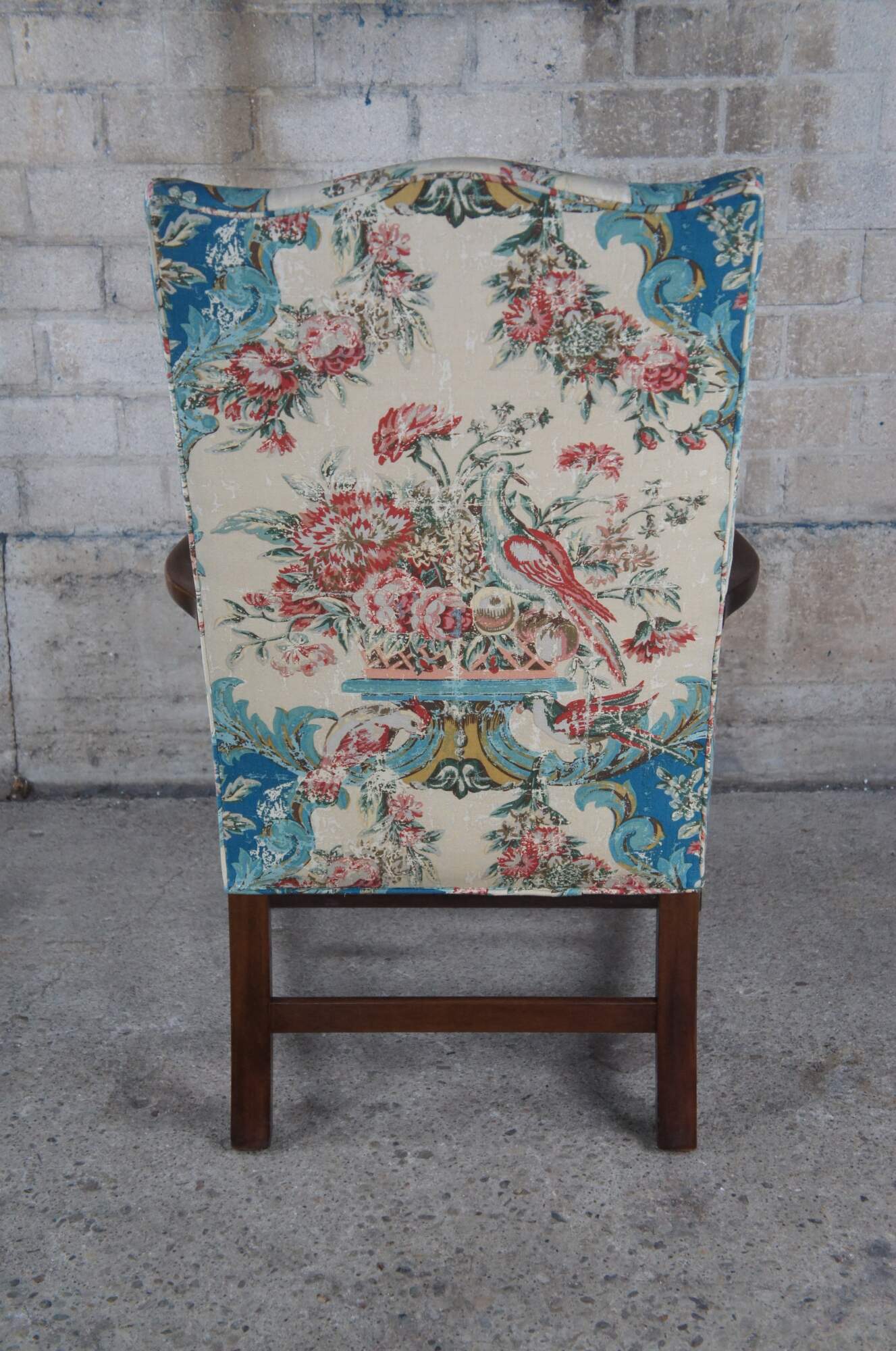 Pair of 20th Century Federal Style Martha Washington Lolling armchairs. Reminiscent of the Gainsborough chair that was made in England in the 18th century. Made of mahogany featuring traditional wide form with serpentine high back and open downswept arms. Upholstery features floral and bird chinoiserie motif with trophy urn centerpiece bouquet of flowers.