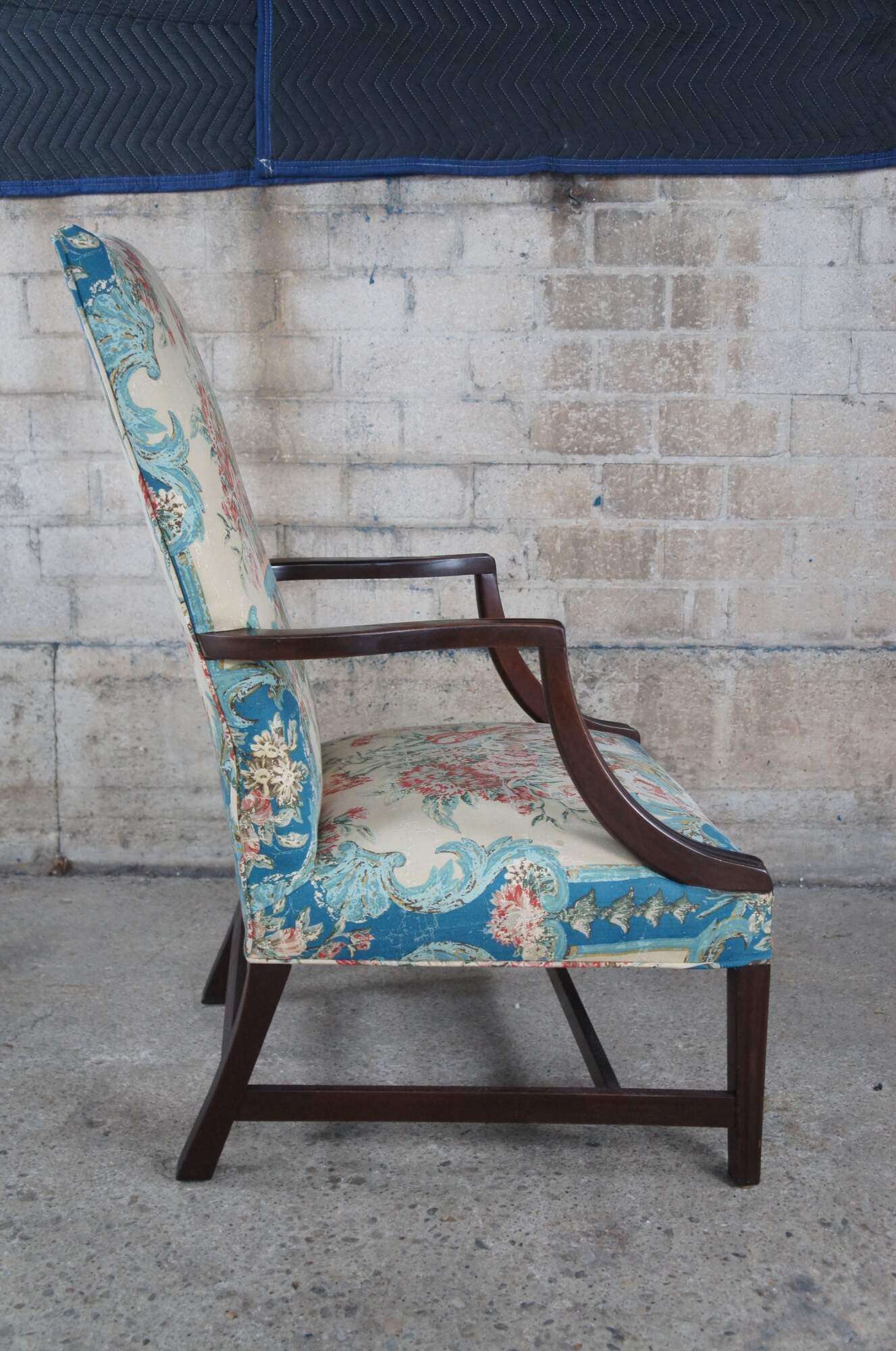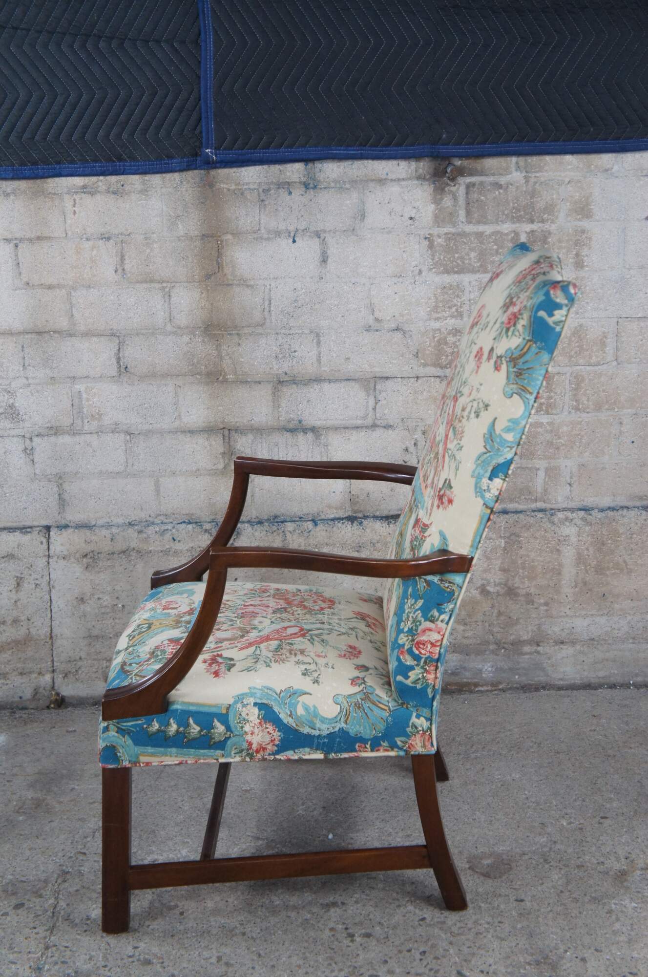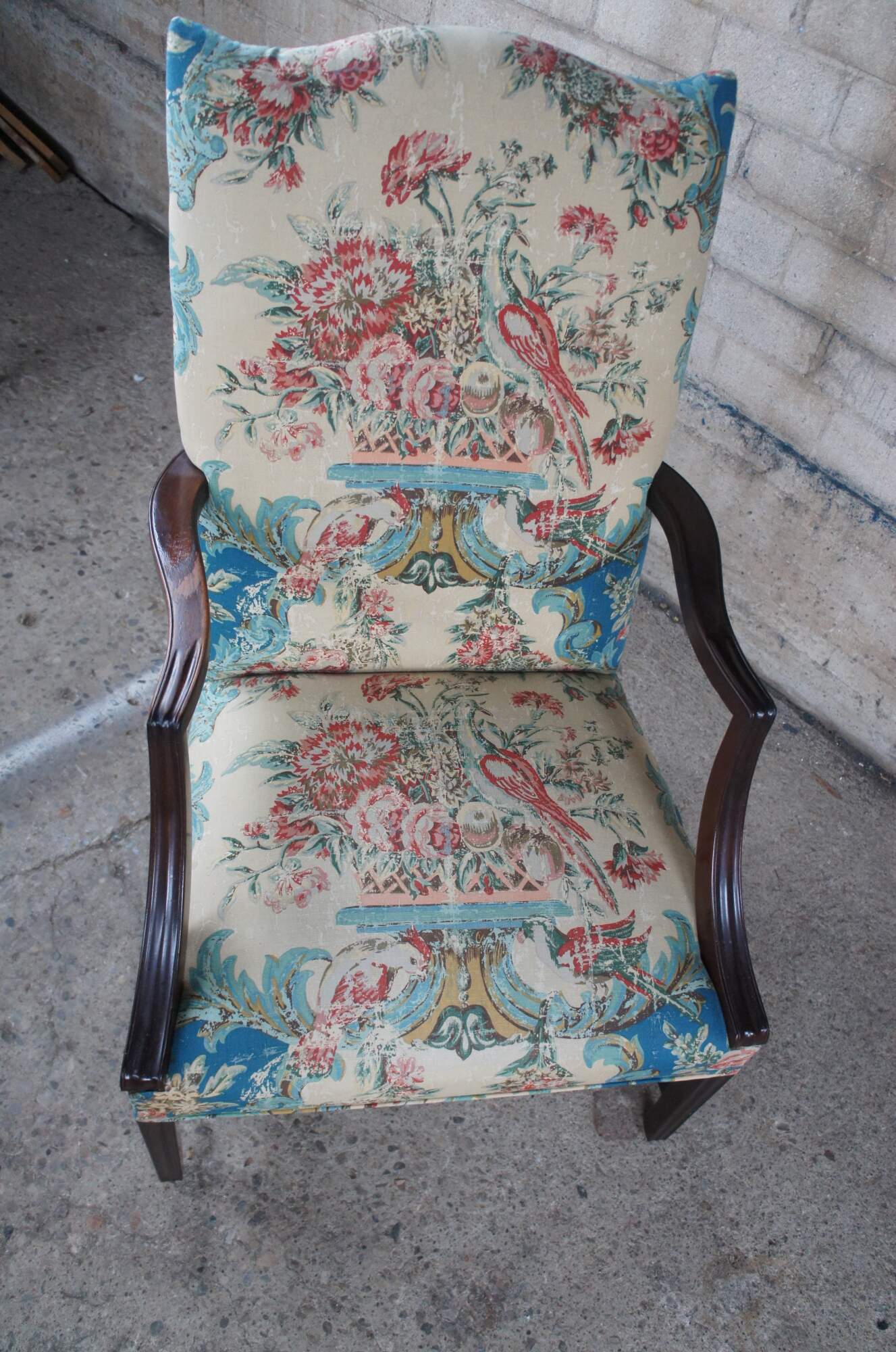 Pair of 20th Century Federal Style Martha Washington Lolling armchairs. Reminiscent of the Gainsborough chair that was made in England in the 18th century. Made of mahogany featuring traditional wide form with serpentine high back and open downswept arms. Upholstery features floral and bird chinoiserie motif with trophy urn centerpiece bouquet of flowers.