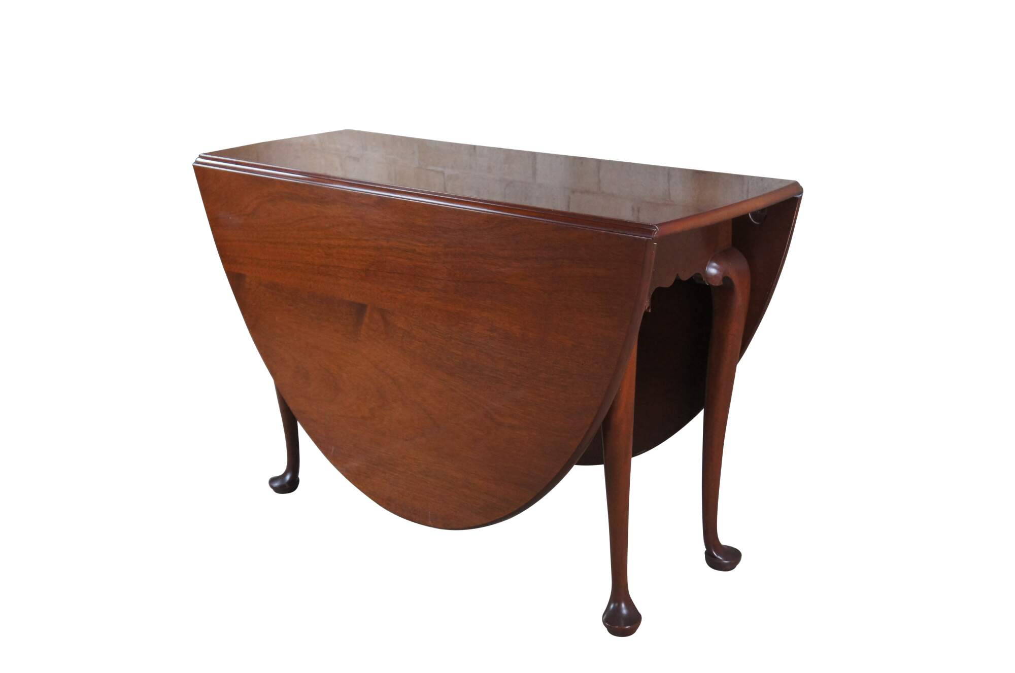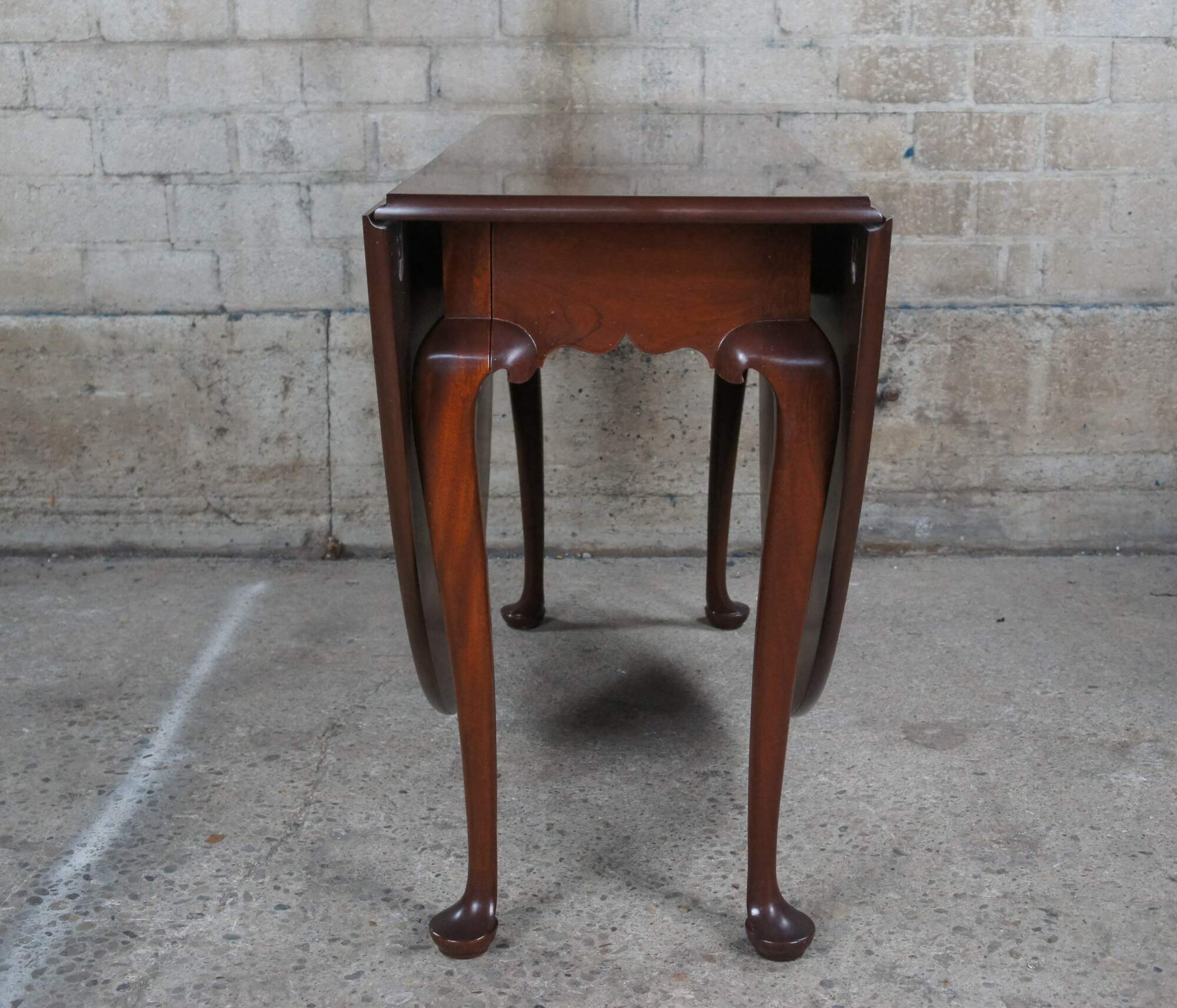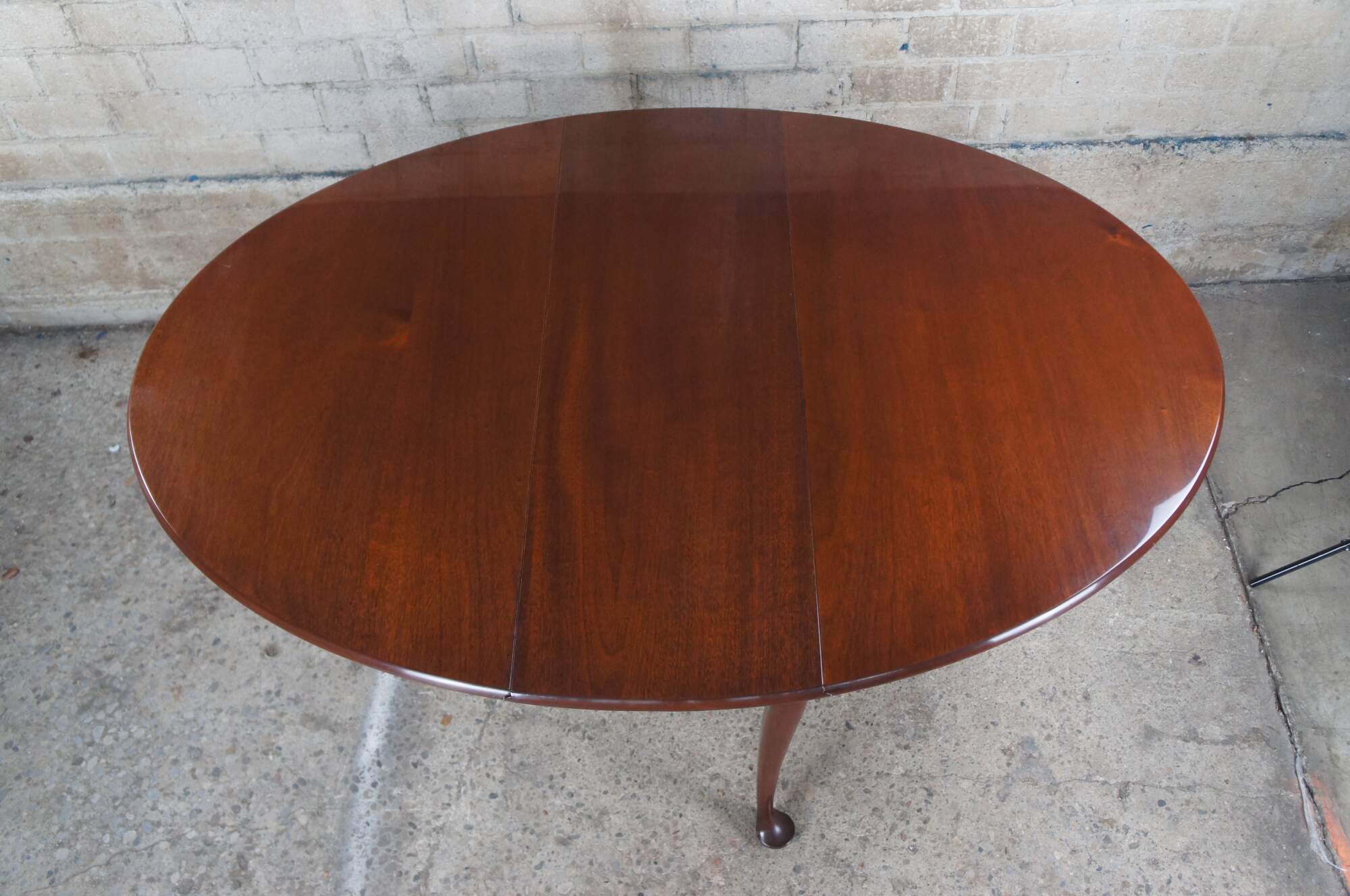 Vintage Biggs Furniture Chippendale / Queen Anne oval drop leaf dining table, circa last half 20th century. Made of mahogany featuring a high gloss georgian finish. The table has a rectangular or oval form with large drop leaves, gatelegs and slipper feet. Originally Purchased from William W. Sauer Associates Ltd. Bethesda, MD in 1982.