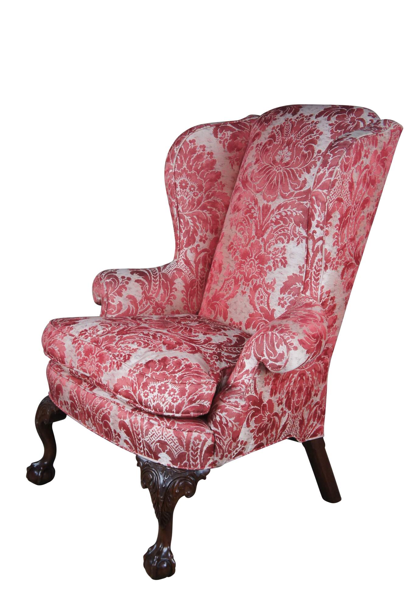 Vintage Chippendale Wing Chair by H.C. Gulden Mfg. Co., circa last half of the 20th Century. Made from mahogany with rolled flared arms, a high Chippendale back, bow front and carved leg leading to ball & claw feet. Upholstered in a Muslin Greenslade red brocade. Fabric intended to match the drawing room walls of the Manor House. Originally Purchased from William W. Sauer Associates Ltd. in Virginia Beach, Virginia 23451 in 1998 for $6,070