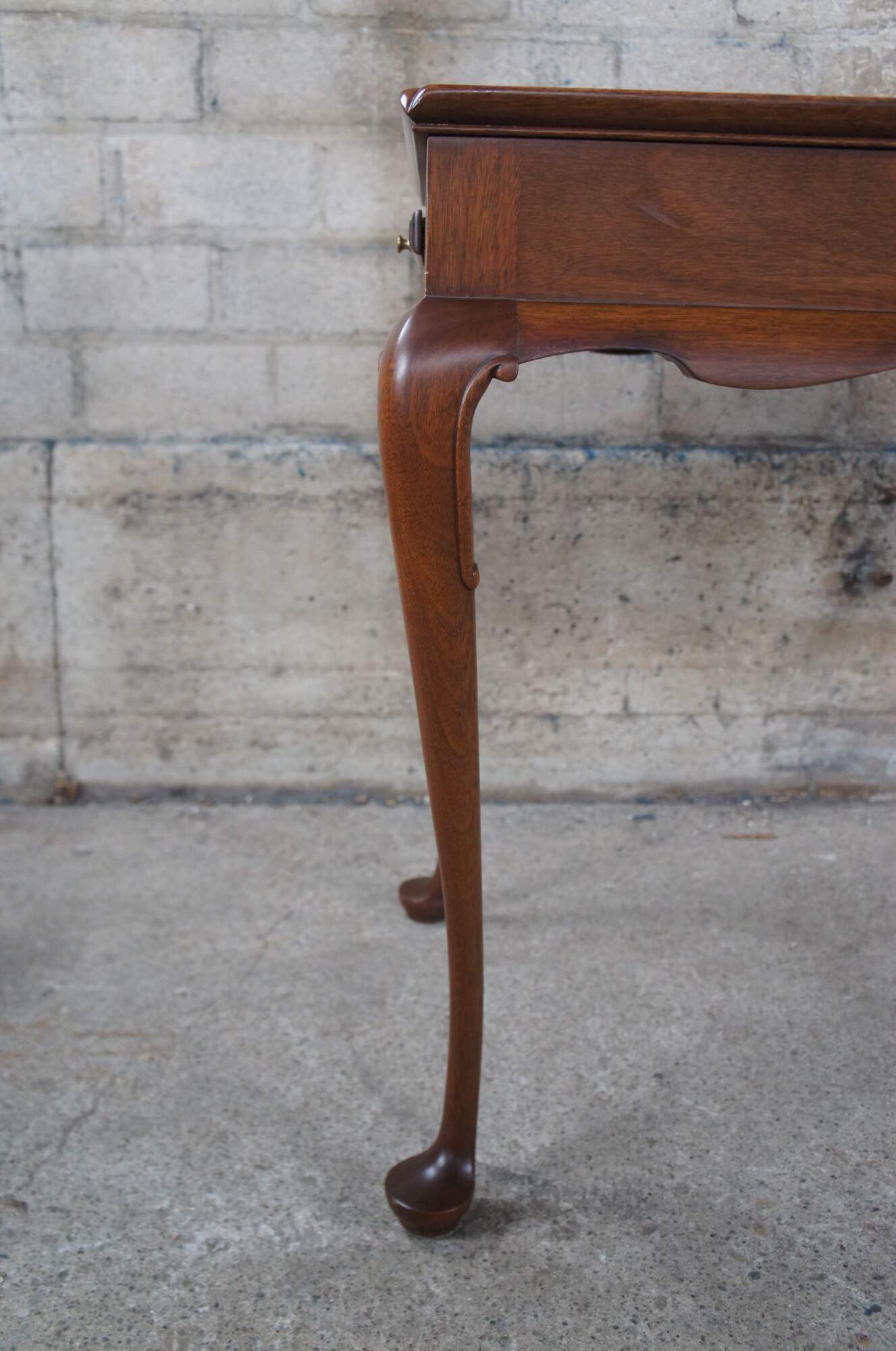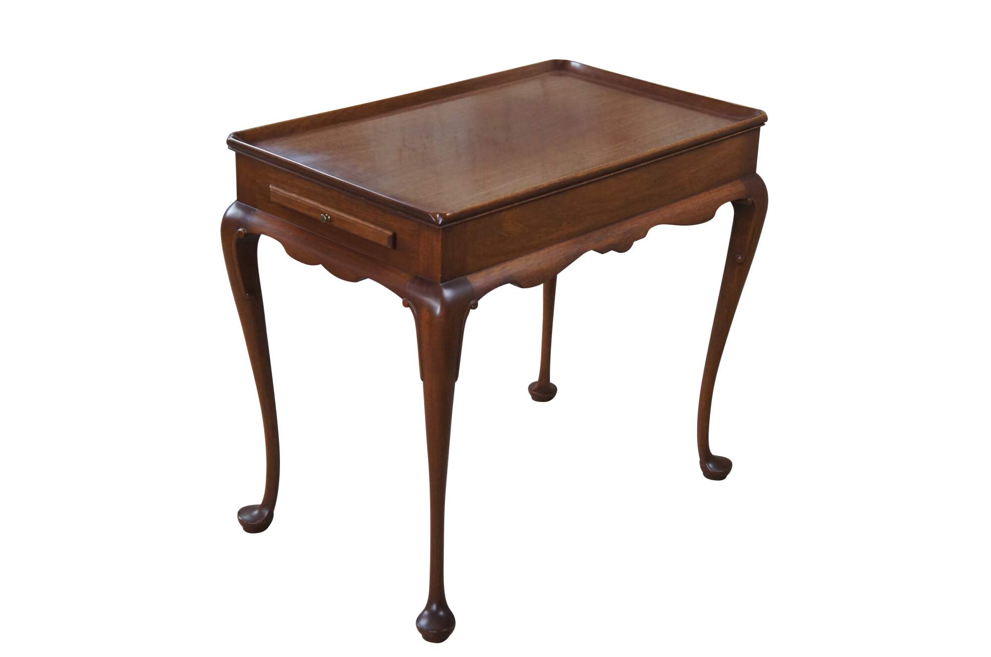 Biggs Furniture Queen Anne style tea table, circa last half 20th century. Made from mahogany with an inset top, serpentine scalloped skirt and cabriole legs leading paw feet. Originally Purchased from William W. Sauer Associates Ltd. Virginia Beach, VA in 1997.