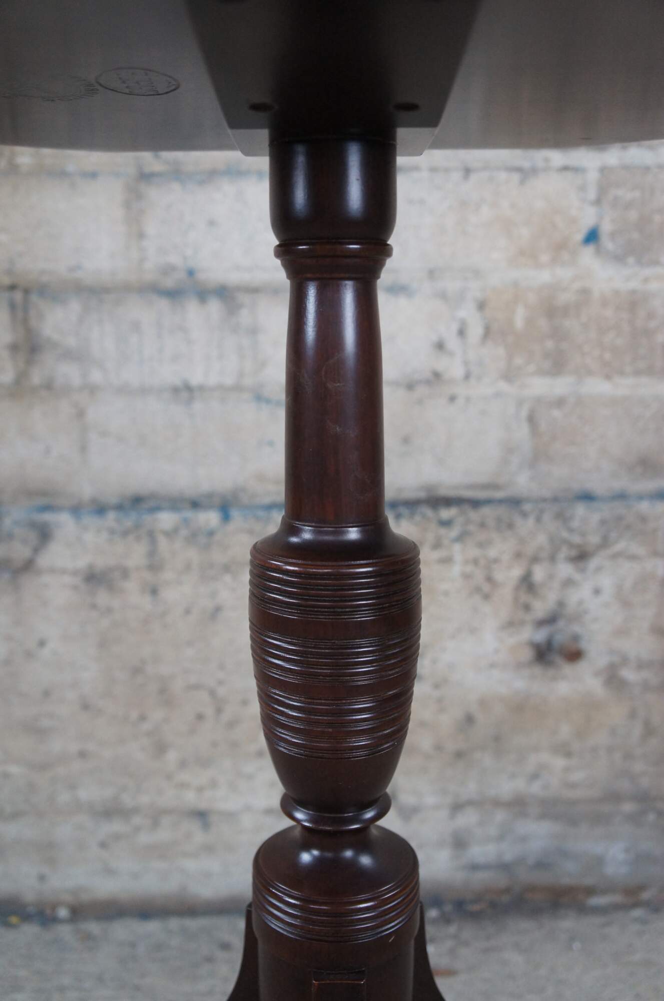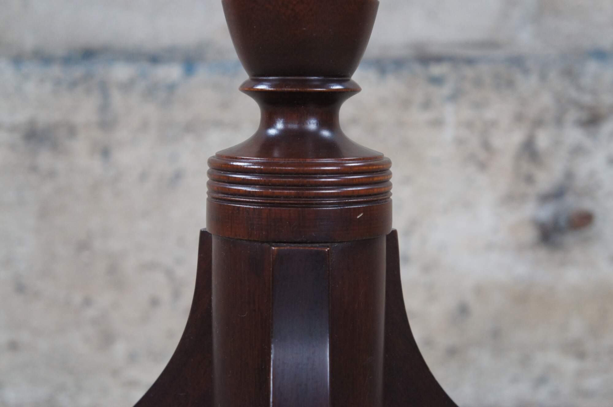 Biggs Furniture Old Sturbridge Village Collection Federal Candle or Sculpture Stand, circa last half 20th century. Made from mahogany with an Octagonal inlaid and crossbanded top over turned and ribbed center support leading to spider leg base. Table is marked along underside.