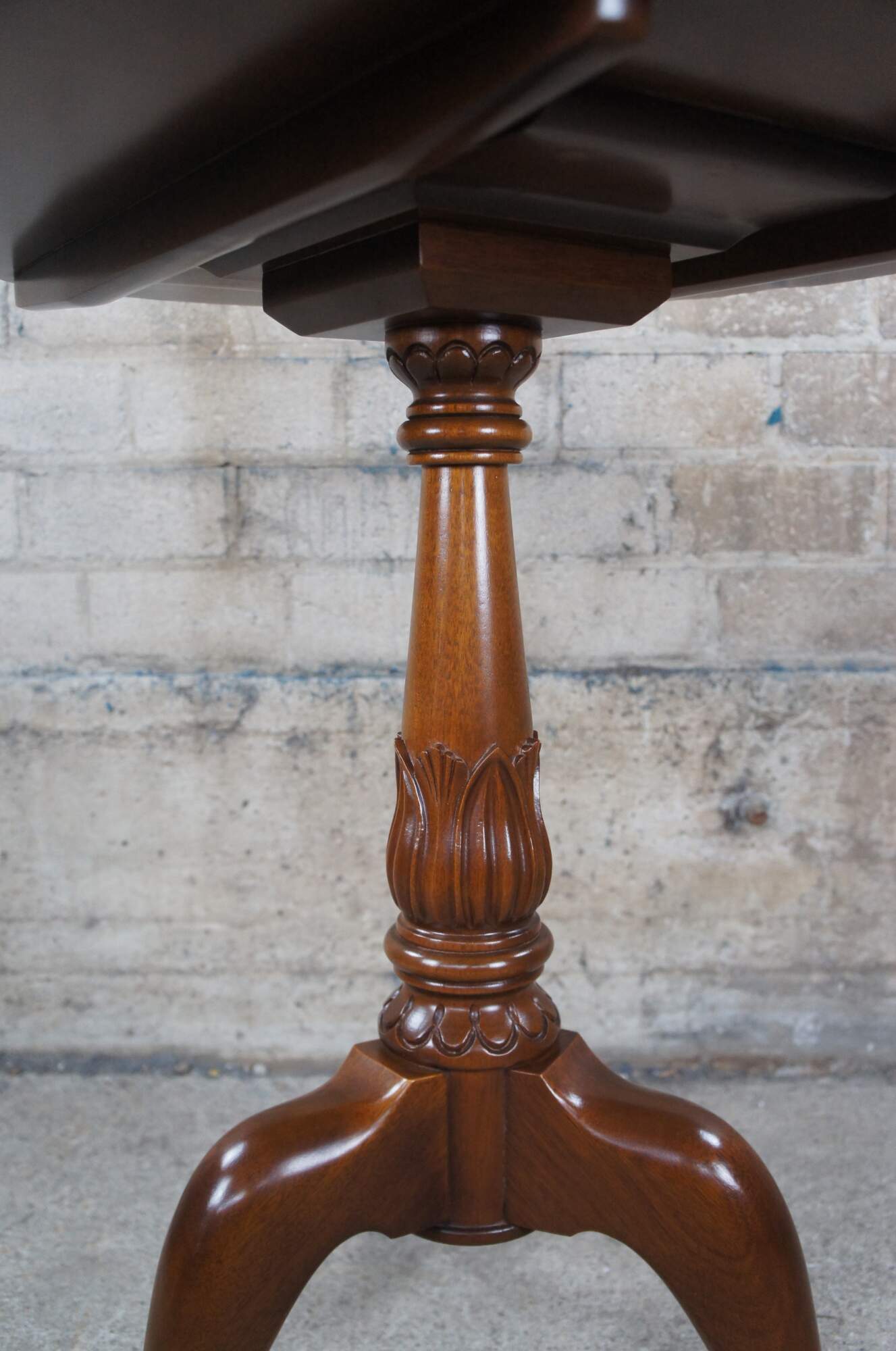 A large Chippendale style scalloped Pie Crust table, circa last quarter 20th century. Made from solid mahogany in the Jefferson Finish. Originally Purchased from William W. Sauer Associates Ltd. Bethesda, MD in 1982. the scalloped top is supported by a conical shaft reminiscent of Newport, Rhode Island design with carved acanthus accents over a tripod base with downswept legs leading to ball and claw feet.