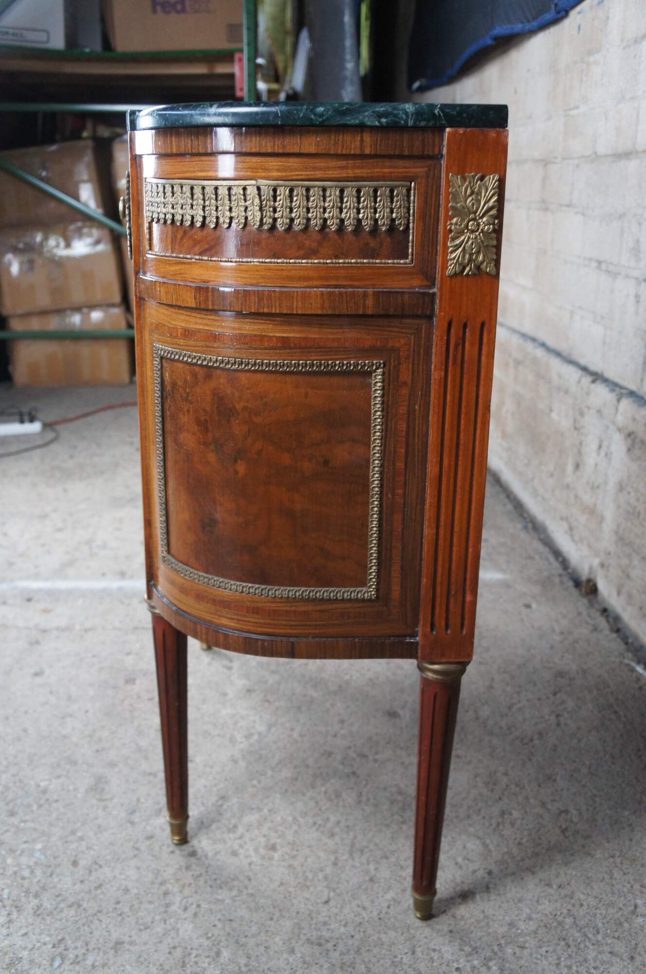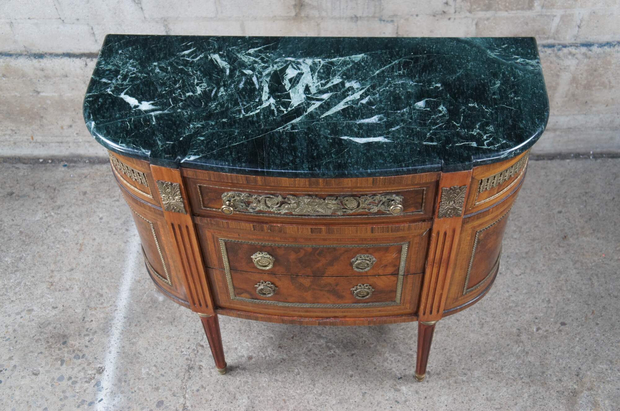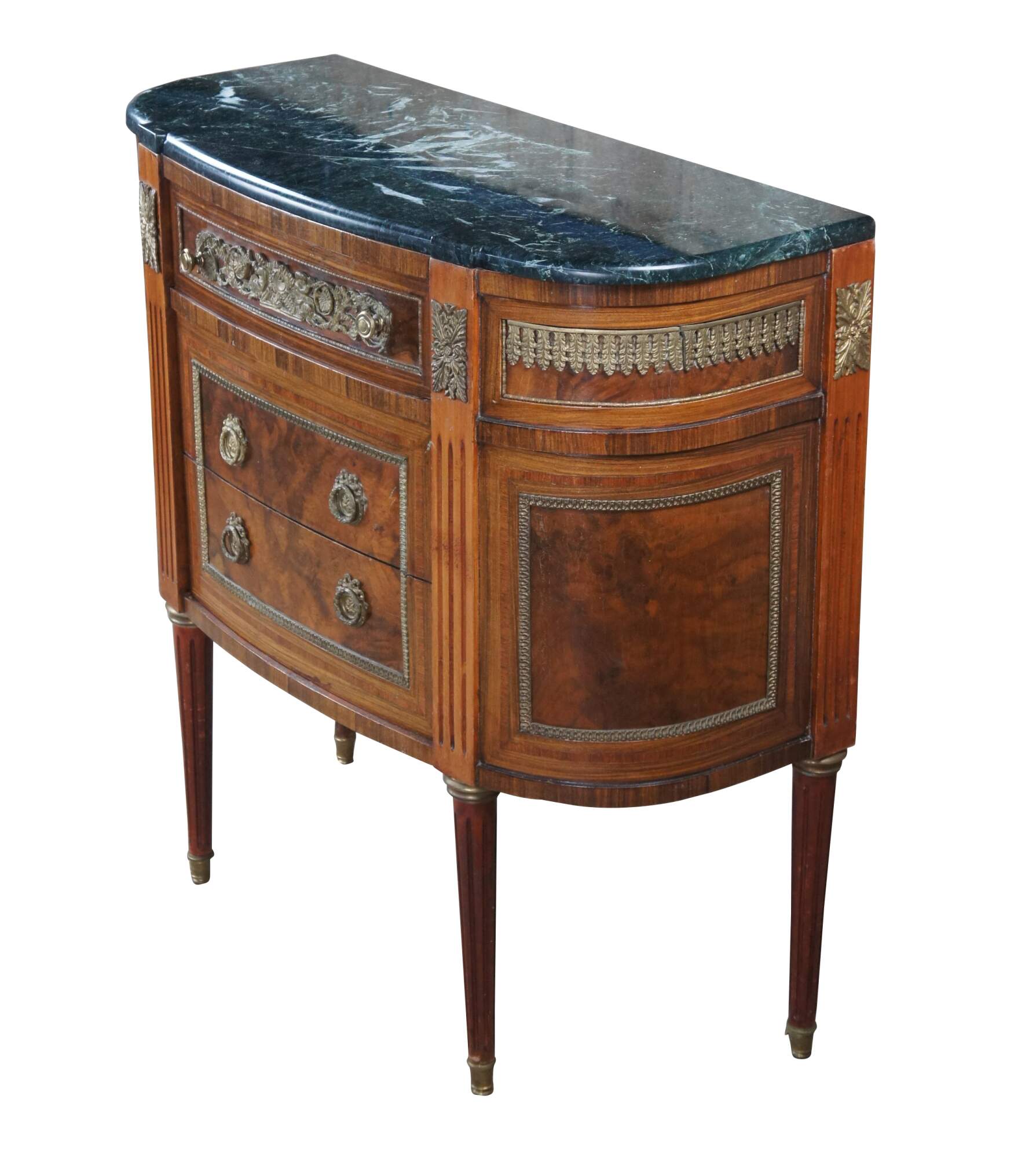 Vintage French Louis XVI style commode, dresser or console, circa 1970s. Made of mahogany featuring half round demilune form with ornate brass trim, notched marble top, three drawers, fluted accents and tapered legs capped with brass feet. Made in Egypt.
