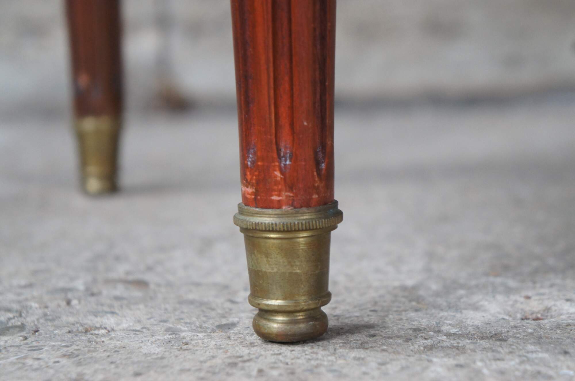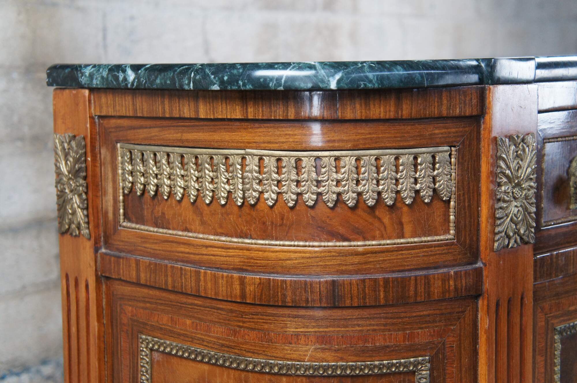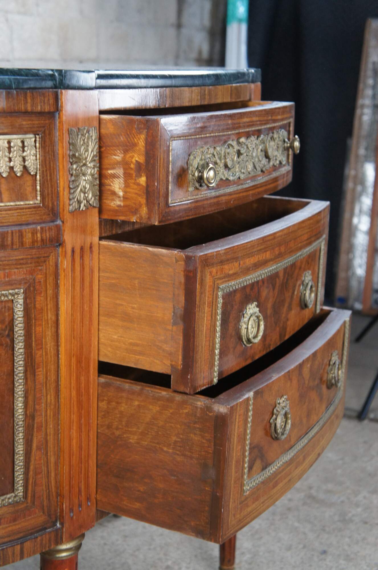 Vintage French Louis XVI style commode, dresser or console, circa 1970s. Made of mahogany featuring half round demilune form with ornate brass trim, notched marble top, three drawers, fluted accents and tapered legs capped with brass feet. Made in Egypt.