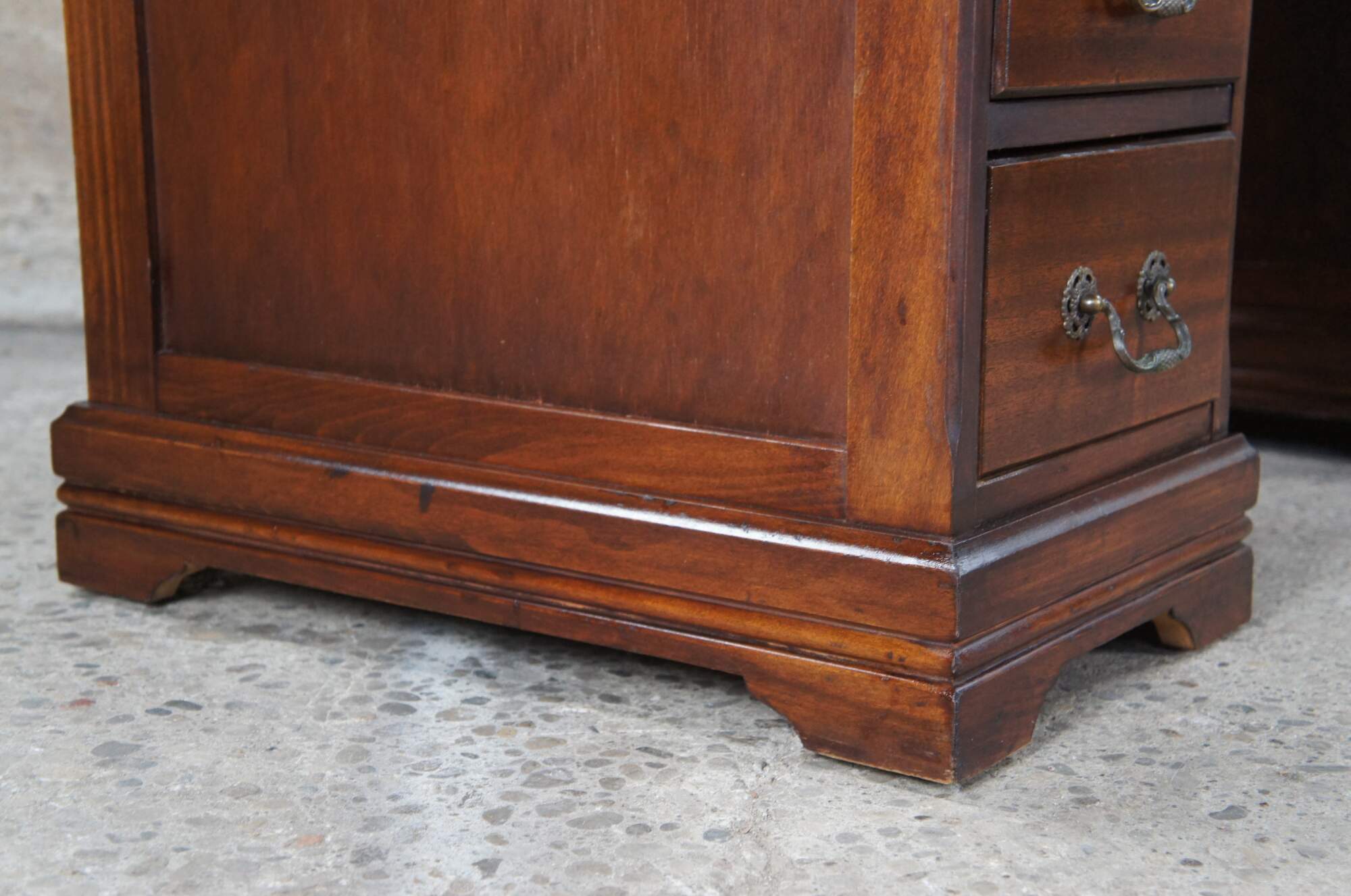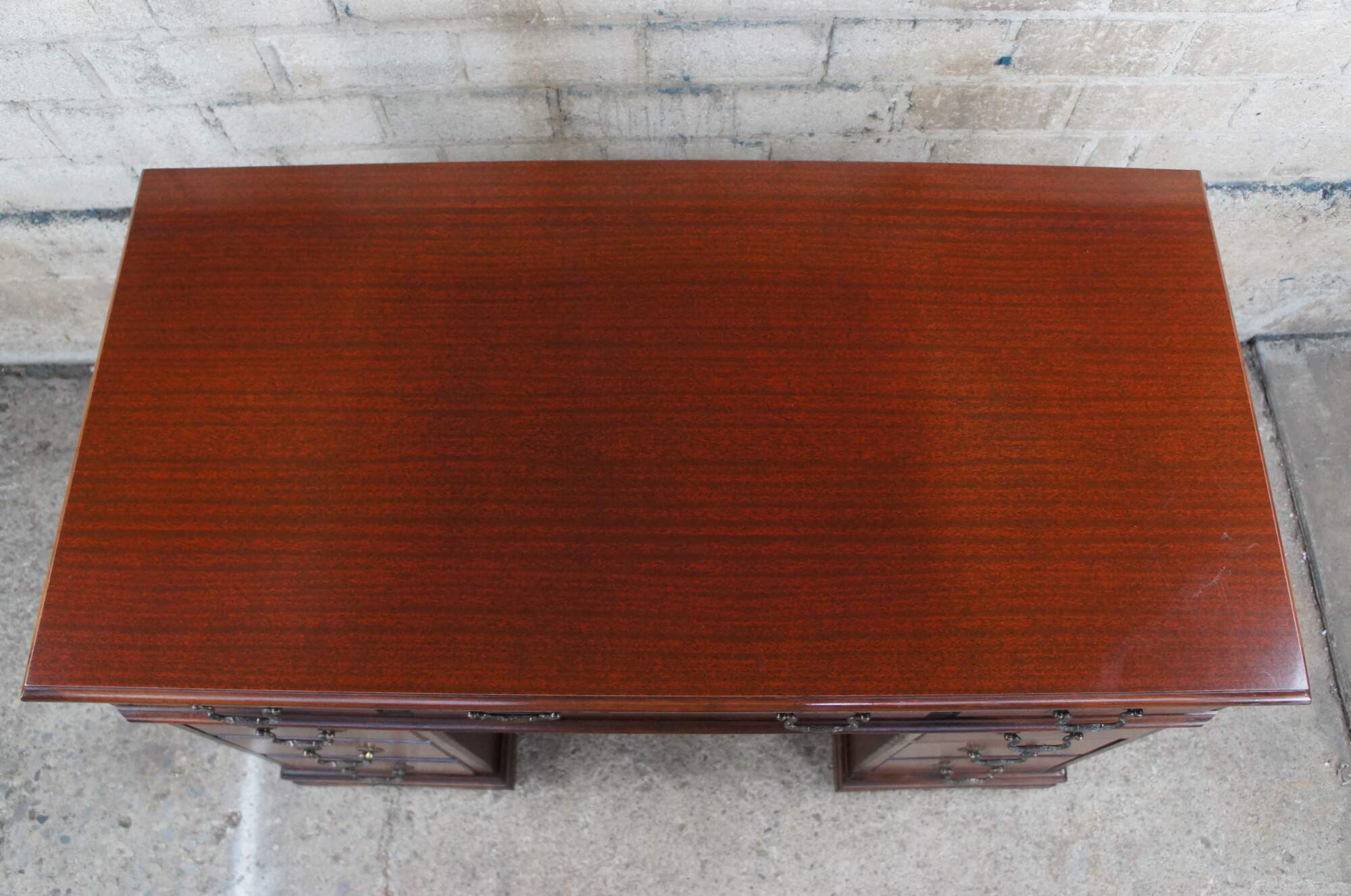 Antique Chippendale style kneehole writing desk featuring rectangular form with eight drawers, bracket feet, and brass hardware.