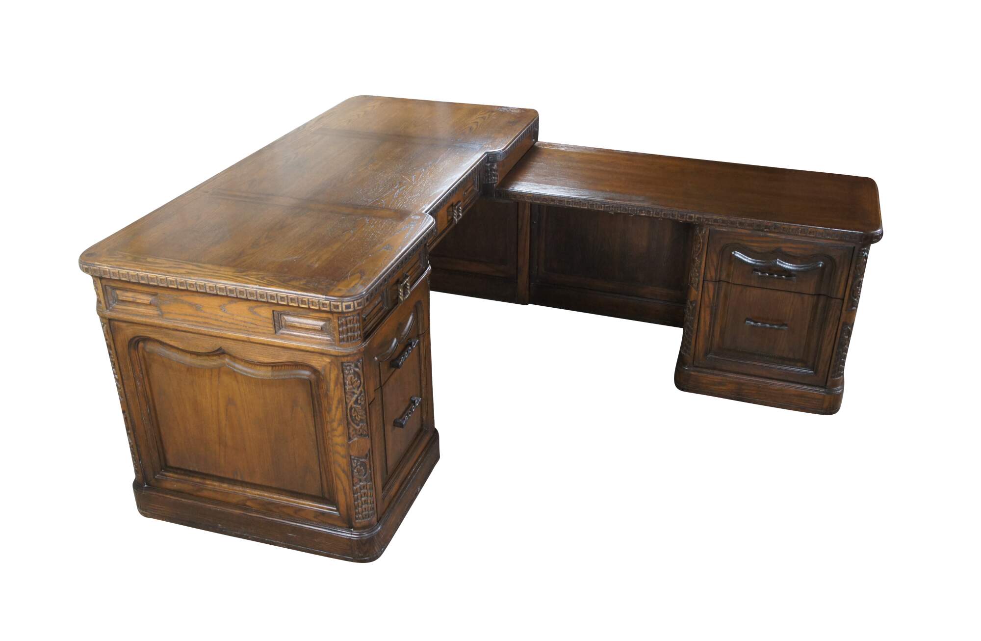 Romweber (R-10962) secretary's Desk (Right Hand), circa 1974. Features an L shaped carved oak frame with shapely Nordic inspired moldings, grapevine motif, tooled pillars and floral embellishments. Features six dovetailed drawers. Bottom drawer of desk is a three way Pen-Da-Flex file for regular, legal size, and data. Center drawer has two dividers, Knee-Hole drawer has pencil tray. Desk return bottom drawer is for regular Pen-da-Flex filing. Top drawer contains stationery comparment.s An iconic piece from the mid century era that is great for office, home or library use.