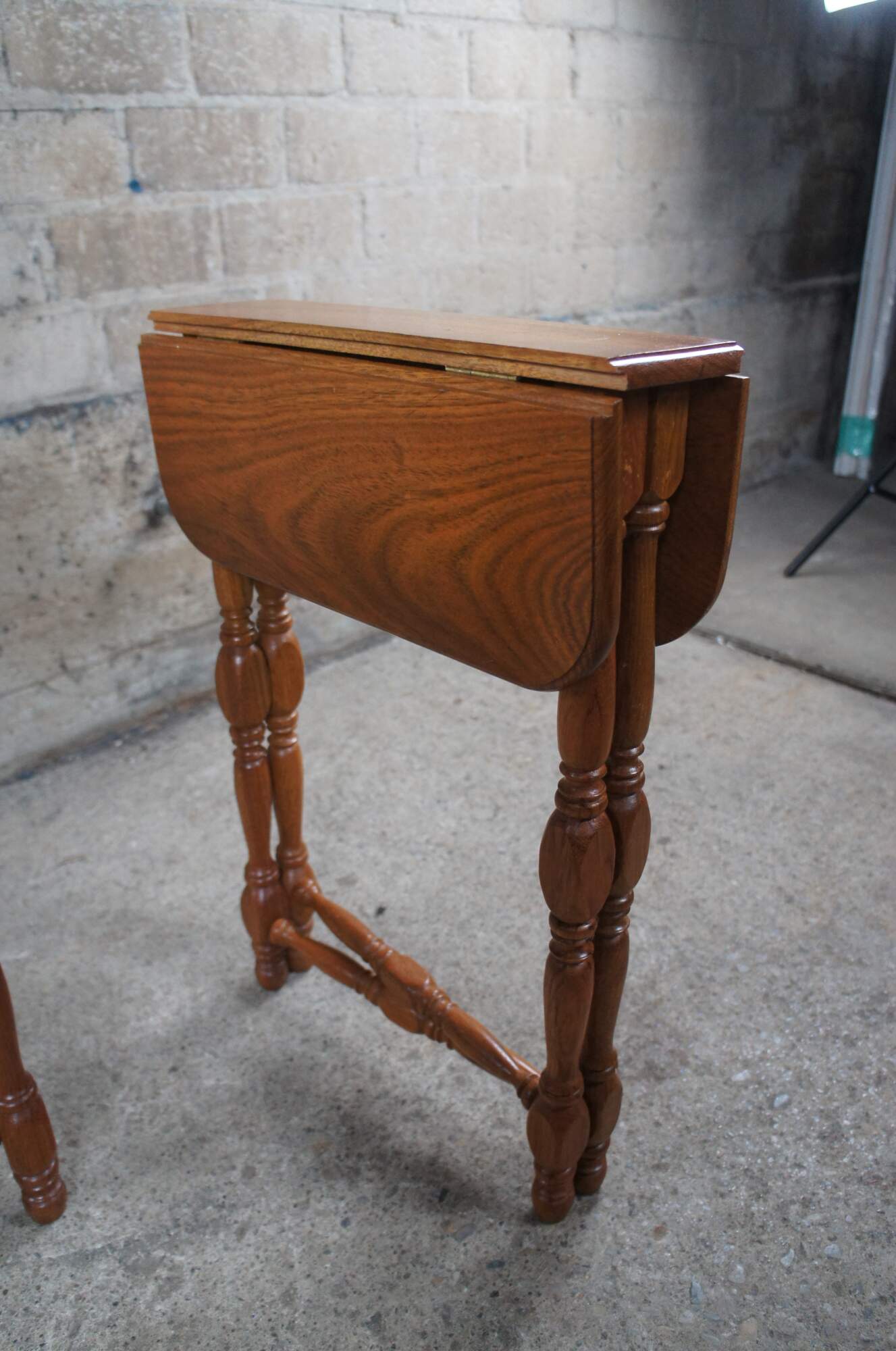 Intriguing set of farmhouse nesting tables. Made from oak with a carrier or larger side table that houses each of the four drop leaf nesting tables. Nesting tables. Features turned legs and X formed base when opened.