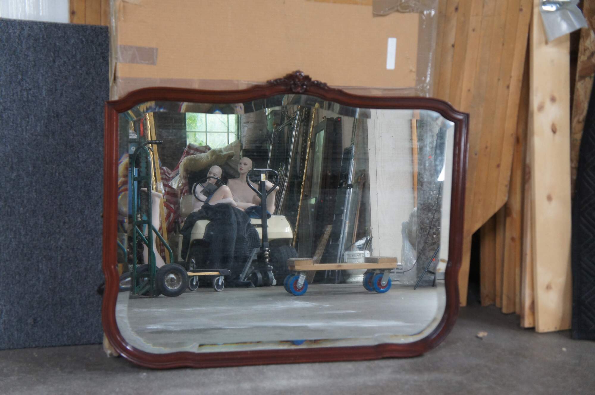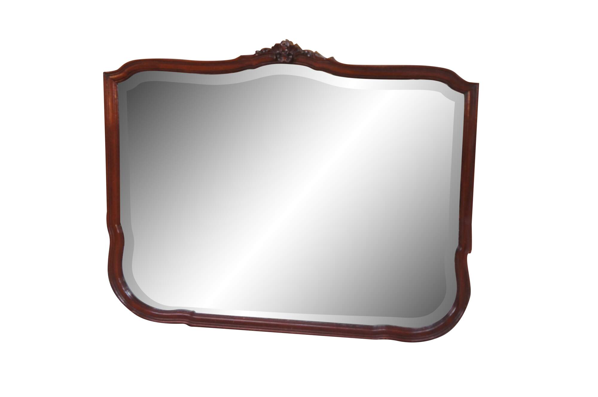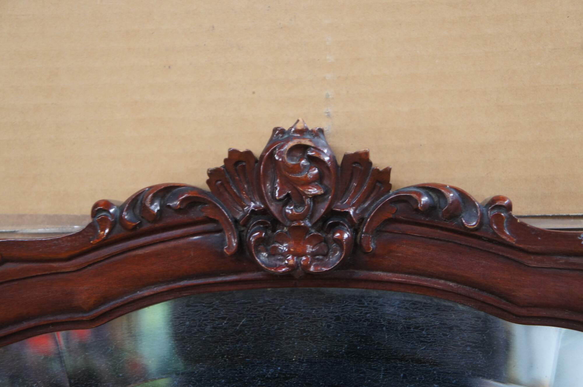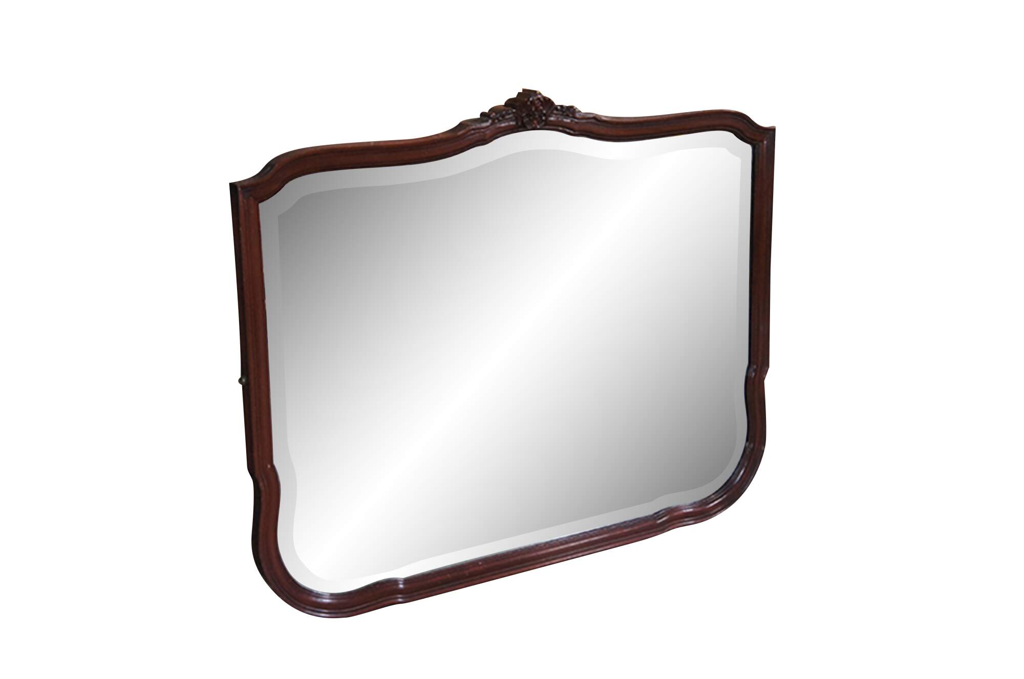 Antique late Victorian vanity dresser mirror. Made of mahogany featuring serpentine form with foliate crown and bevelled mirror.