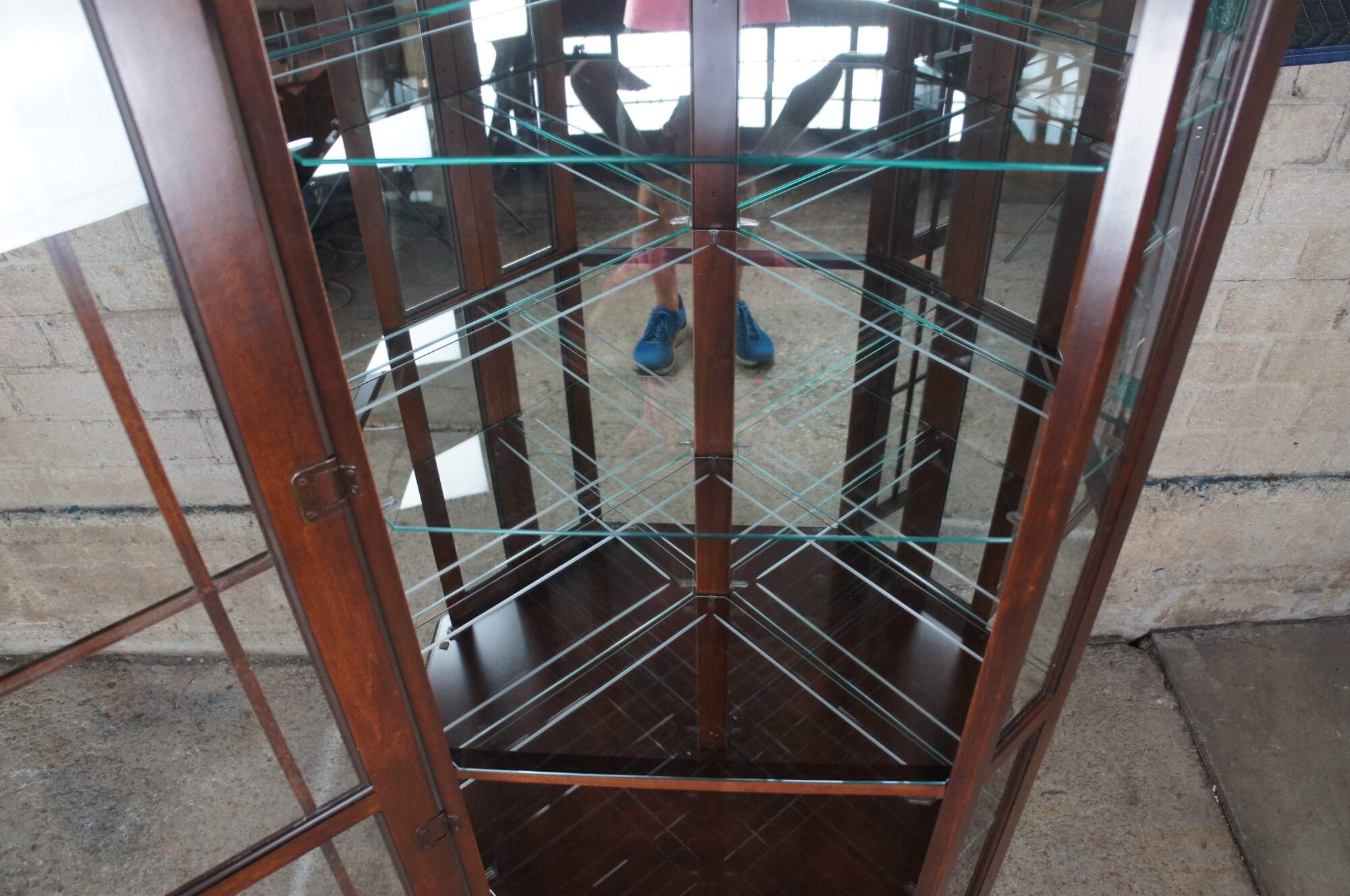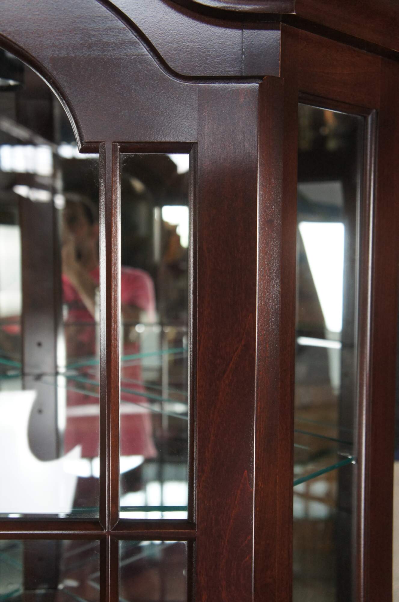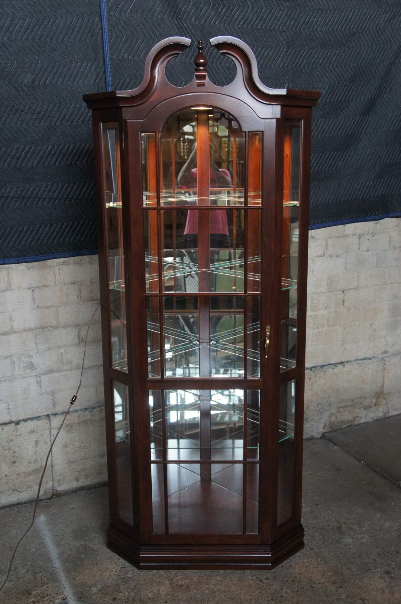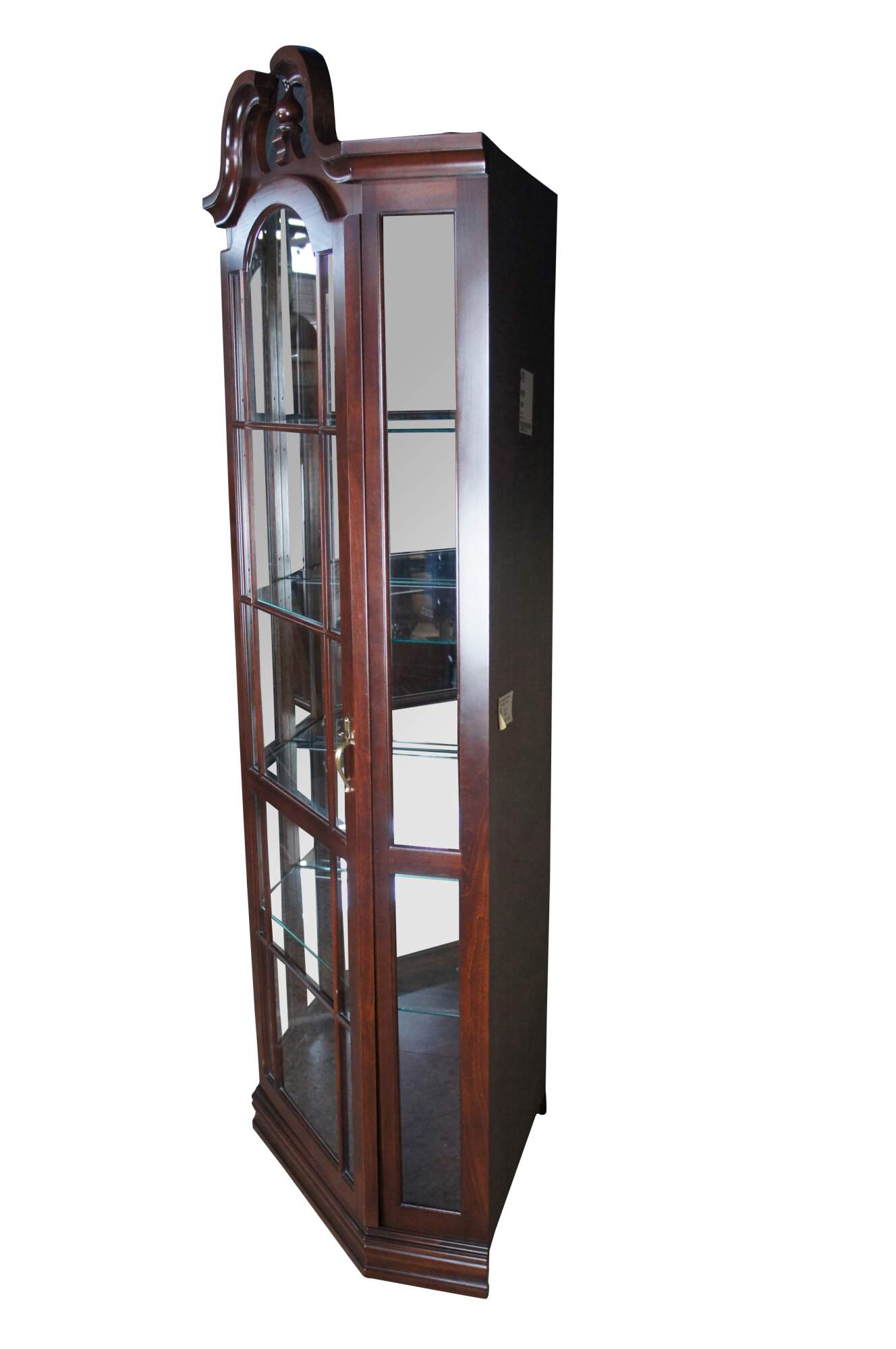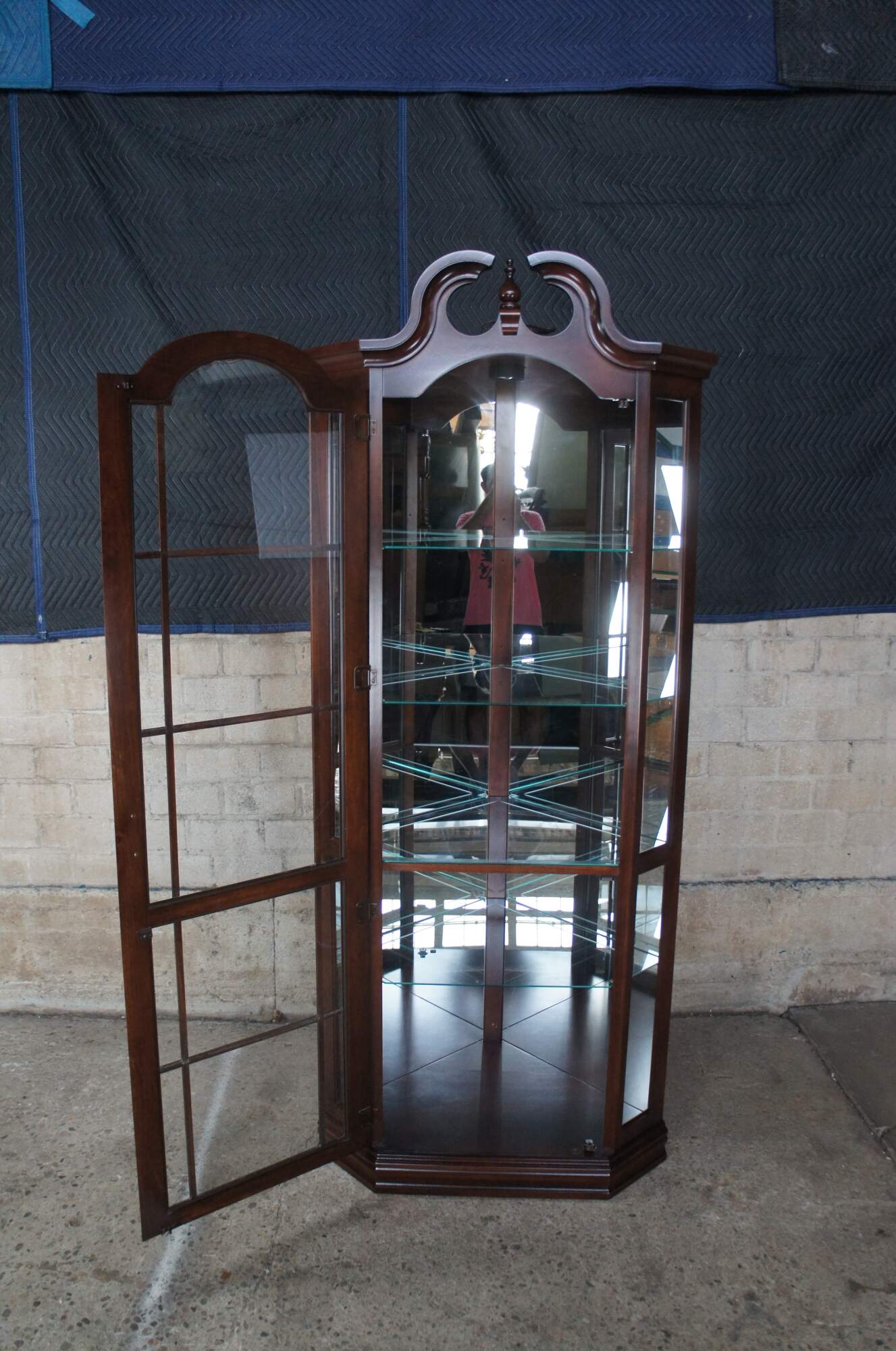 Philip Reinisch Queen Anne style corner display cabinet, circa 1990s. Made from cherry with an open pediment and lattice front. Opens to four adjustable glass shelves with plate grooves.