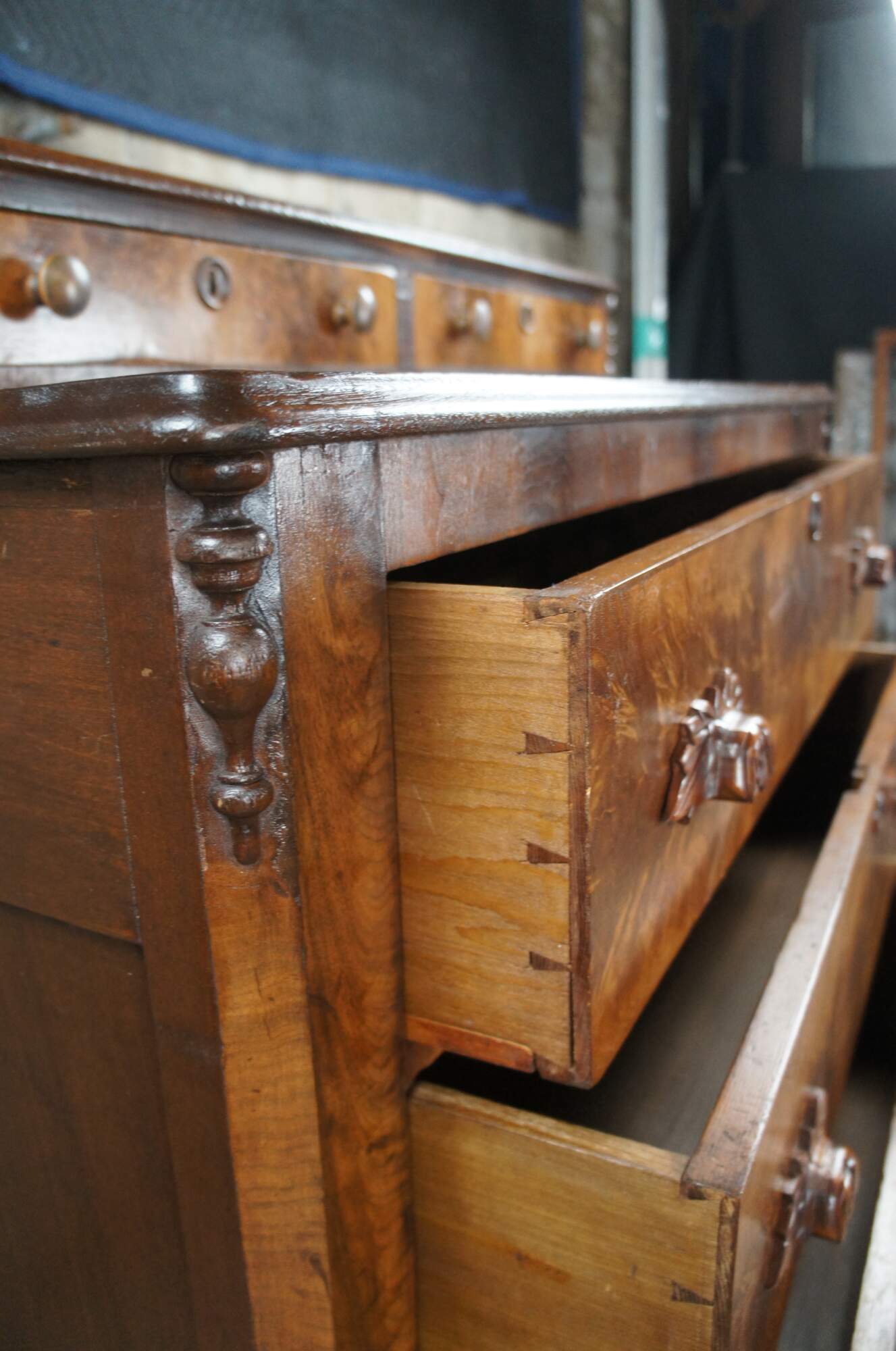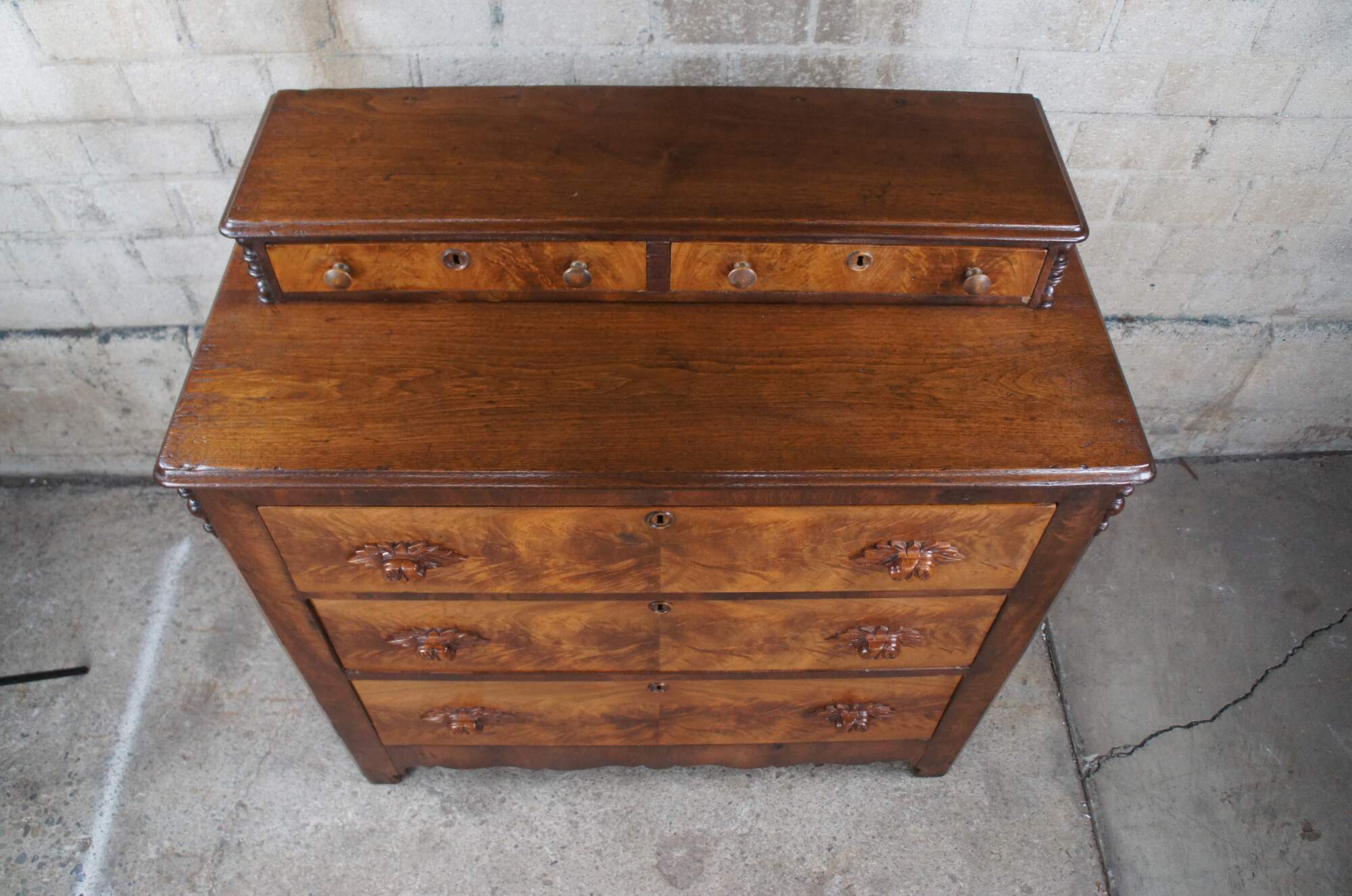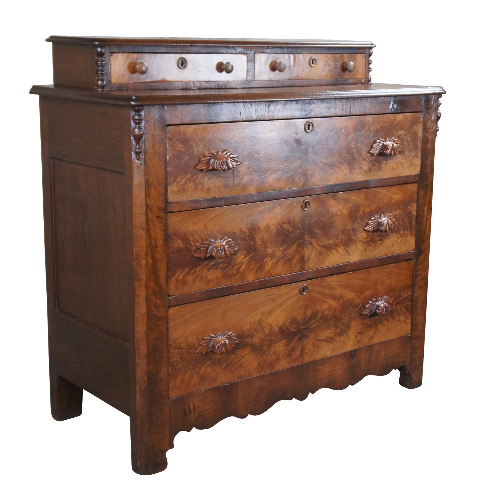 A beautiful antique American Victorian era stepback dresser, circa 1870s. Made from poplar and walnut with three hand dovetailed standard drawers below two upper glovebox drawers. Features crotch walnut veneer along drawer fronts, hand carved fruit and nut pulls and raised key escutcheons. The edges of the chest are chamfered and accented by quarter cut spindles. The dresser is supported by straight legs and has a serpentine apron.