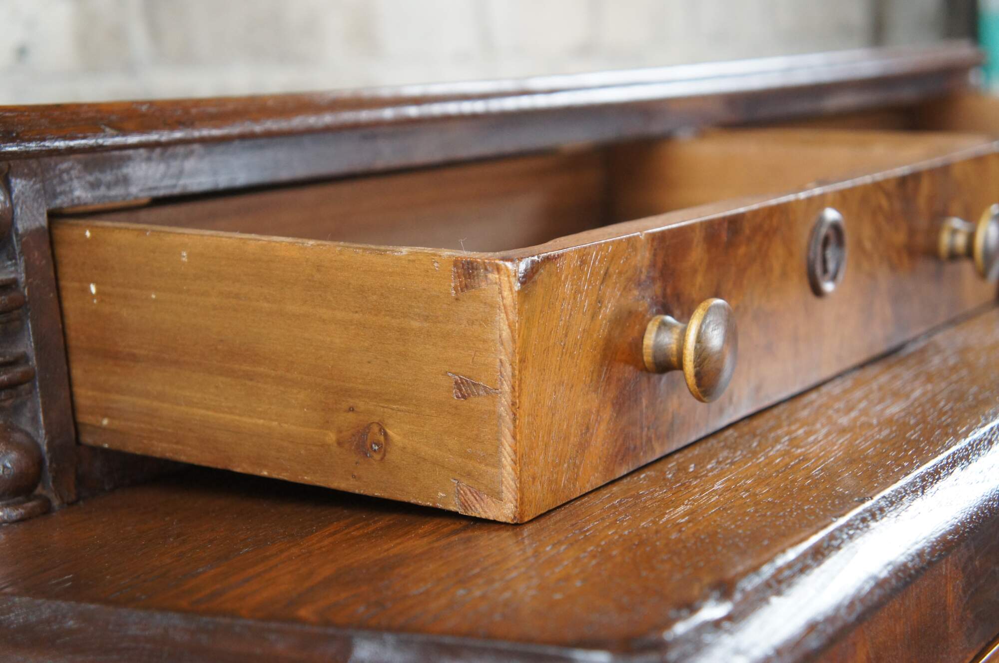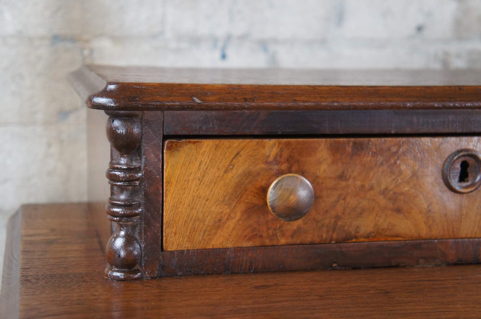 Good antique condition, wear and distressing commensurate with age and use. A few small veneer spots missing along front