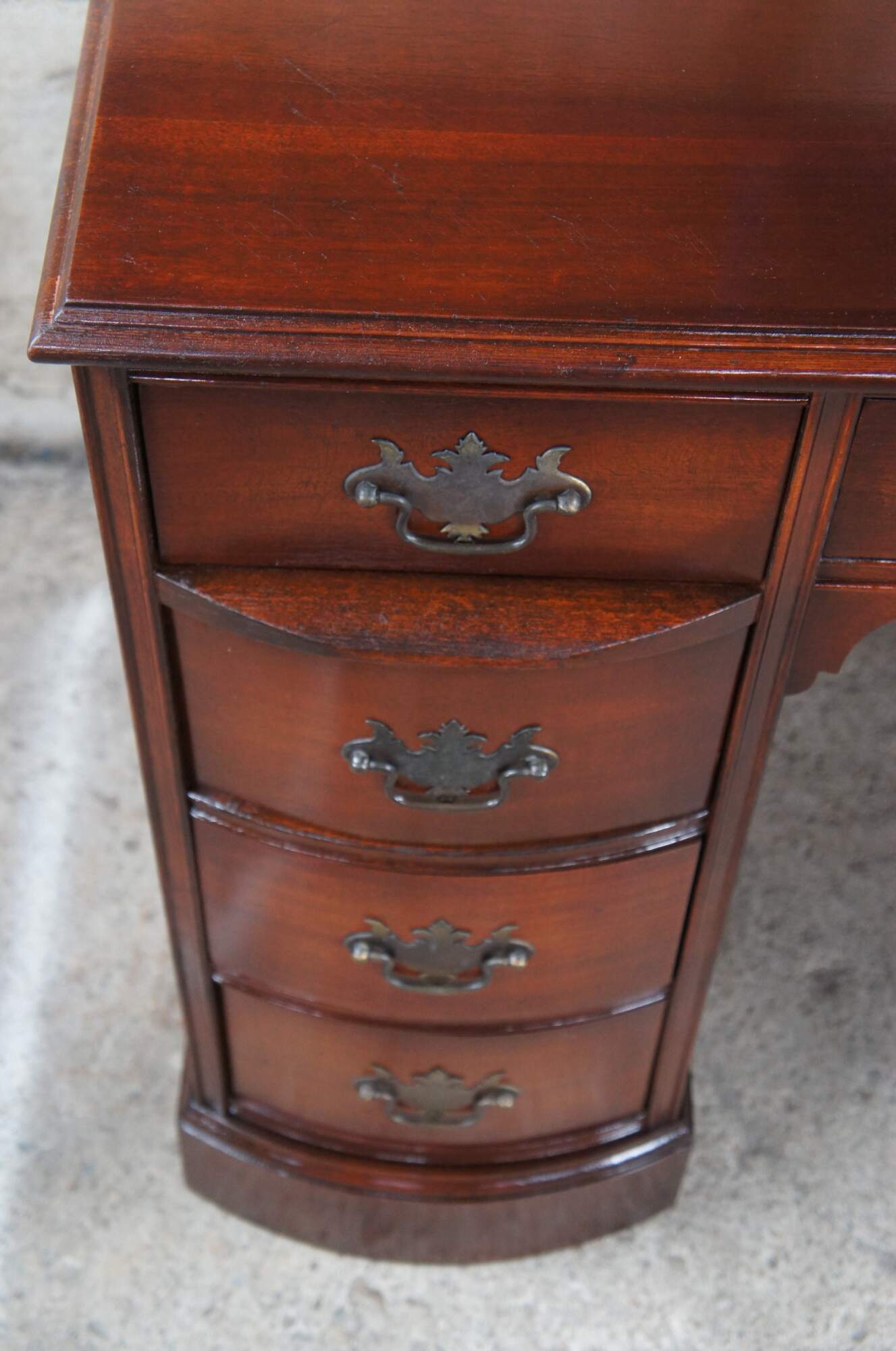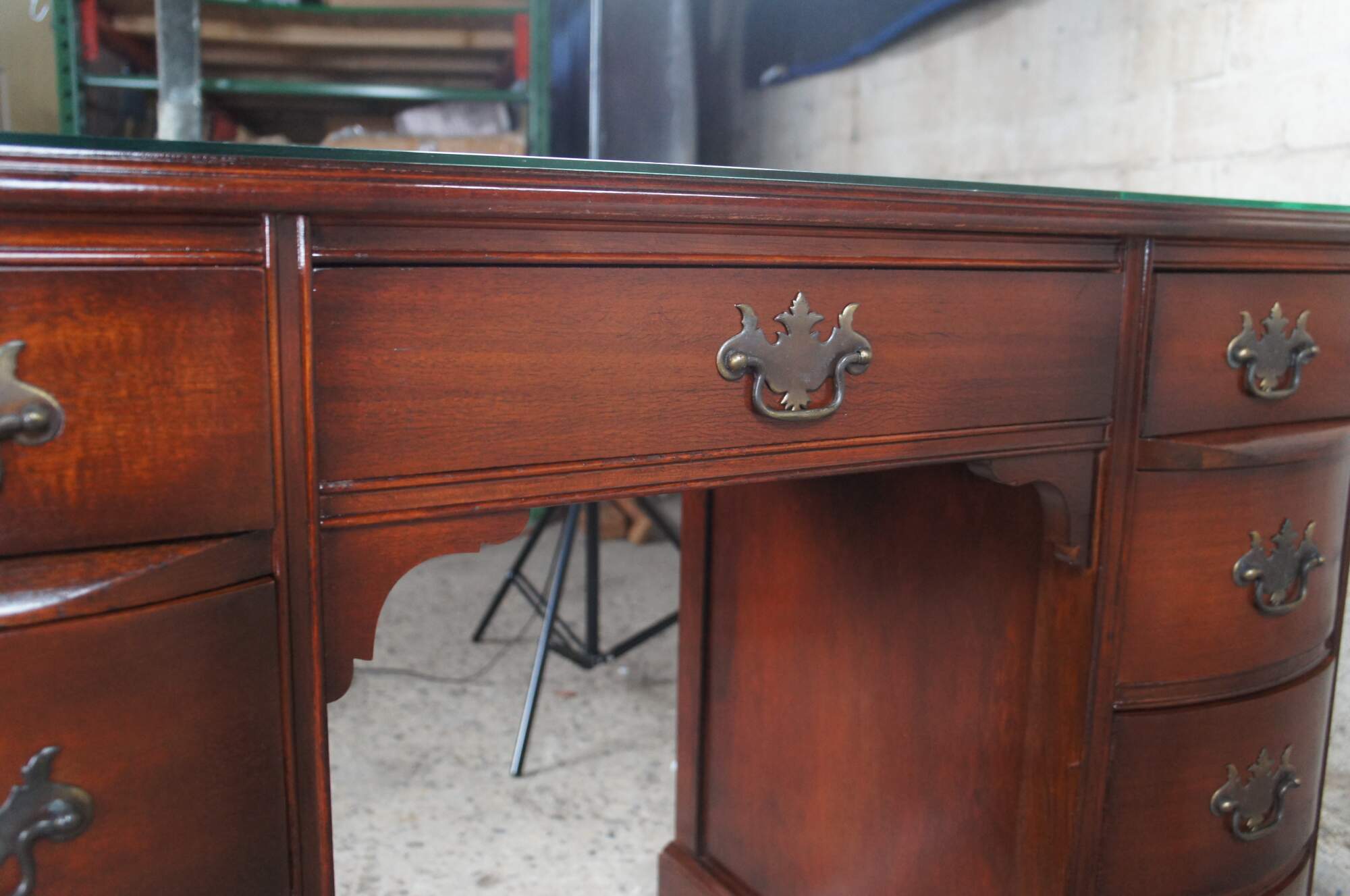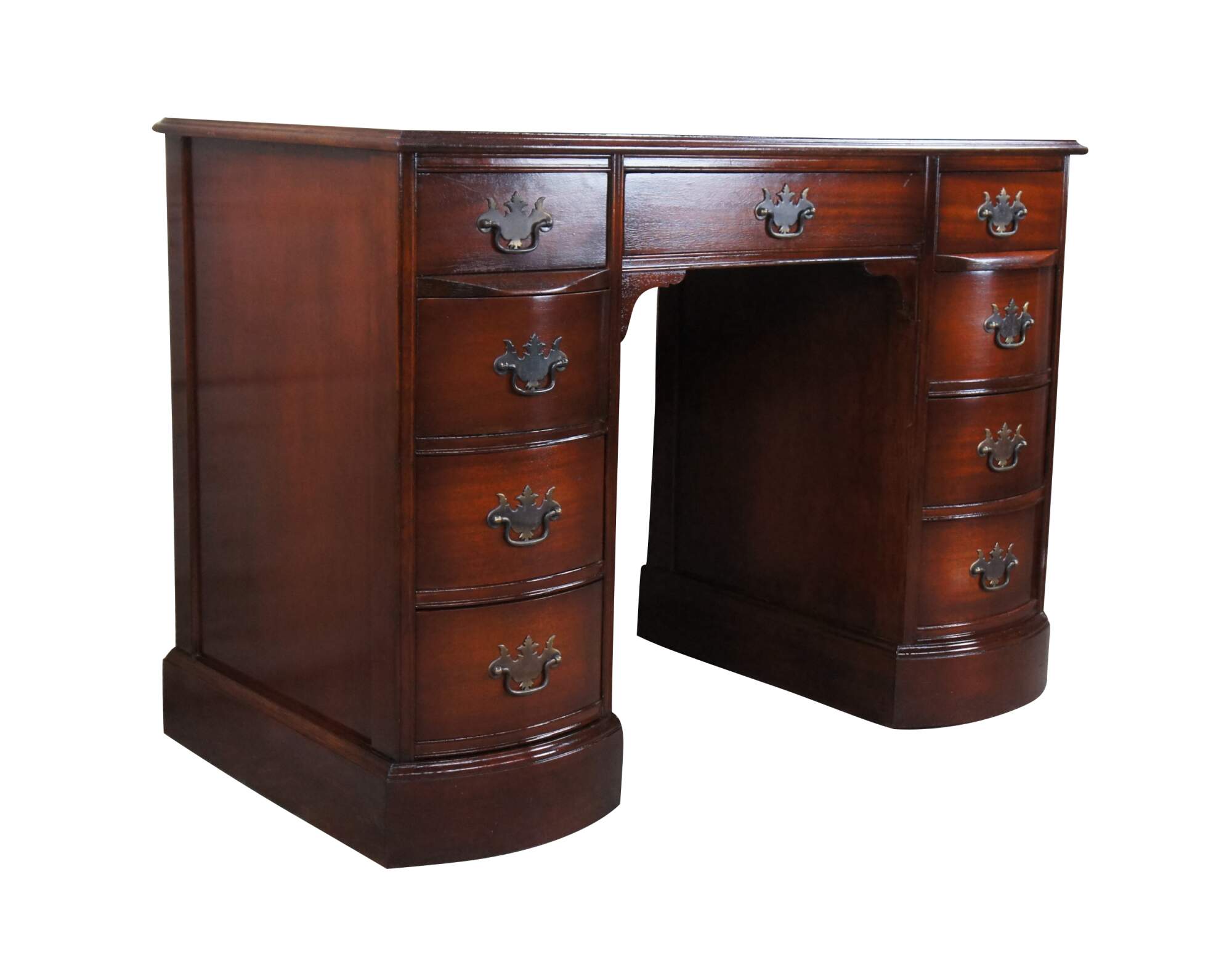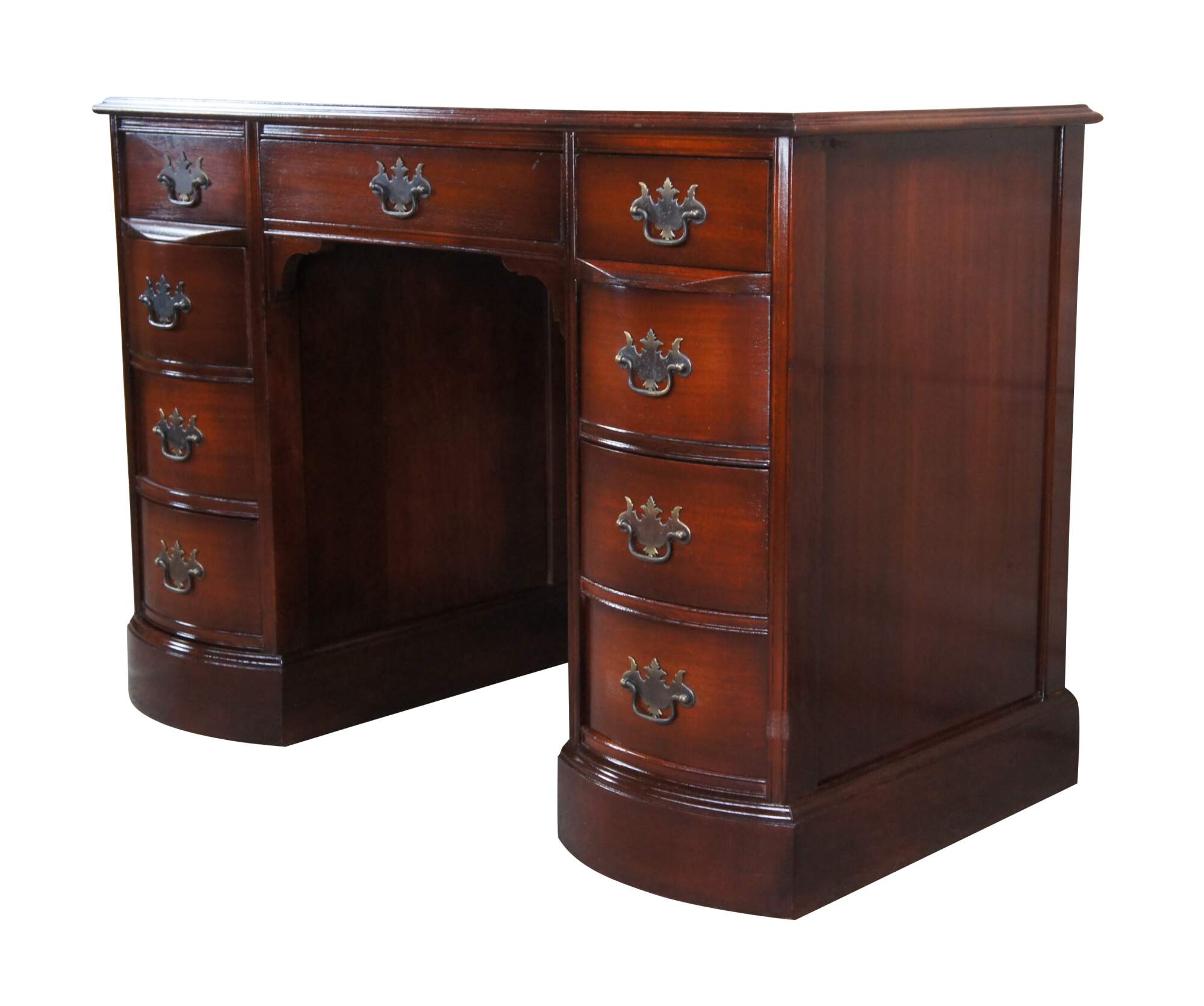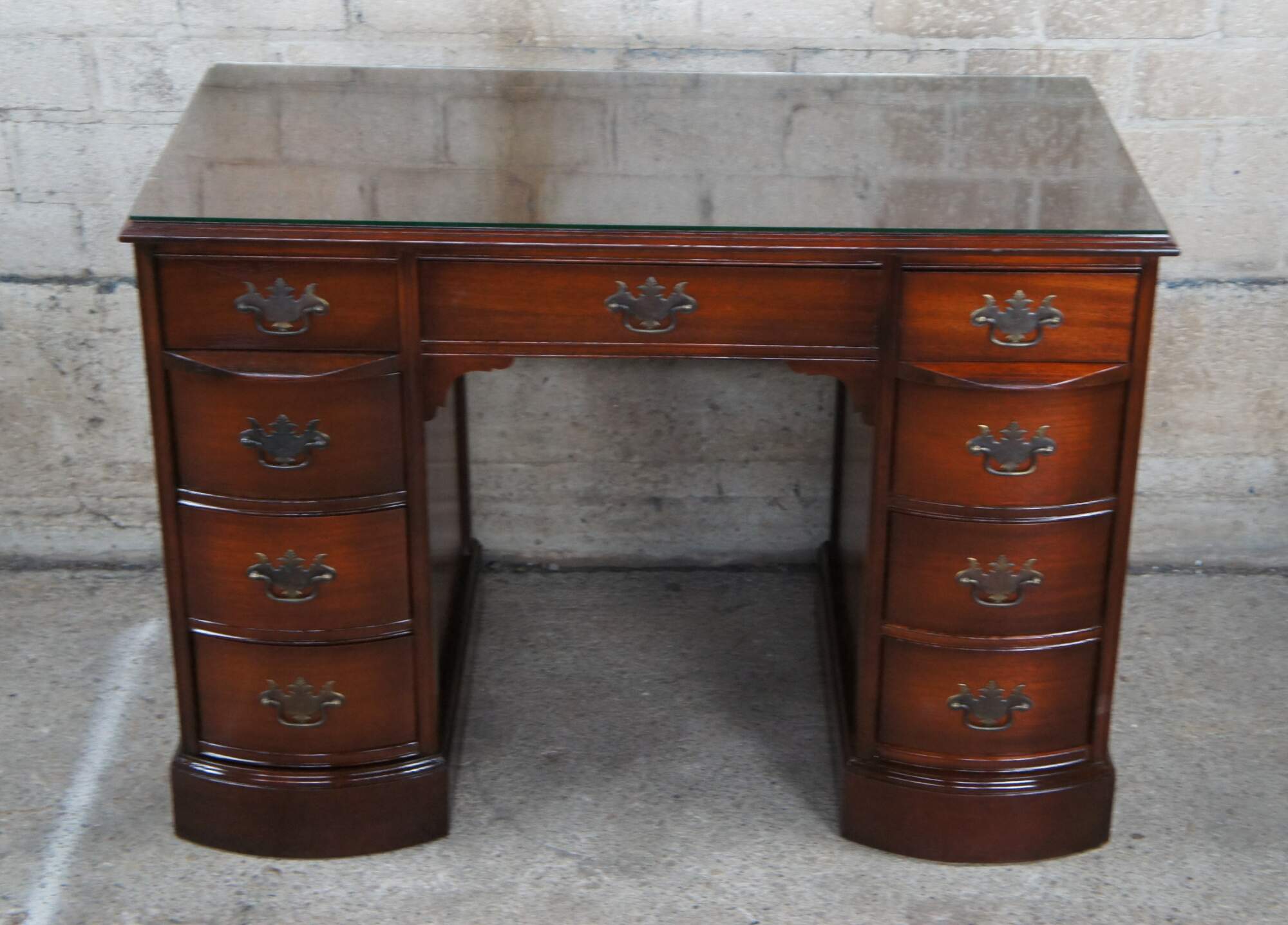 Antique Chippendale style kneehole writing desk featuring rectangular form with bowfront, eight drawers, brass batwing hardware and polished glass top. Originally purchased at the Rike Kumler Company in Dayton, Ohio. Marked via their tag along the underside 550 Kneehole Desk. Rikes was one of the largest departments stores when it opened, remaining in business until they were bough out by Lazarus.