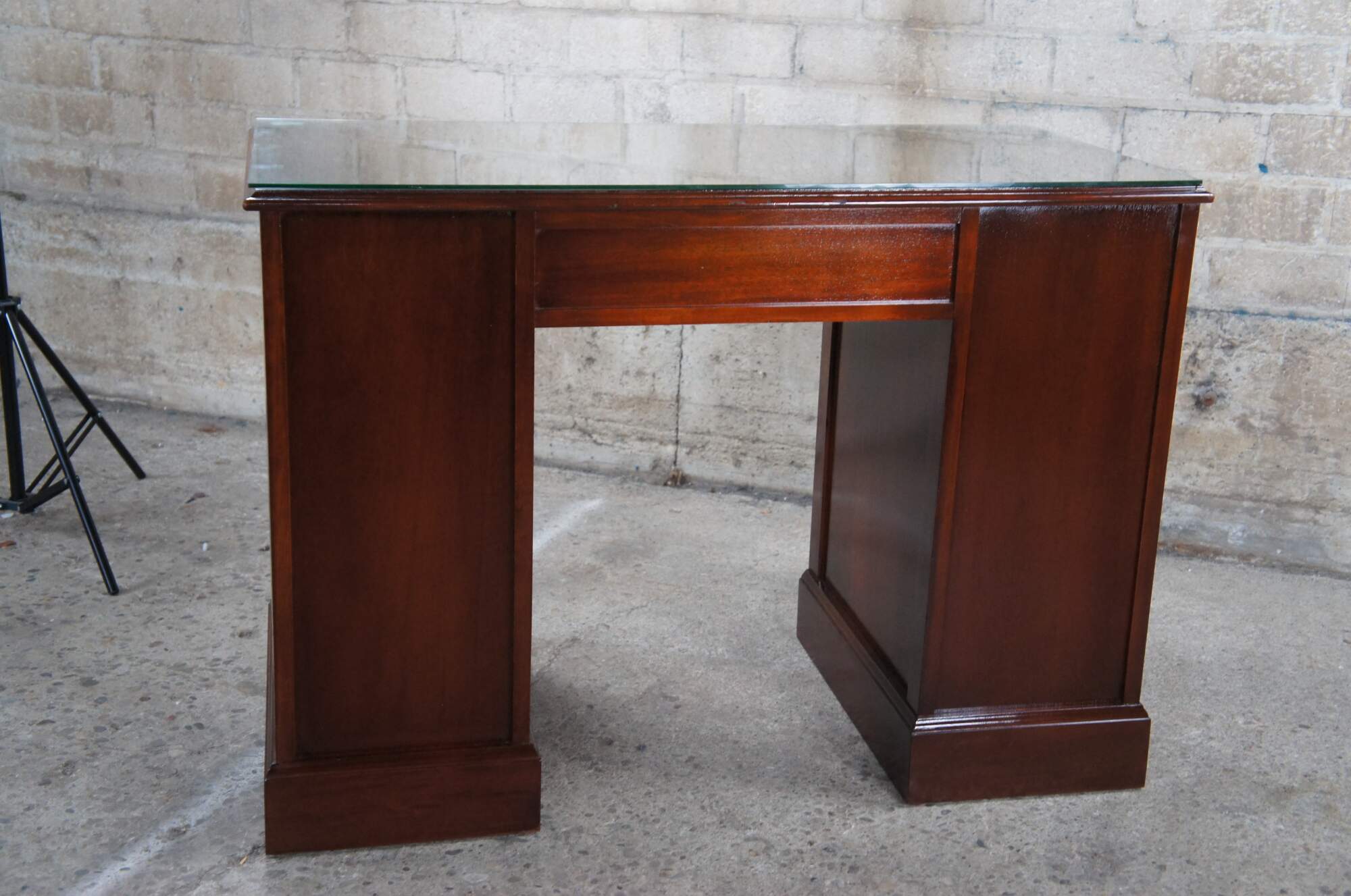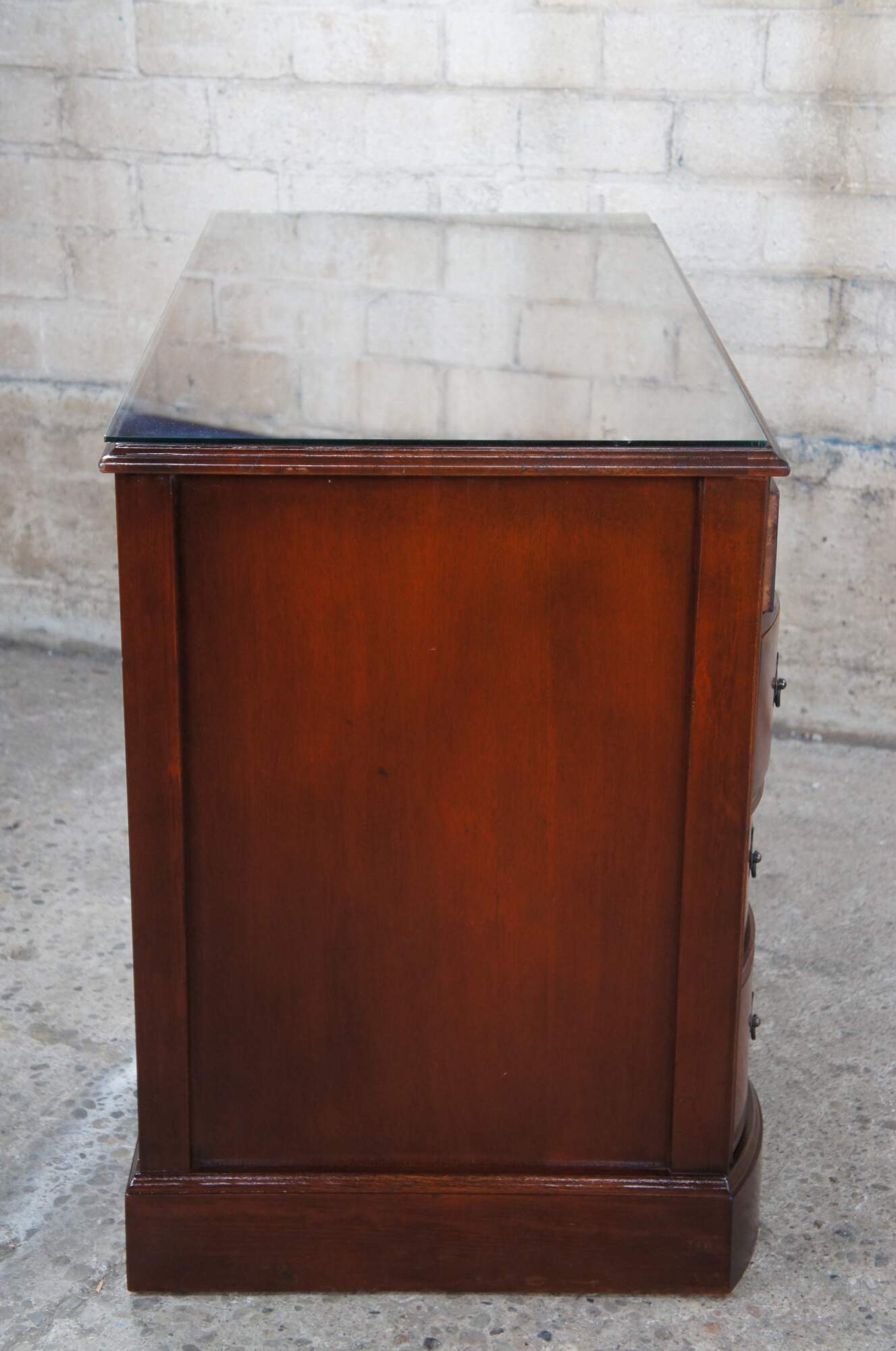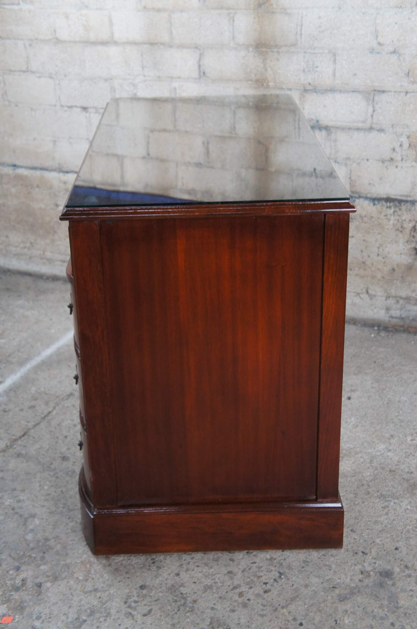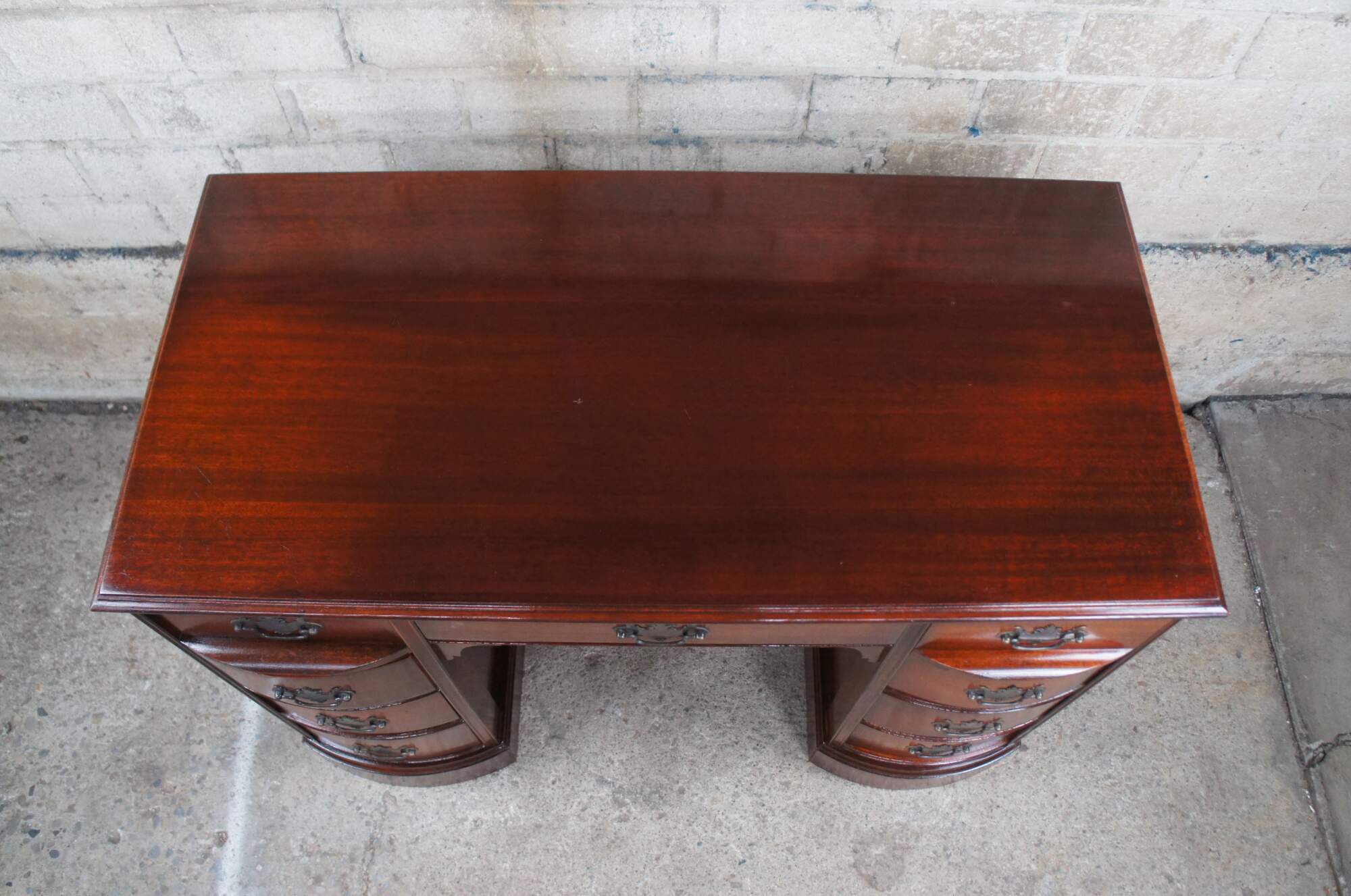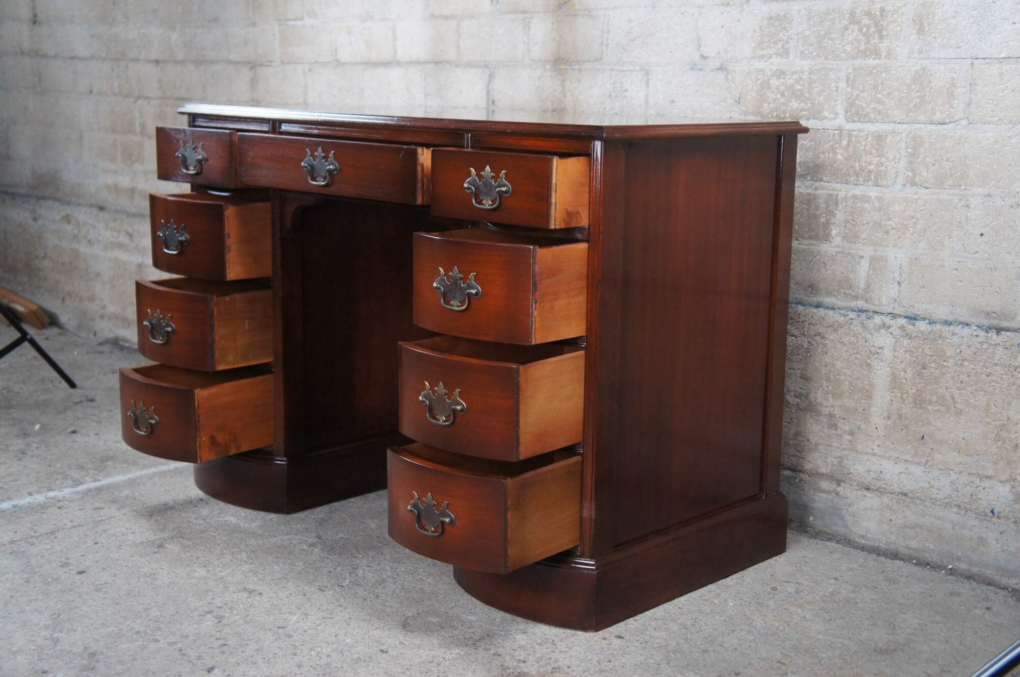Antique Chippendale style kneehole writing desk featuring rectangular form with bowfront, eight drawers, brass batwing hardware and polished glass top. Originally purchased at the Rike Kumler Company in Dayton, Ohio. Marked via their tag along the underside 550 Kneehole Desk. Rikes was one of the largest departments stores when it opened, remaining in business until they were bough out by Lazarus.