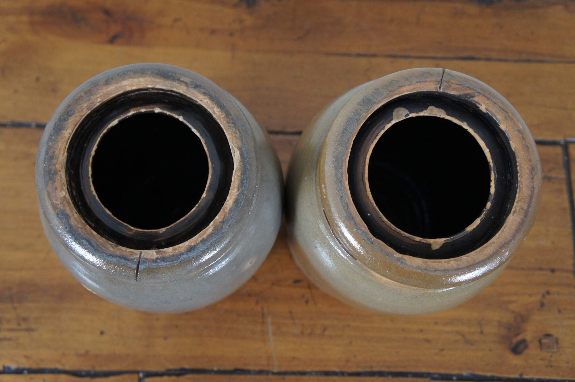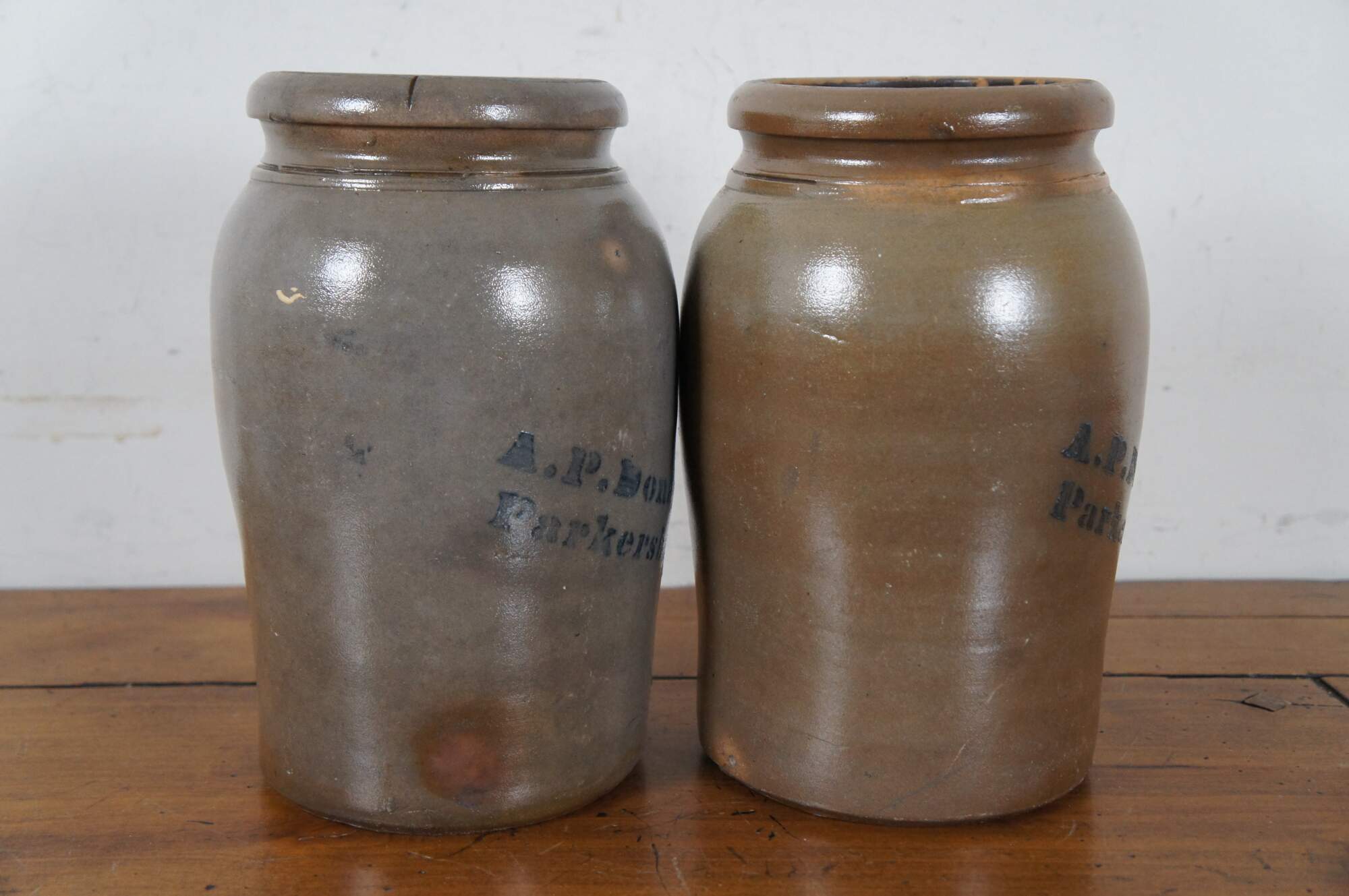Two mid to late 19th century salt glazed stoneware crocks / canning jars by A.P. Donaghho, Parkersburg, W. Va.