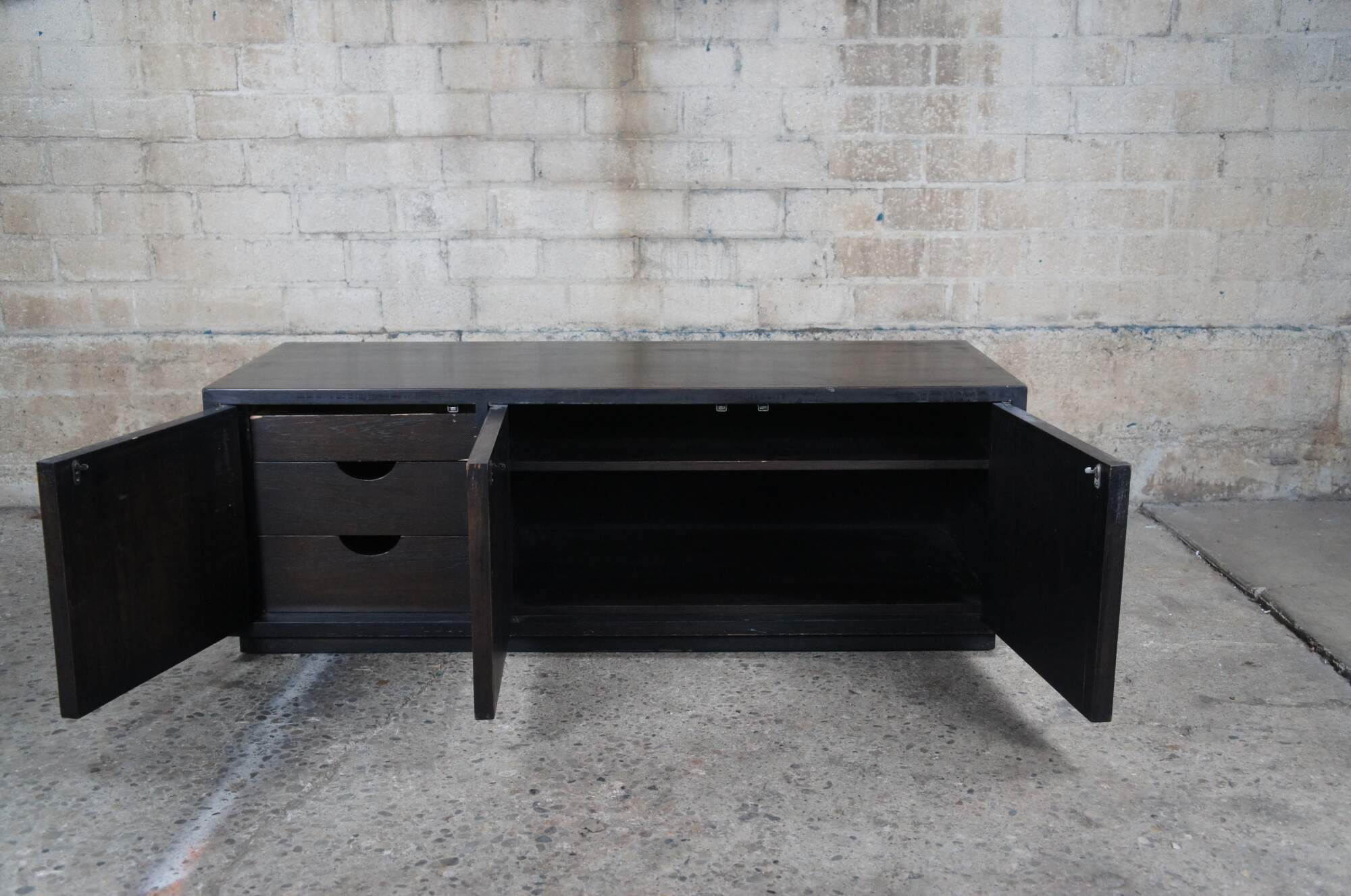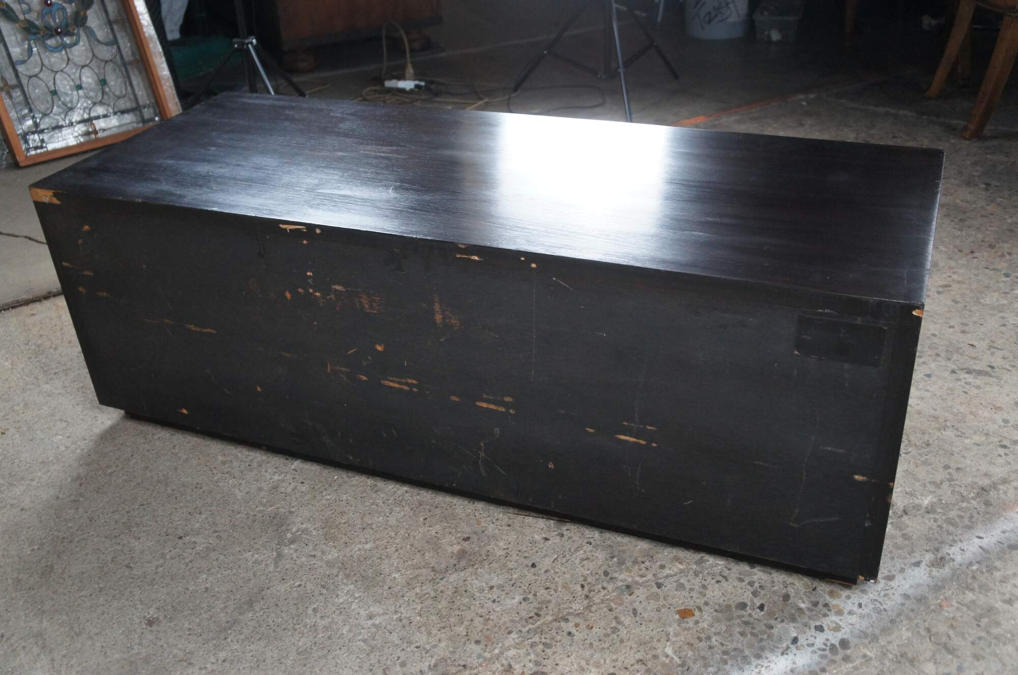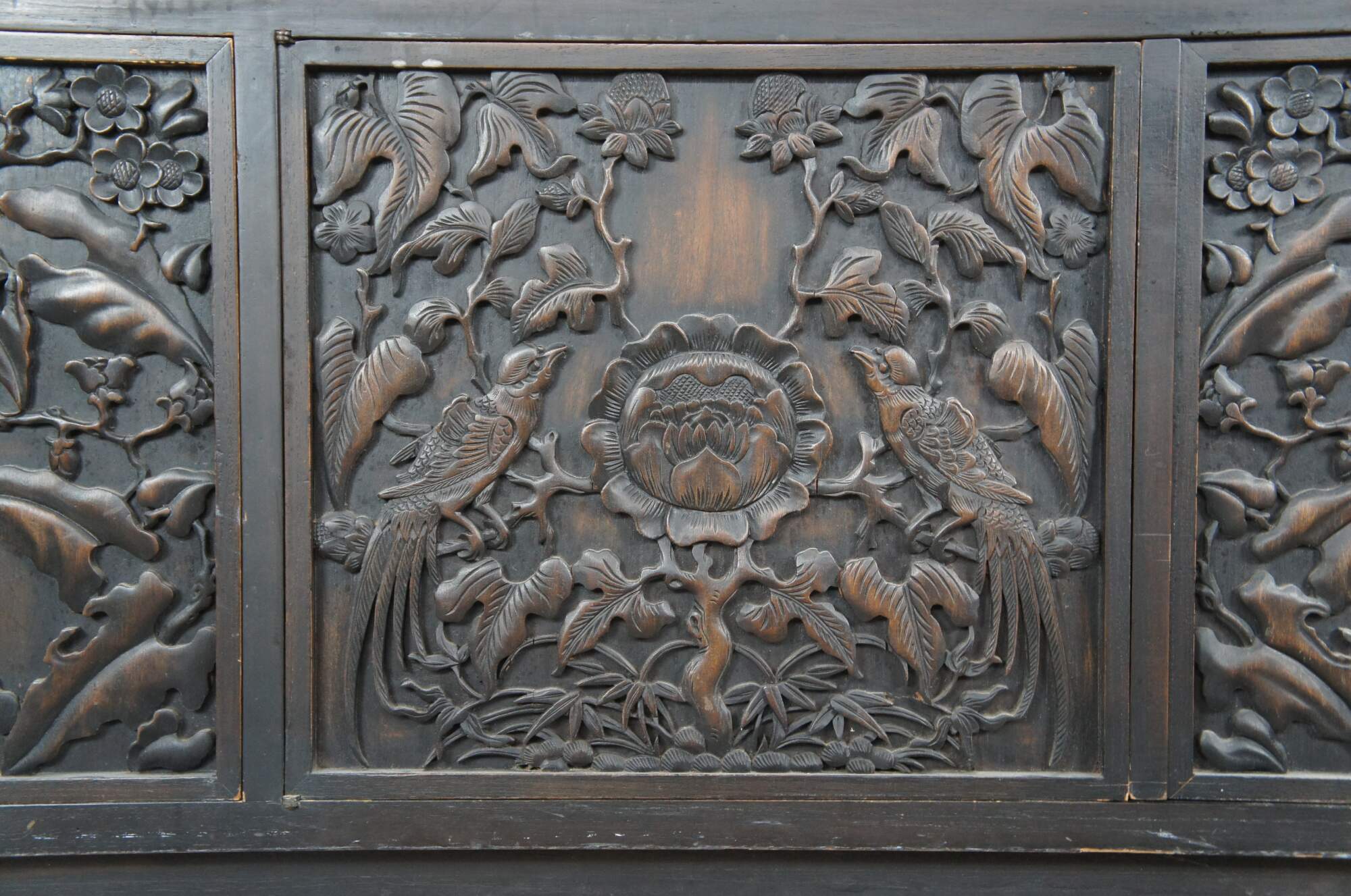 Mid 20th Century Chinese lowboy cabinet, record / media console or Altar chest. Made of mahogany featuring carved high relief floral, cherry blossom and bird motif with three paneled doors that open to inner cabinet and three drawers. Cabinet doors open on spring action by pressing in to pop it open. Great for use as a television or record cabinet.