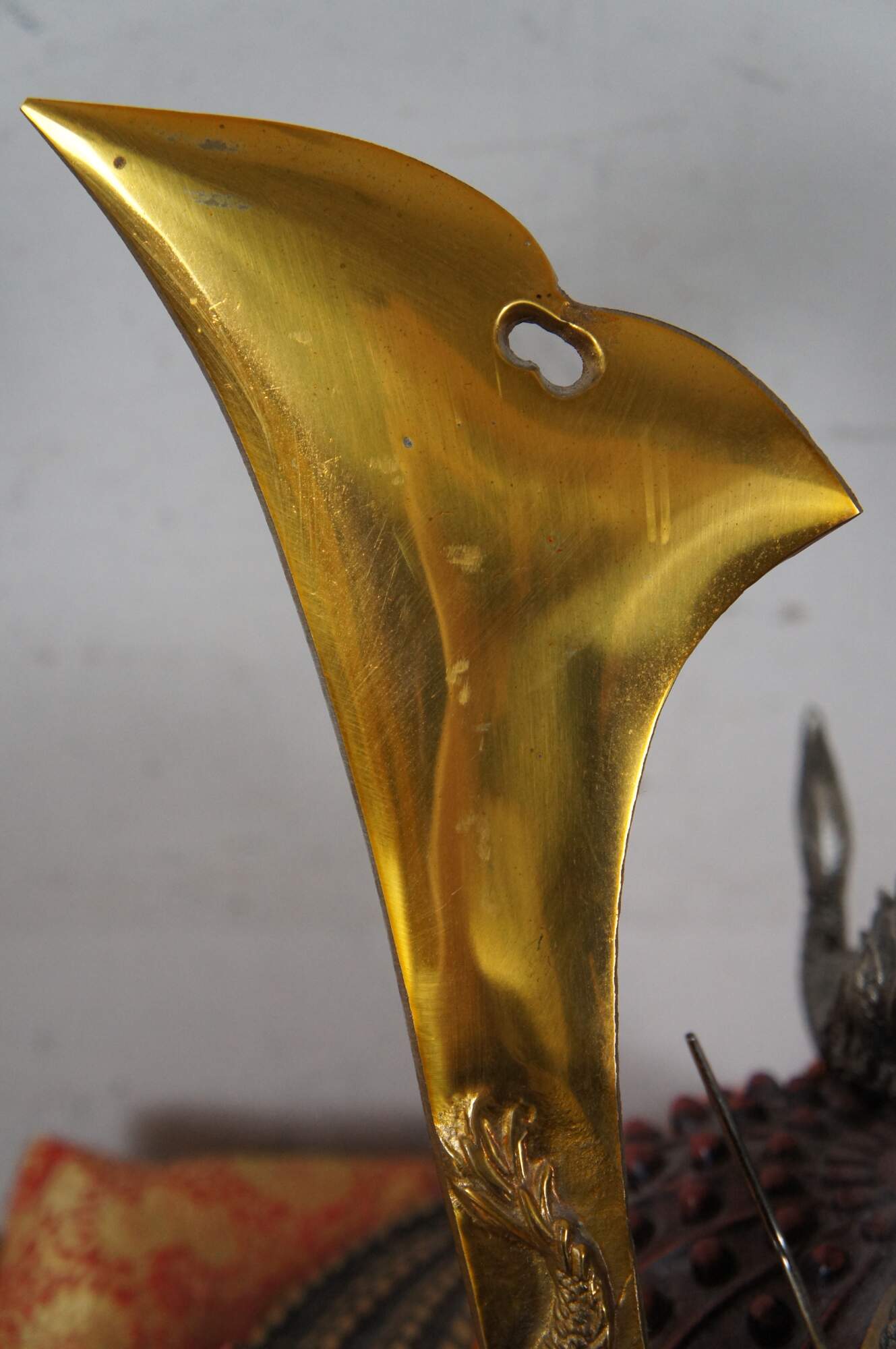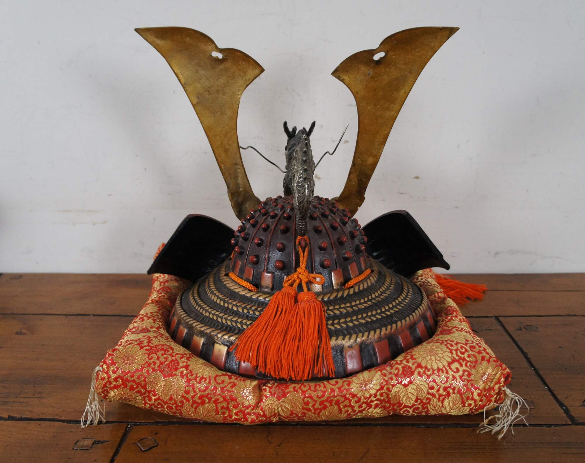 Vintage Japanese okimono kabuto samurai helmet, in the style of the Genji periord of 1864-65. Made of iron and painted deep blood red with black and gold accents. Ocean waves crash along the side panels while the main section is flanked with two gold dragons at the base of brass wing or blade shaped protrusions. Along the crest sits a silver toned dragon with long whiskers. An orange cord is strung through the brim. A red and gold floral silk pillow is included for display.