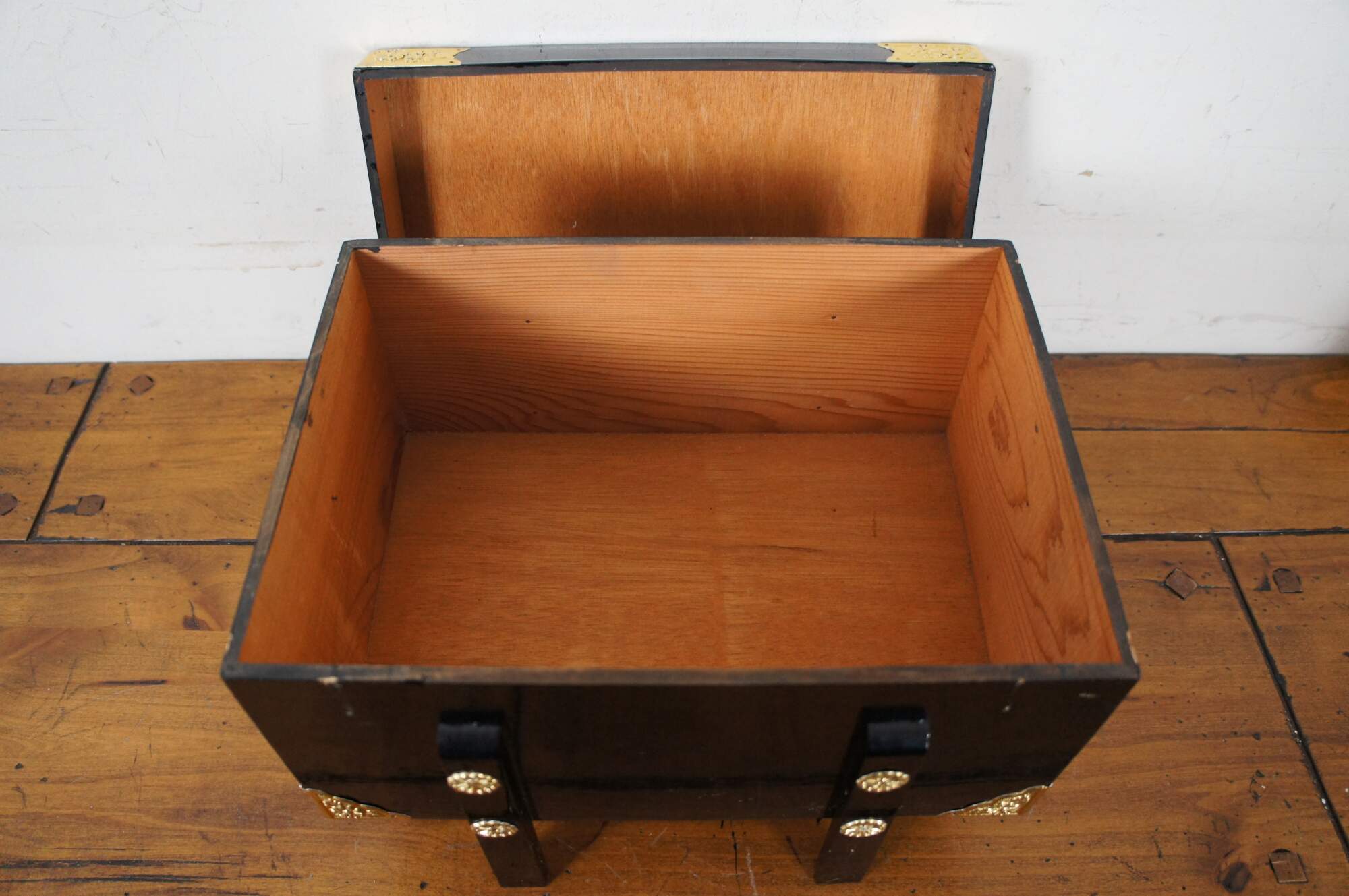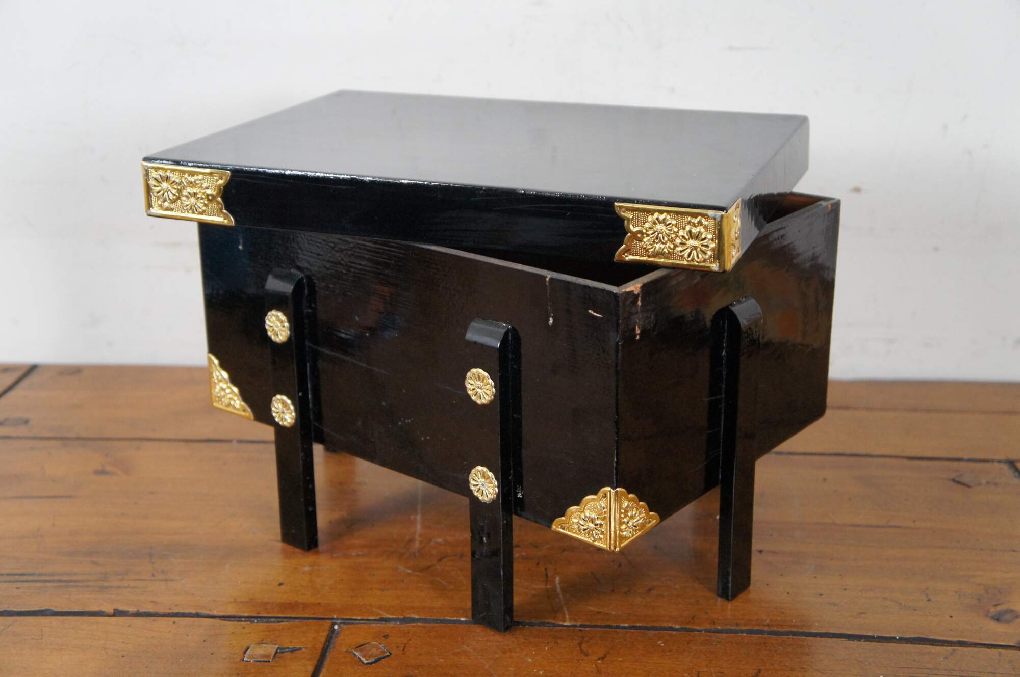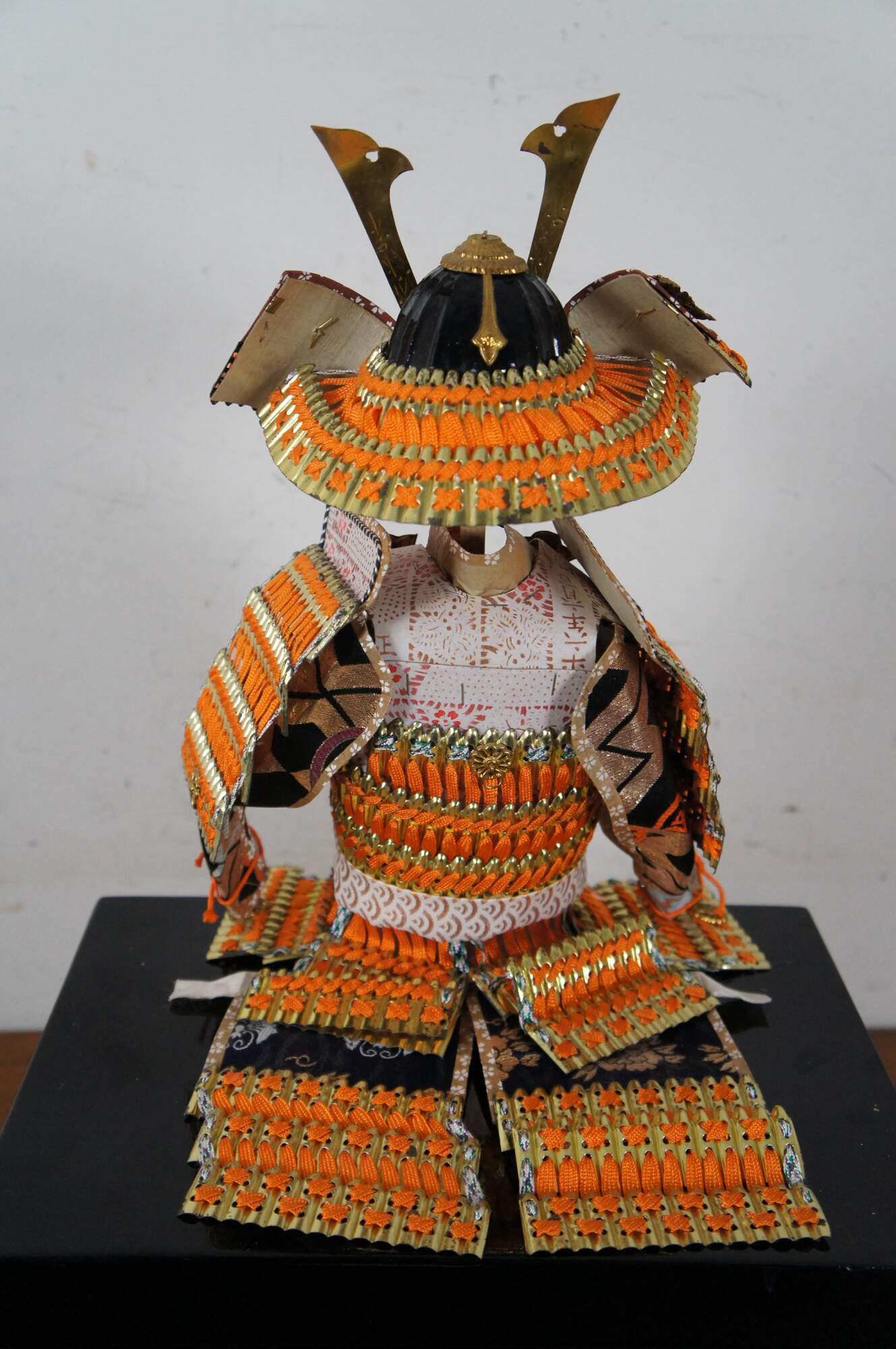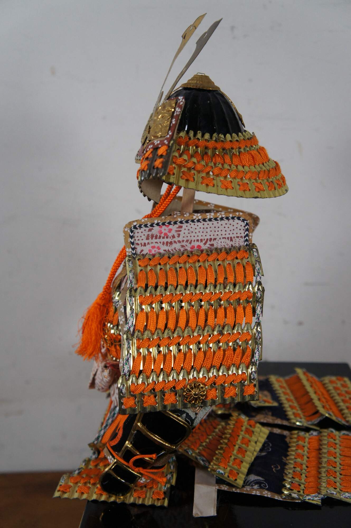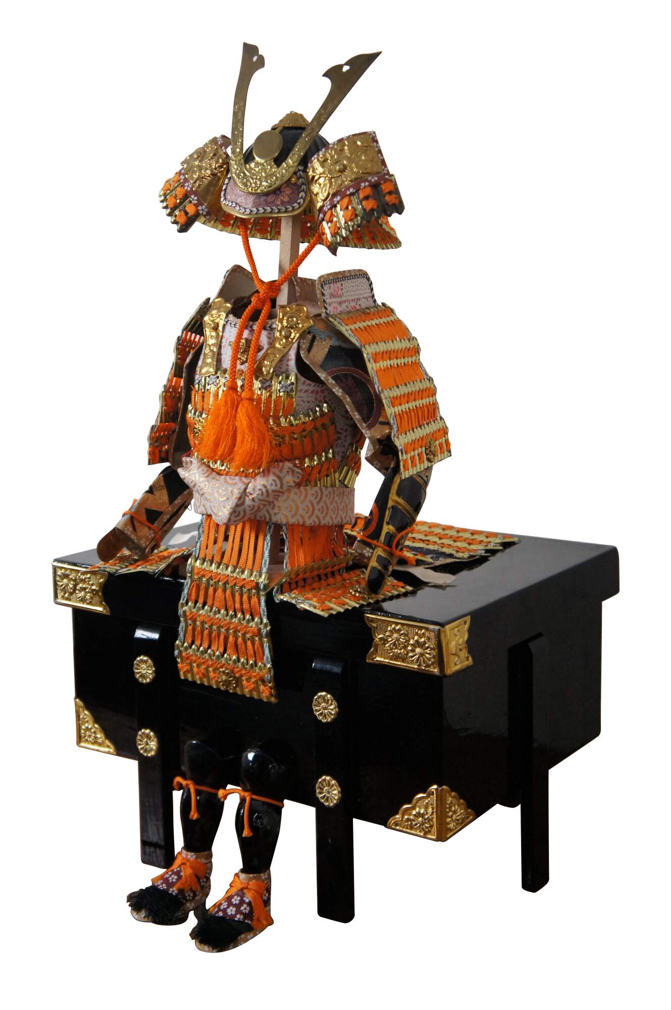 Vintage set of Japanese samurai doll armor in orange and gold, designed to perch on the edge of the black lacquer campaign style storage box with floral gilt metal corner pieces and medallions.