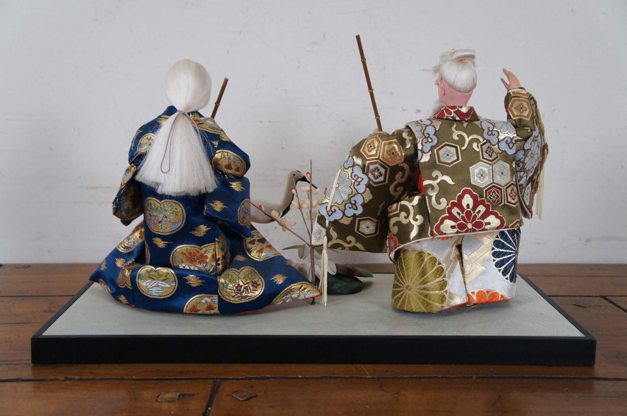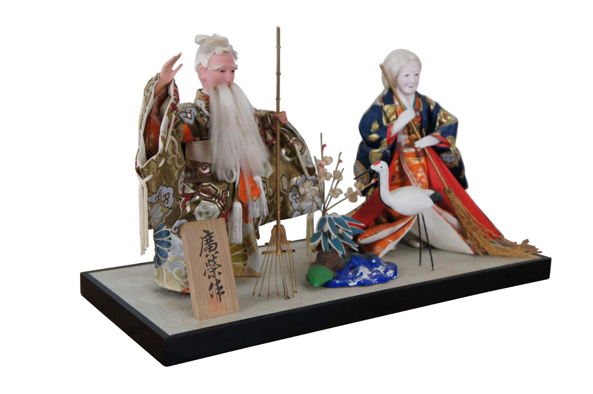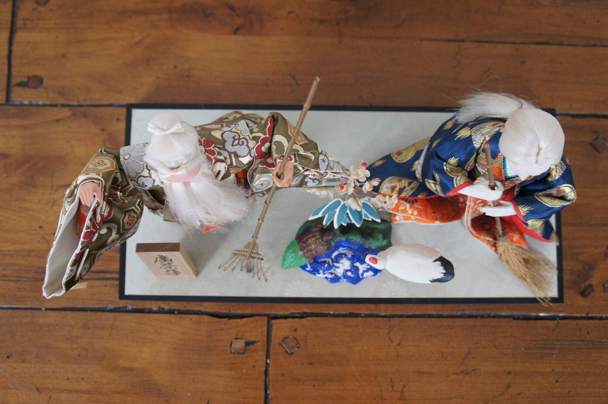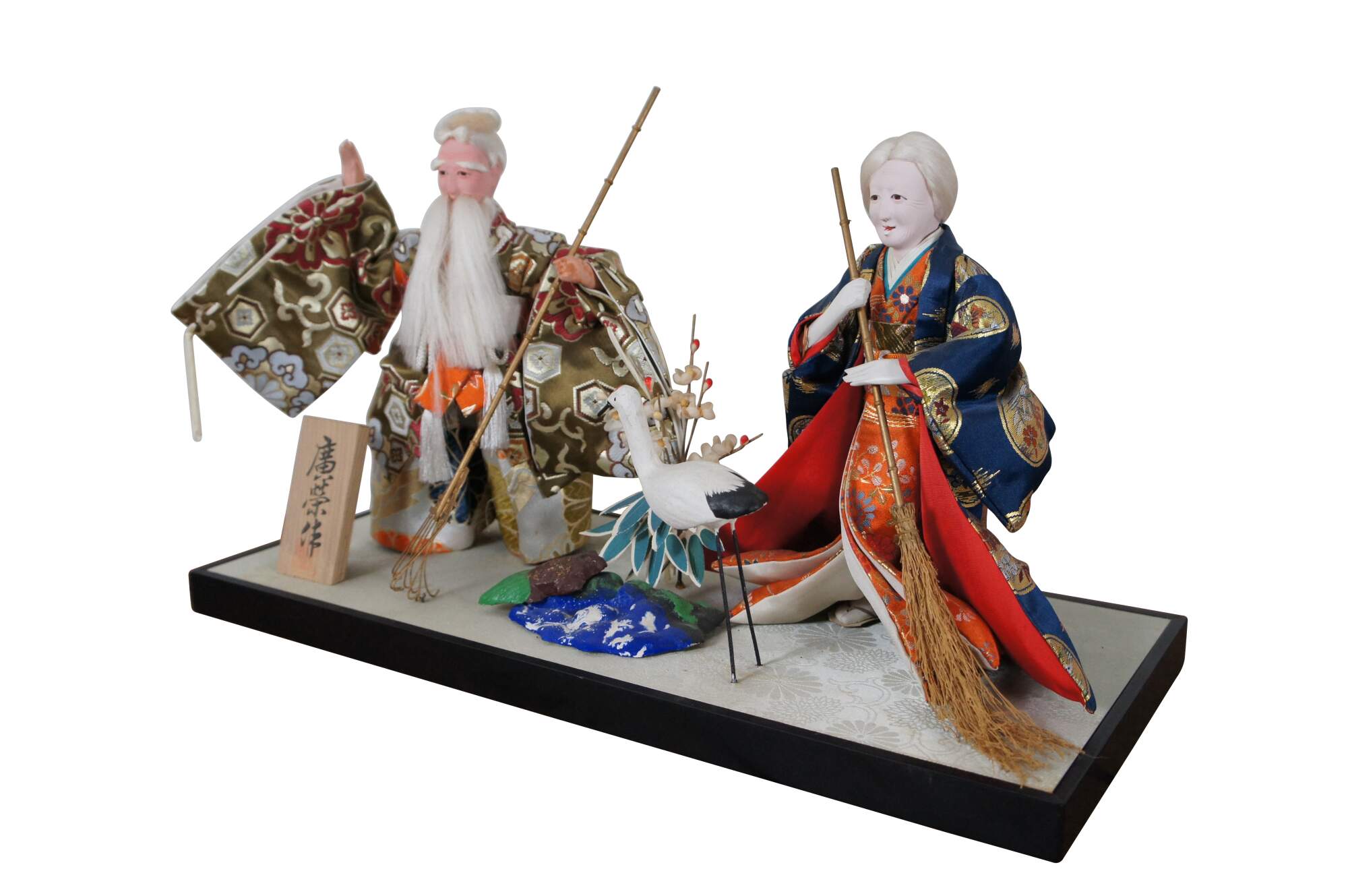 Vintage Japanese doll pair depicting a Noh theater / play, "The Old Couple from Takasago" from the Taisho period (1912-26). The man's name is Jo and his wife is Uba. They symbolize long life and happiness with Jo raking in the good and Uba sweeping out the bad. This pair is quite beloved in Japan and representations of them are often given as wedding gifts. These dolls feature un-glazed porcelain / bisque heads and hands, painted features, bodies placed in set poses and dressed in sumptuously colored clothes. Between them is a small pond with a turtle, foliage, flowering tree, and crane. A small wood plaque is mounted in the front corner.