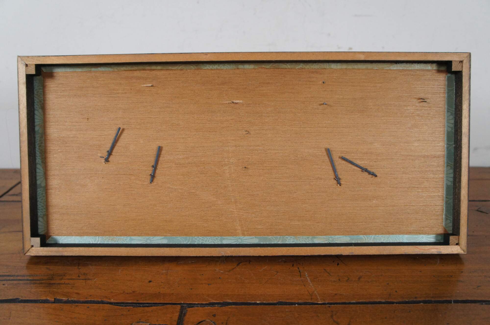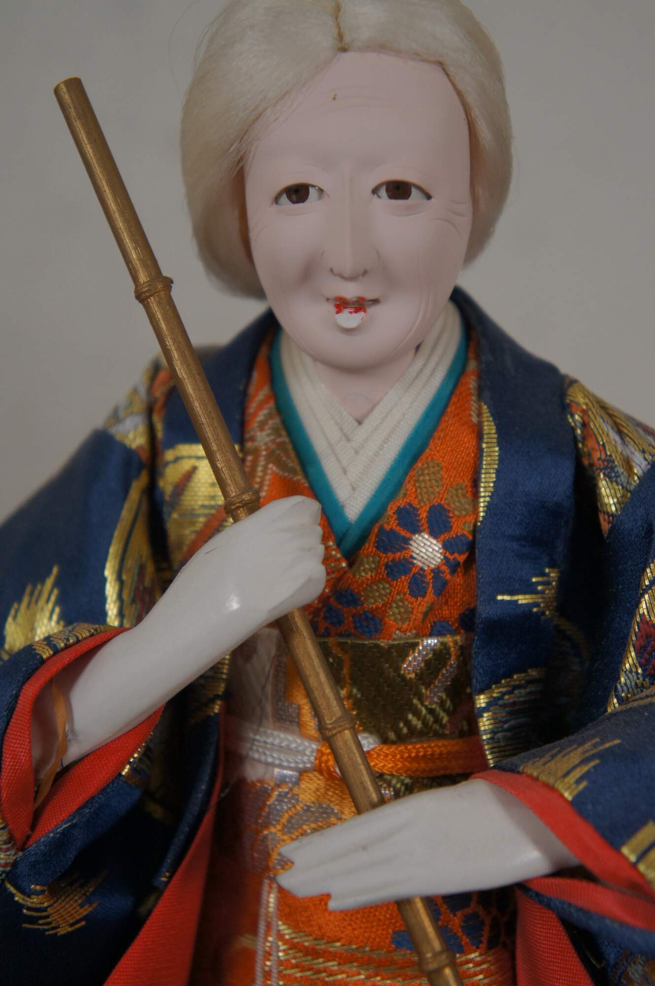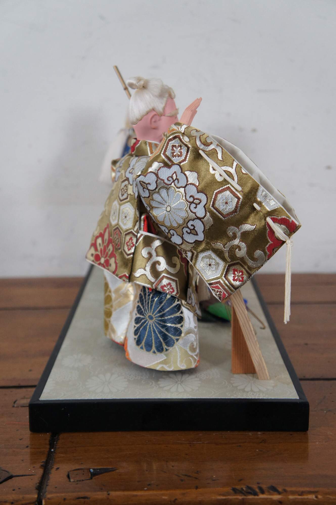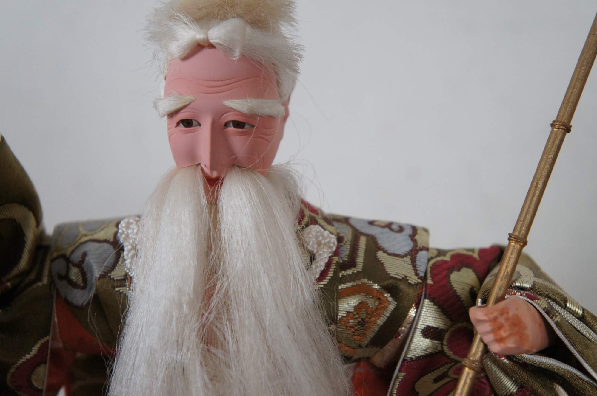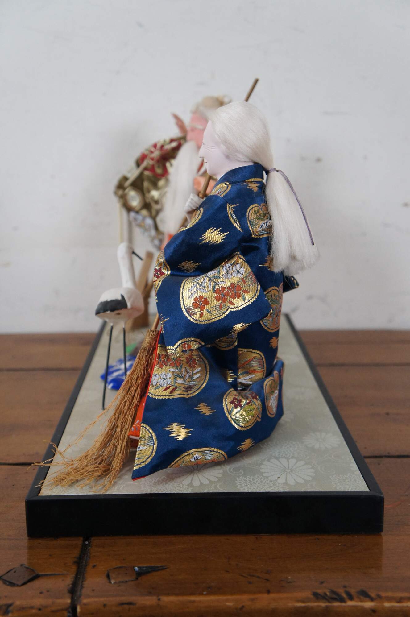 Vintage Japanese doll pair depicting a Noh theater / play, "The Old Couple from Takasago" from the Taisho period (1912-26). The man's name is Jo and his wife is Uba. They symbolize long life and happiness with Jo raking in the good and Uba sweeping out the bad. This pair is quite beloved in Japan and representations of them are often given as wedding gifts. These dolls feature un-glazed porcelain / bisque heads and hands, painted features, bodies placed in set poses and dressed in sumptuously colored clothes. Between them is a small pond with a turtle, foliage, flowering tree, and crane. A small wood plaque is mounted in the front corner.