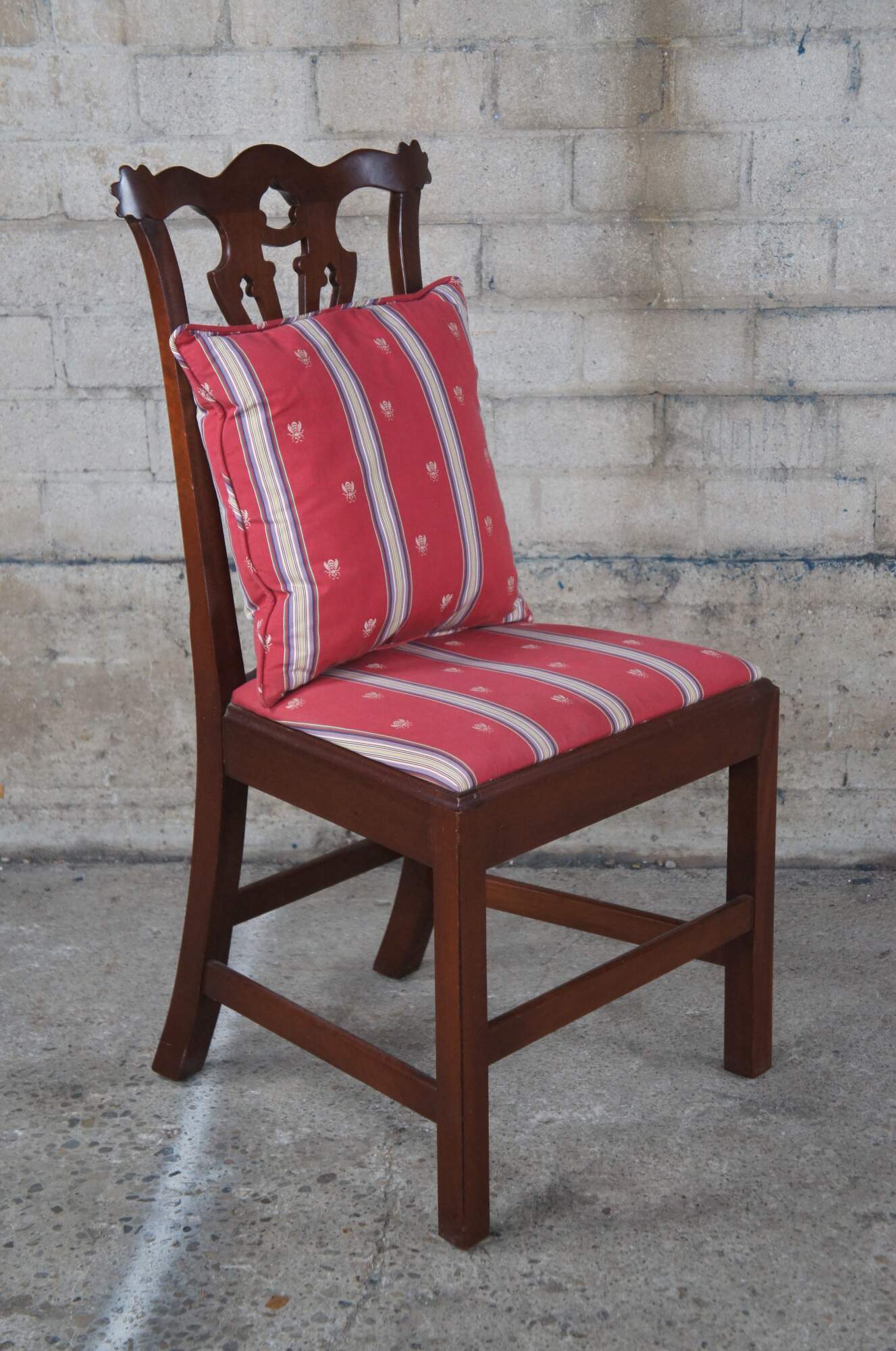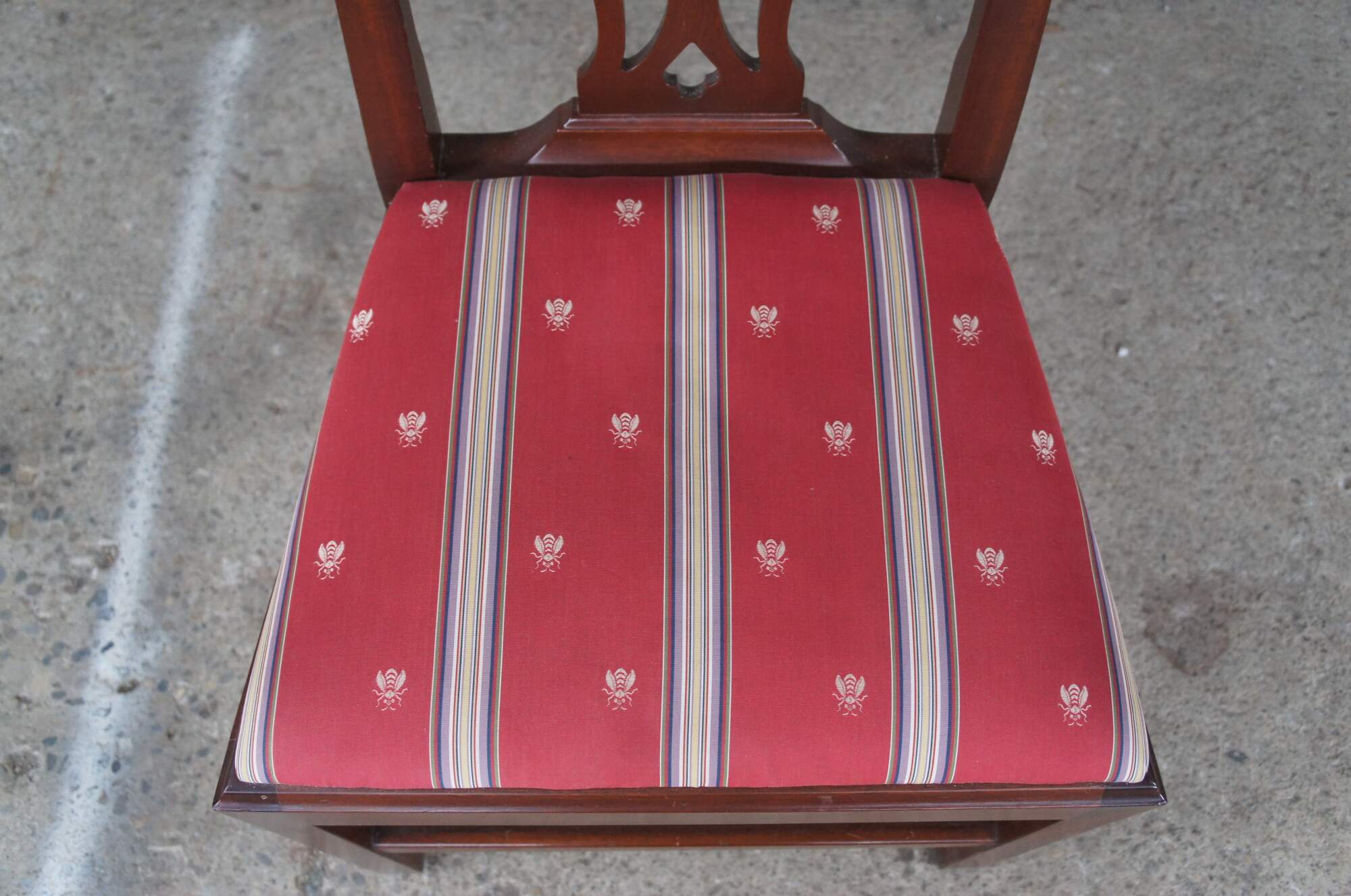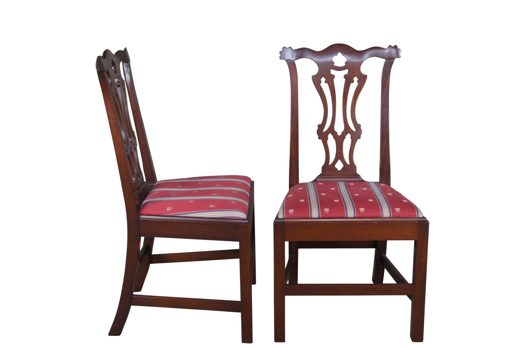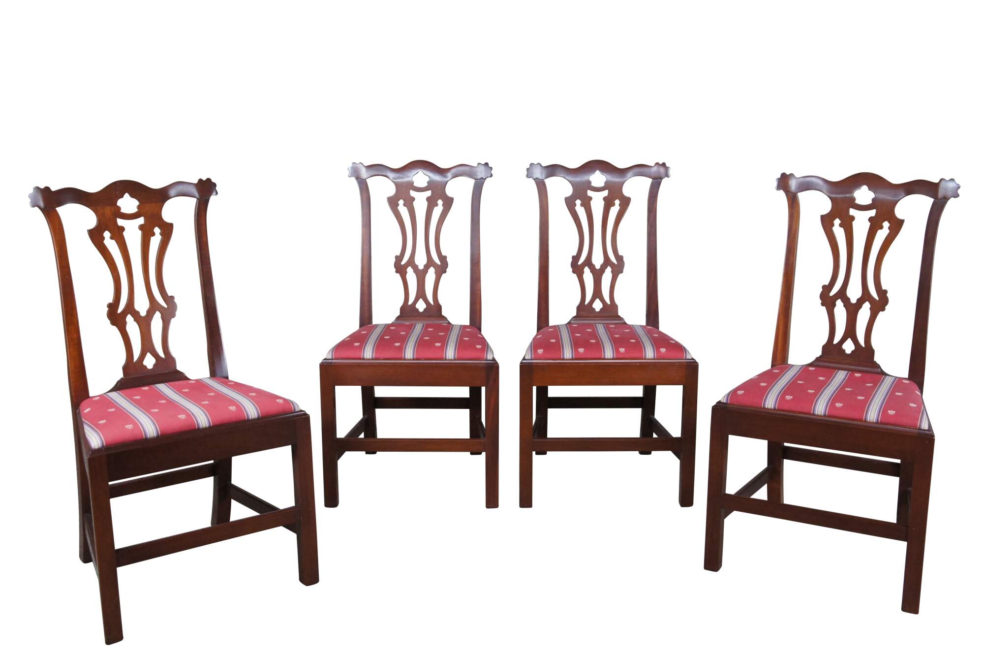 Set of four Vintage Chippendale style dining side chairs, circa second half 20th century. Made after the set originally found in Jefferson's Honeymoon Cottage in Monticello, Va. If you were to visit Monticello you would now find them in The South Square Family Sitting Room. Made of mahogany featuring a serpentine crest rail, pierced splat back and silk striped / bee upholstered seat and matching down filled lumbar pillows.