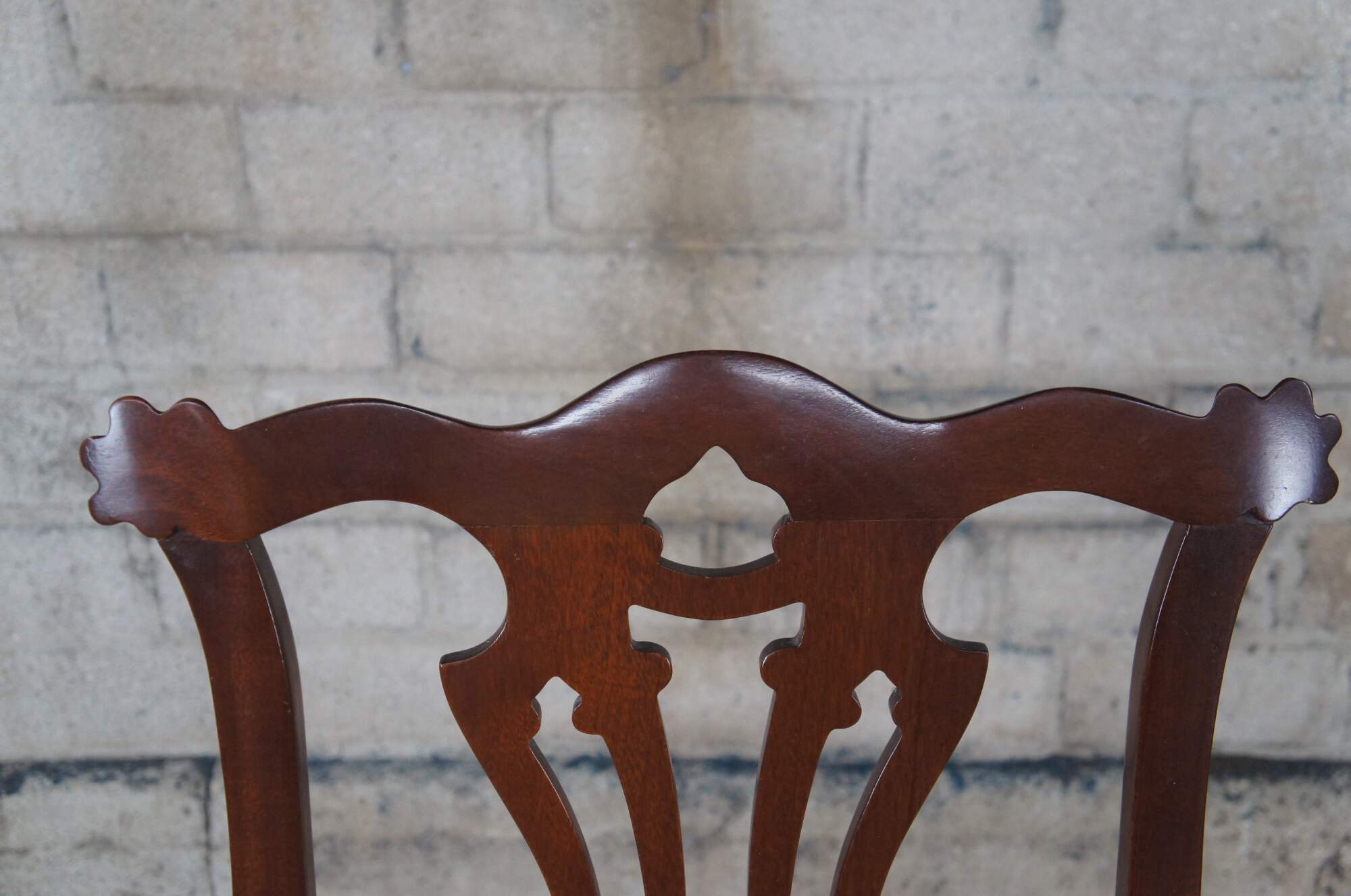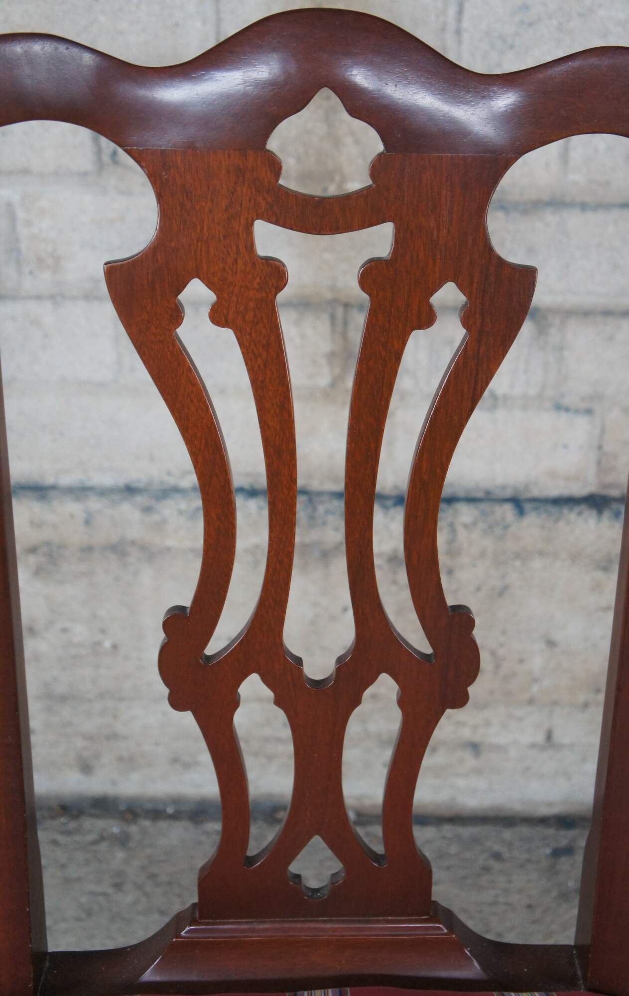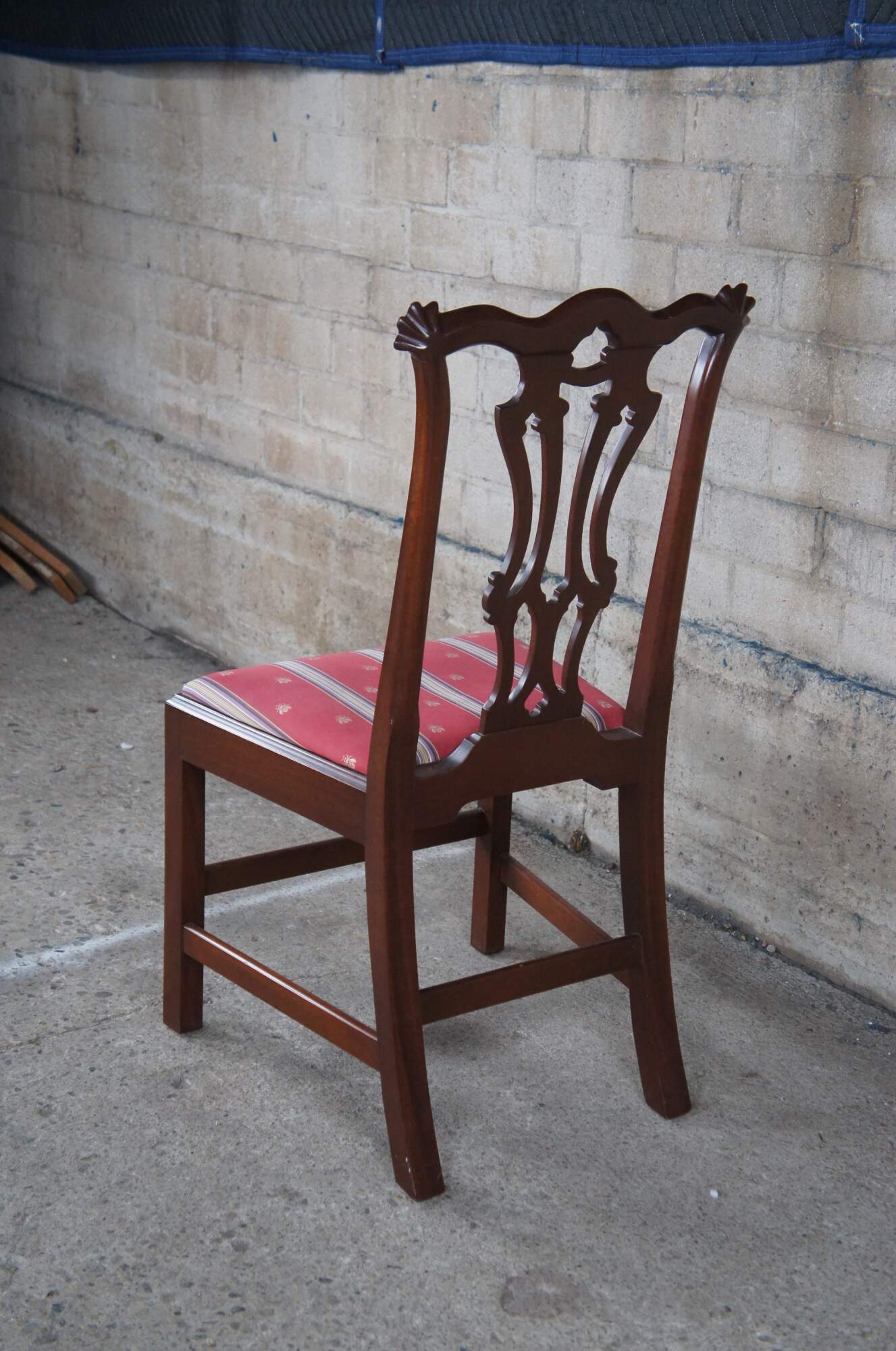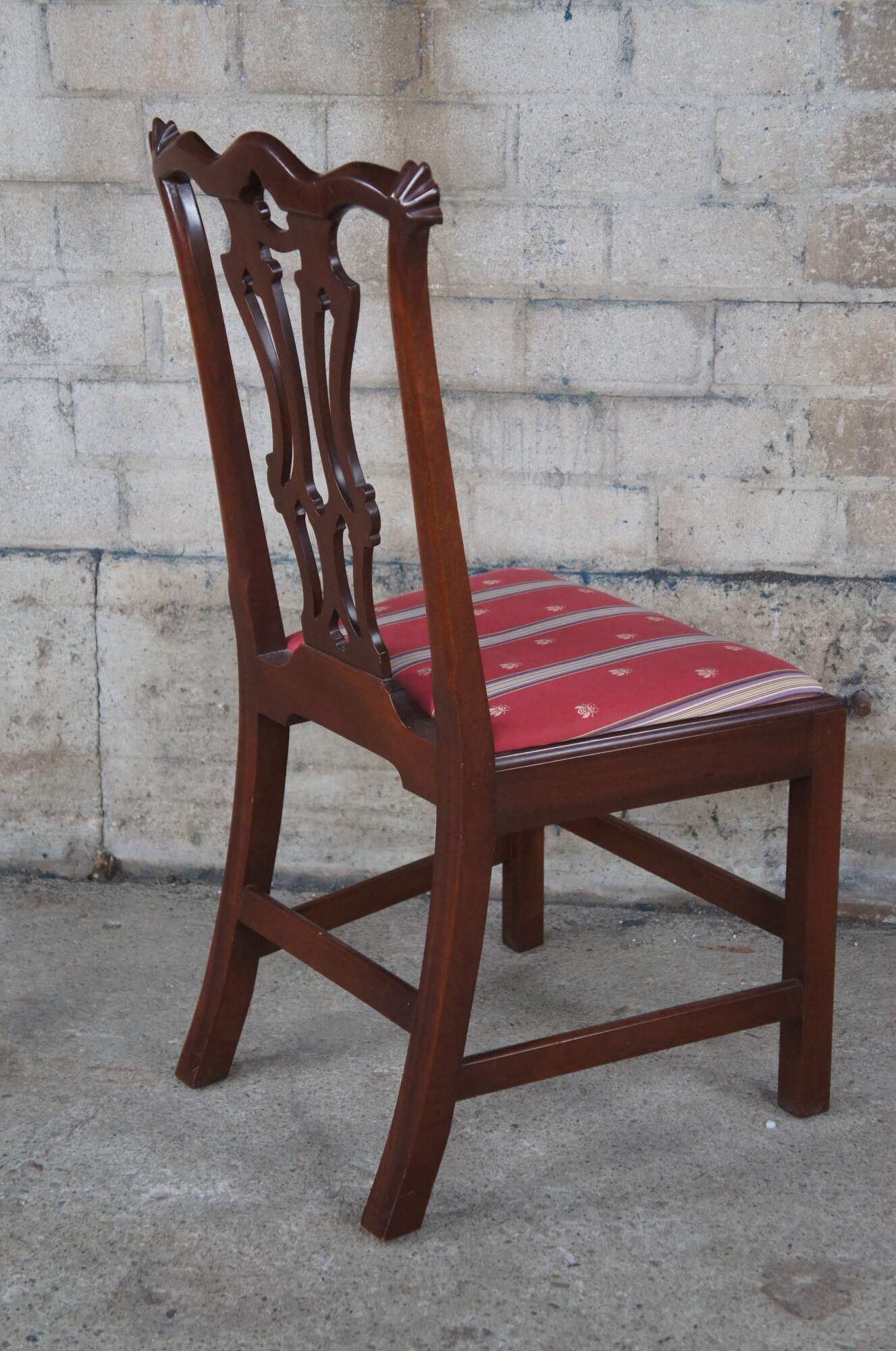 Set of four Vintage Chippendale style dining side chairs, circa second half 20th century. Made after the set originally found in Jefferson's Honeymoon Cottage in Monticello, Va. If you were to visit Monticello you would now find them in The South Square Family Sitting Room. Made of mahogany featuring a serpentine crest rail, pierced splat back and silk striped / bee upholstered seat and matching down filled lumbar pillows.