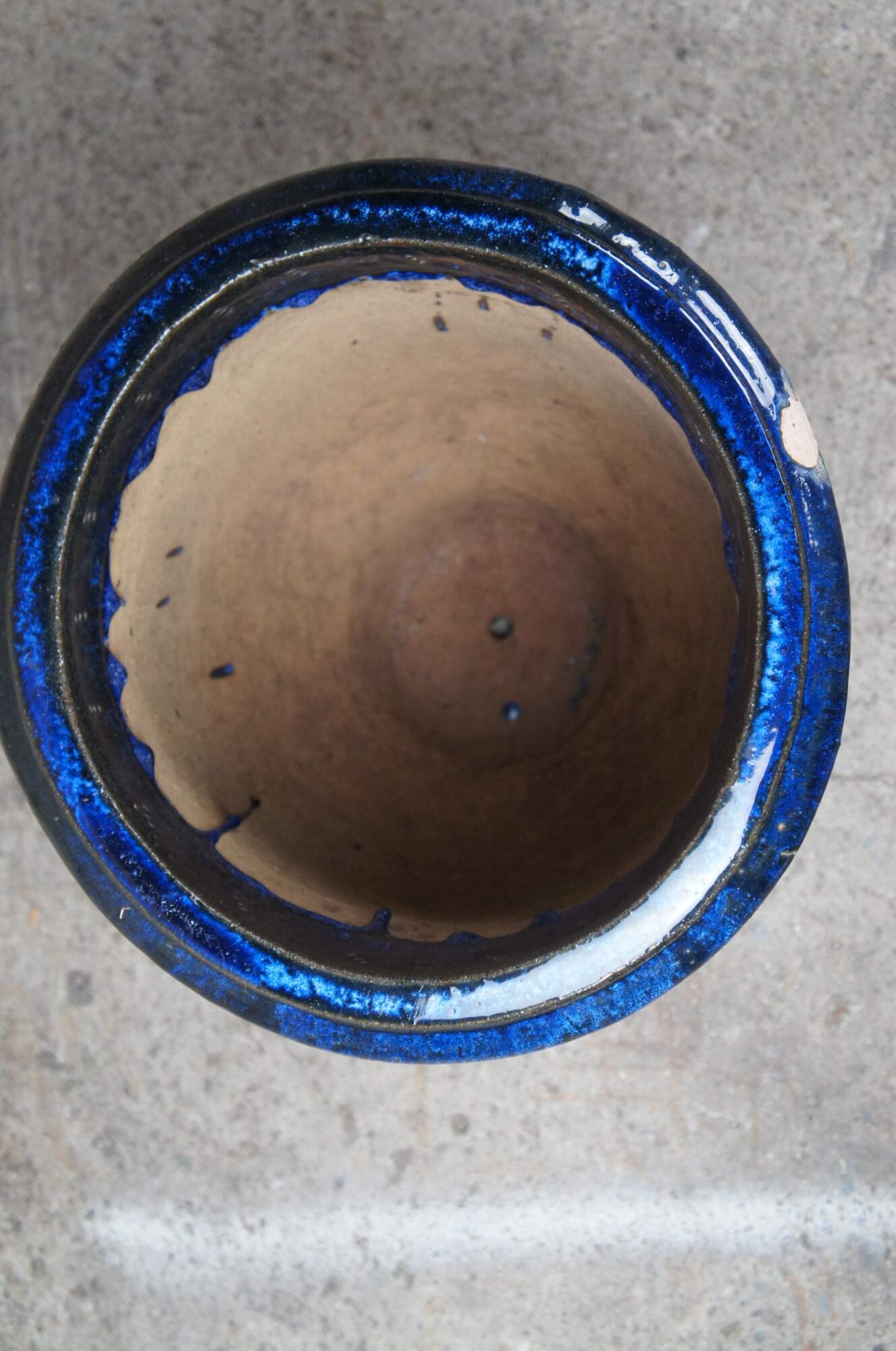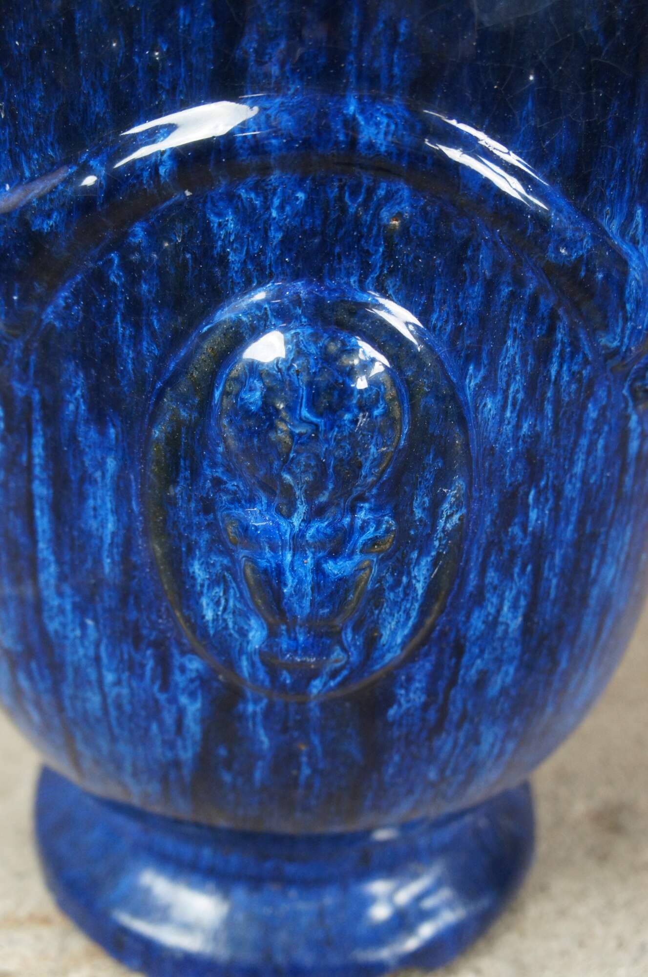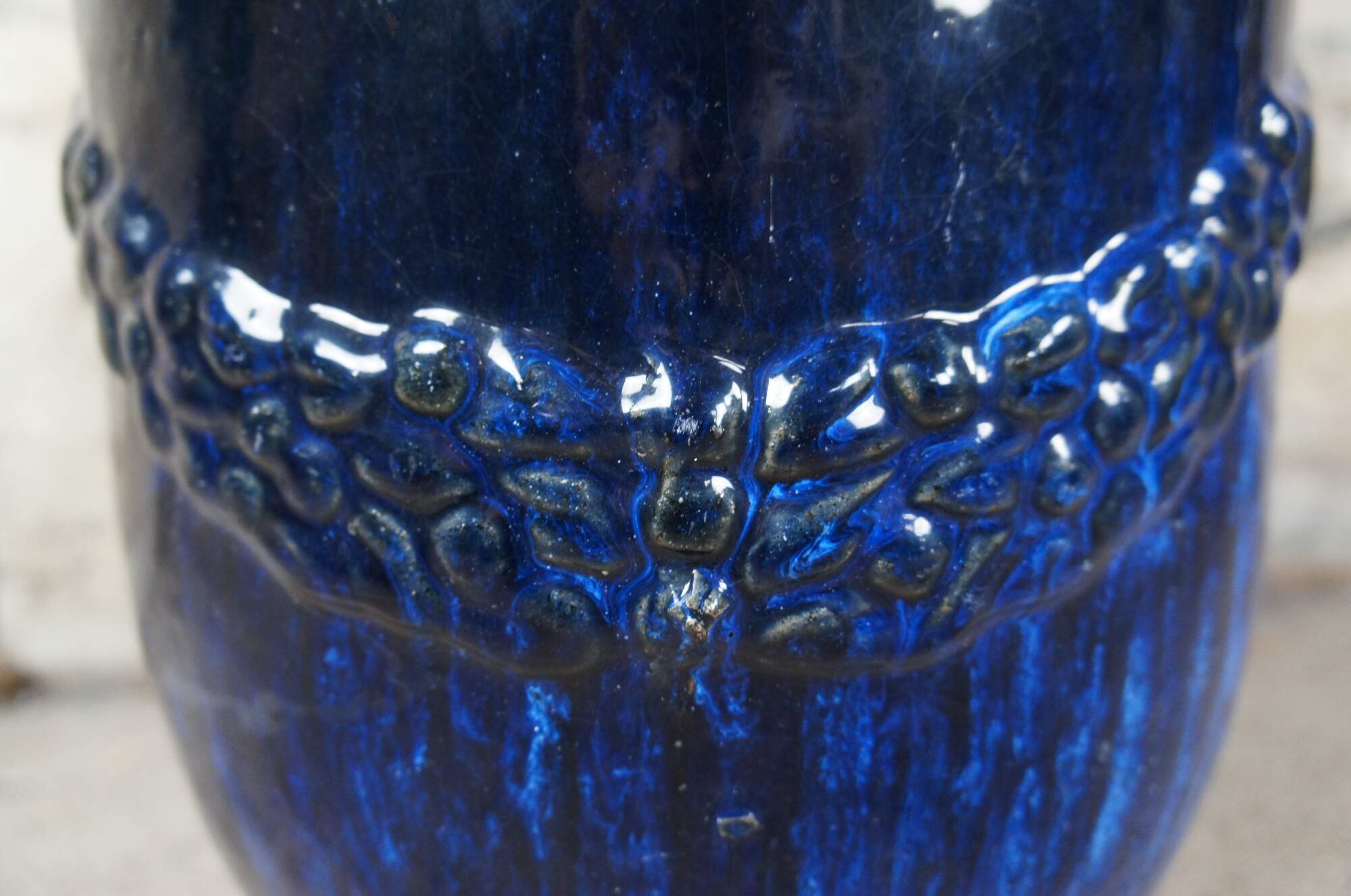 A lovely French clay fired pot in blue glaze with wreath detail and medallion along each side. The raised medallion features a bush in a pot. The beautiful blue glaze has varying shades of blue. Drip hole at the center of base.