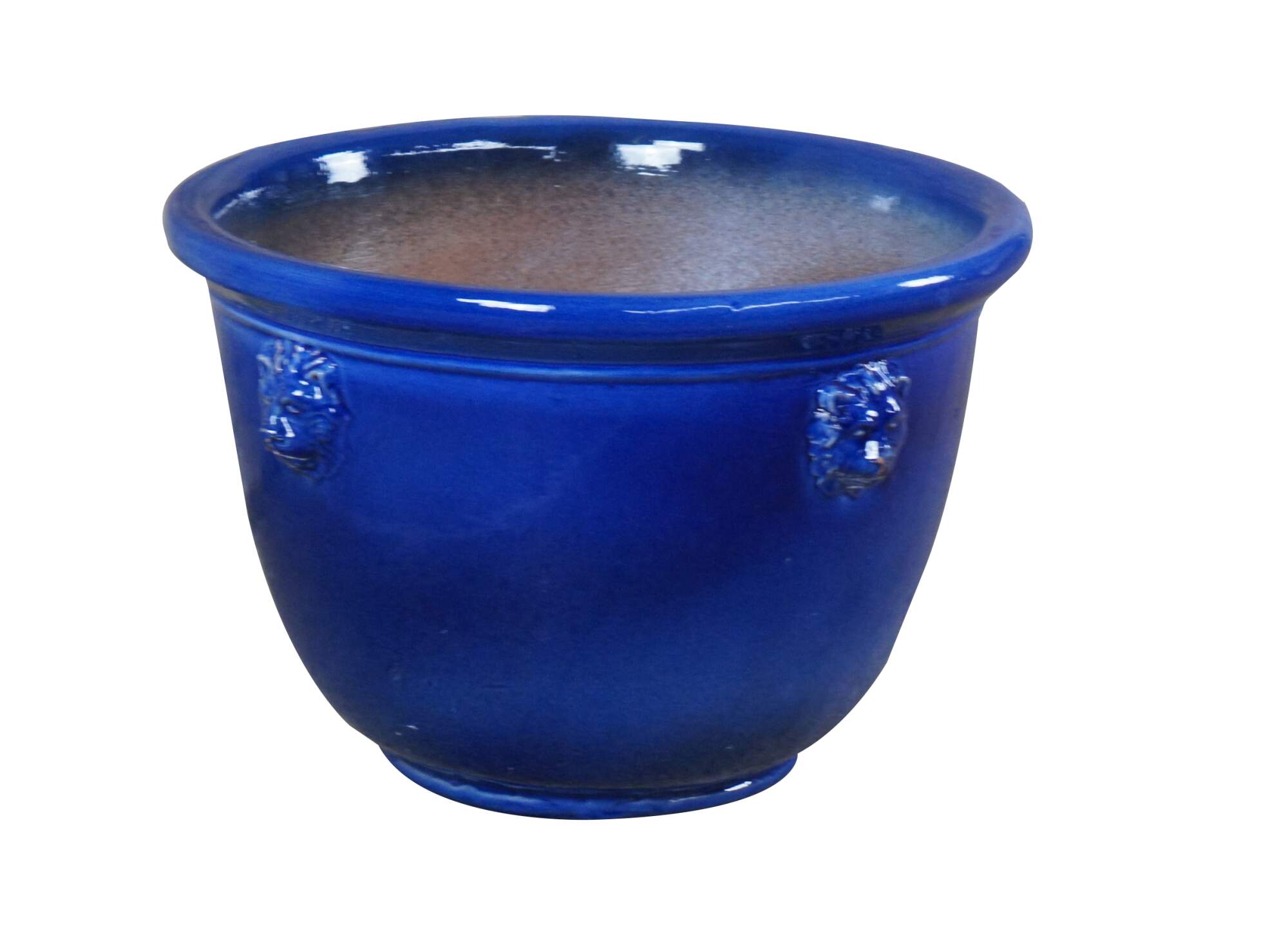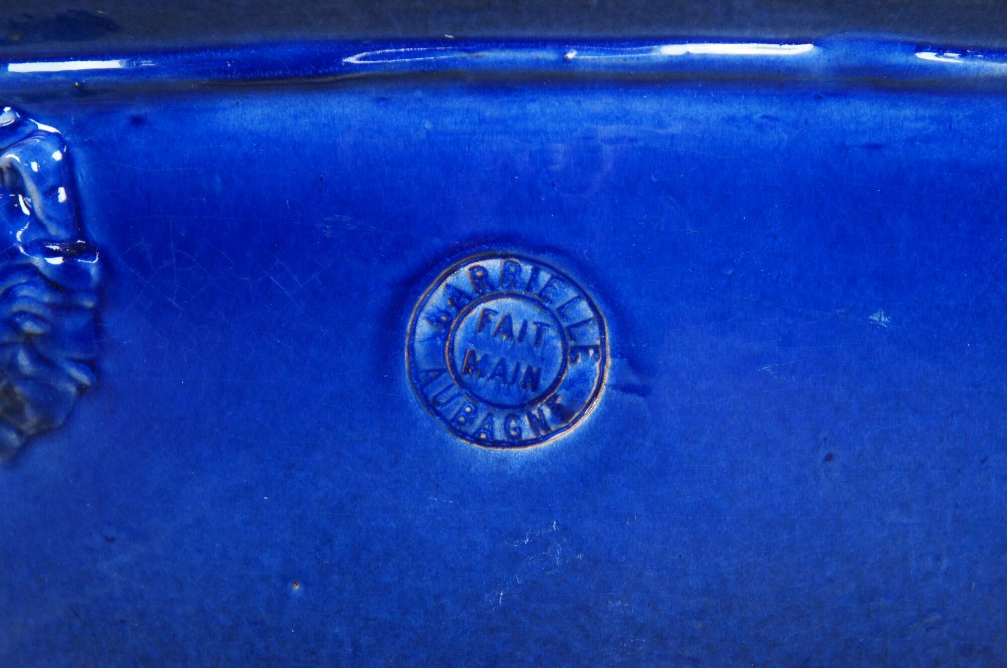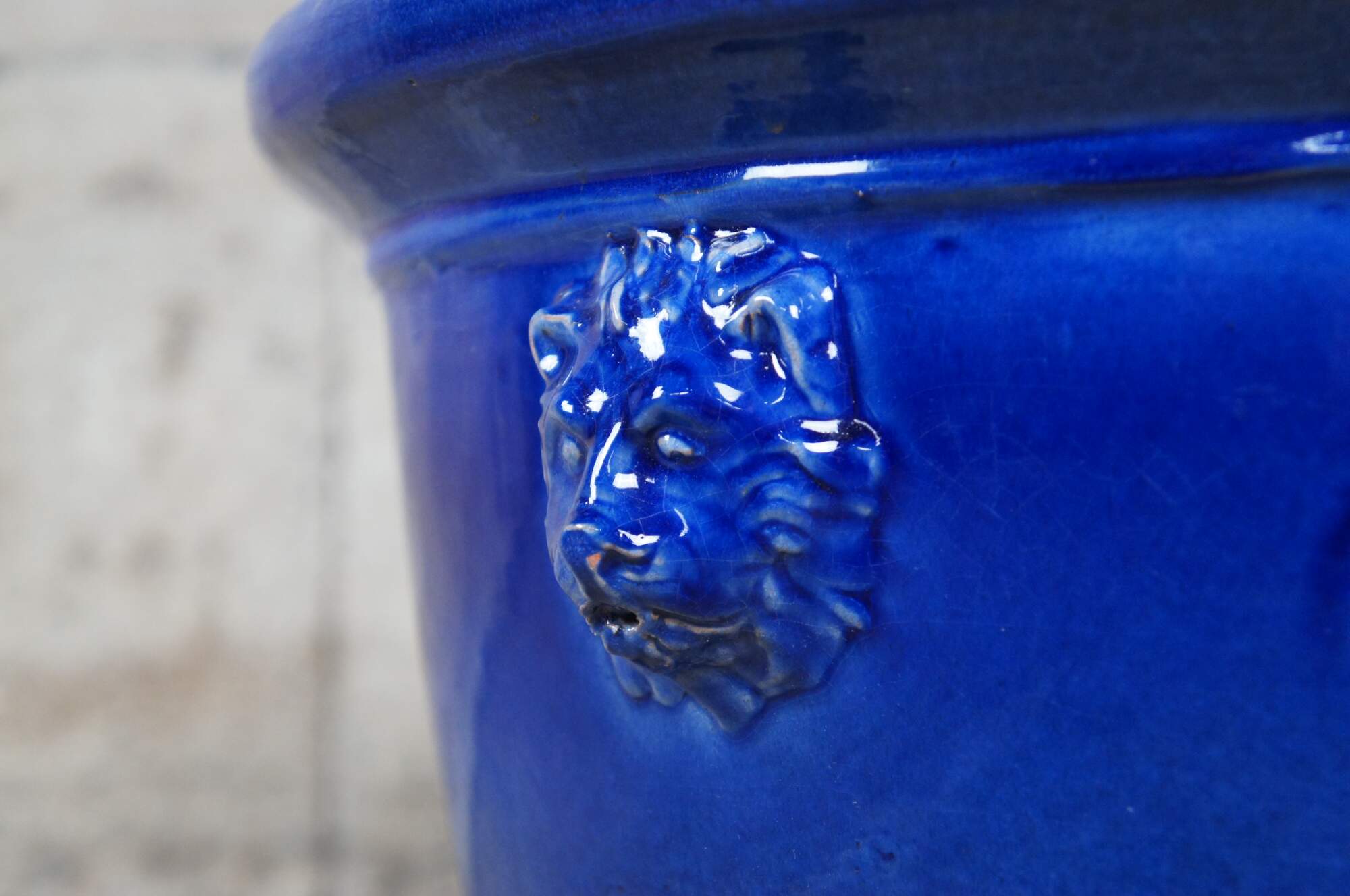 Handmade ceramic blue pot by Barrielle Aubagne. Glazed in blue with lion heads. Aubagne is a commune in southern French