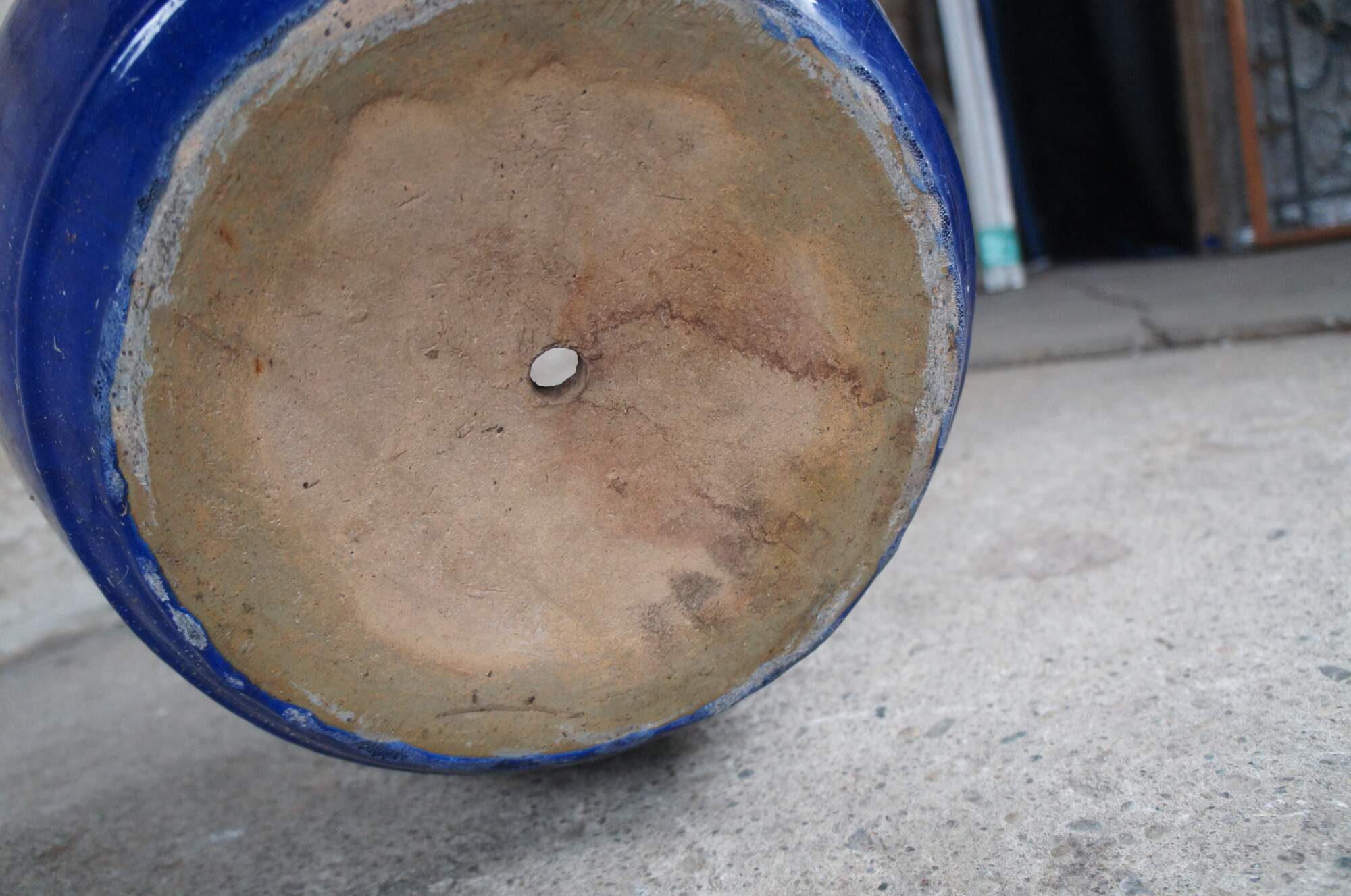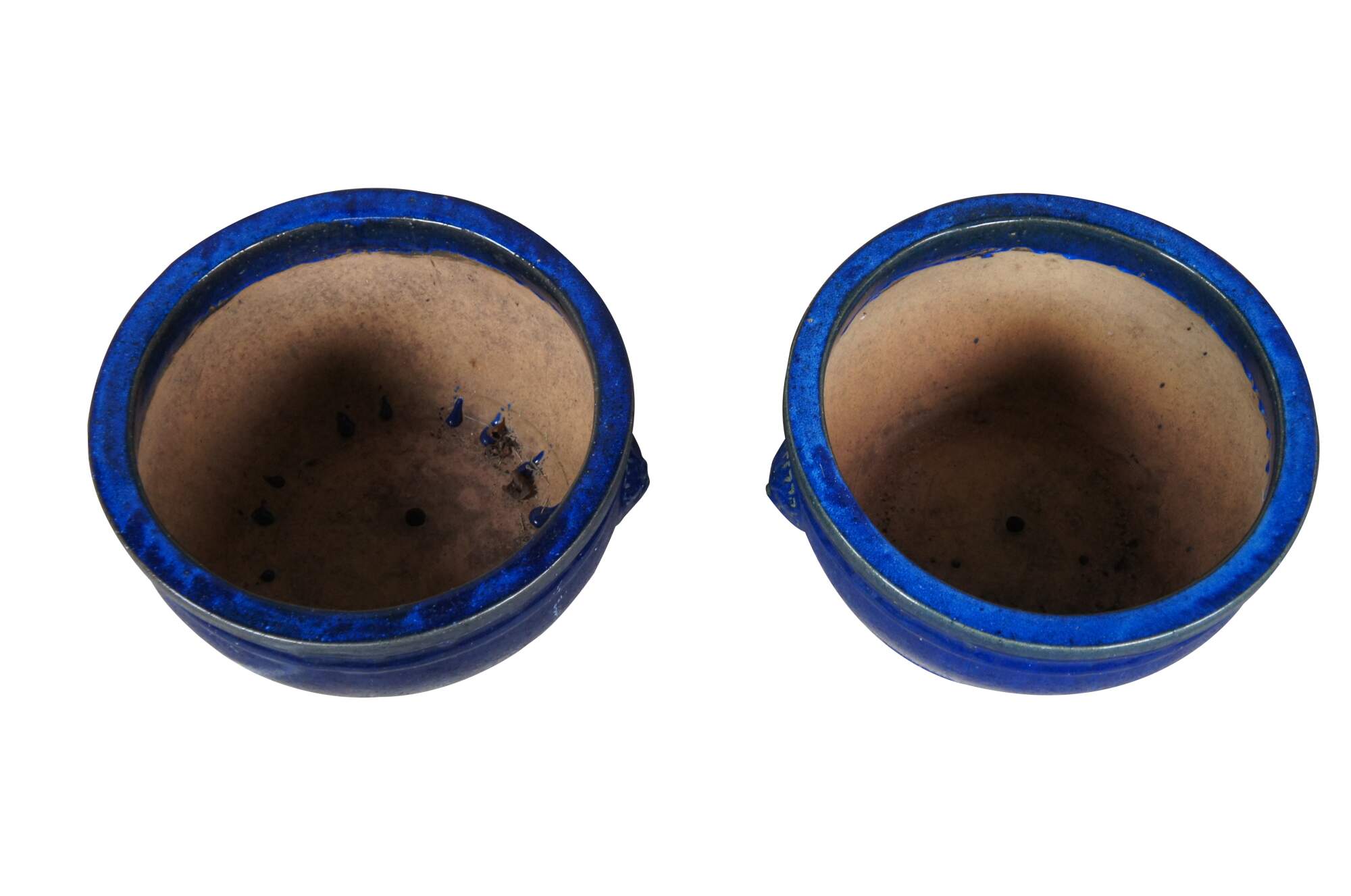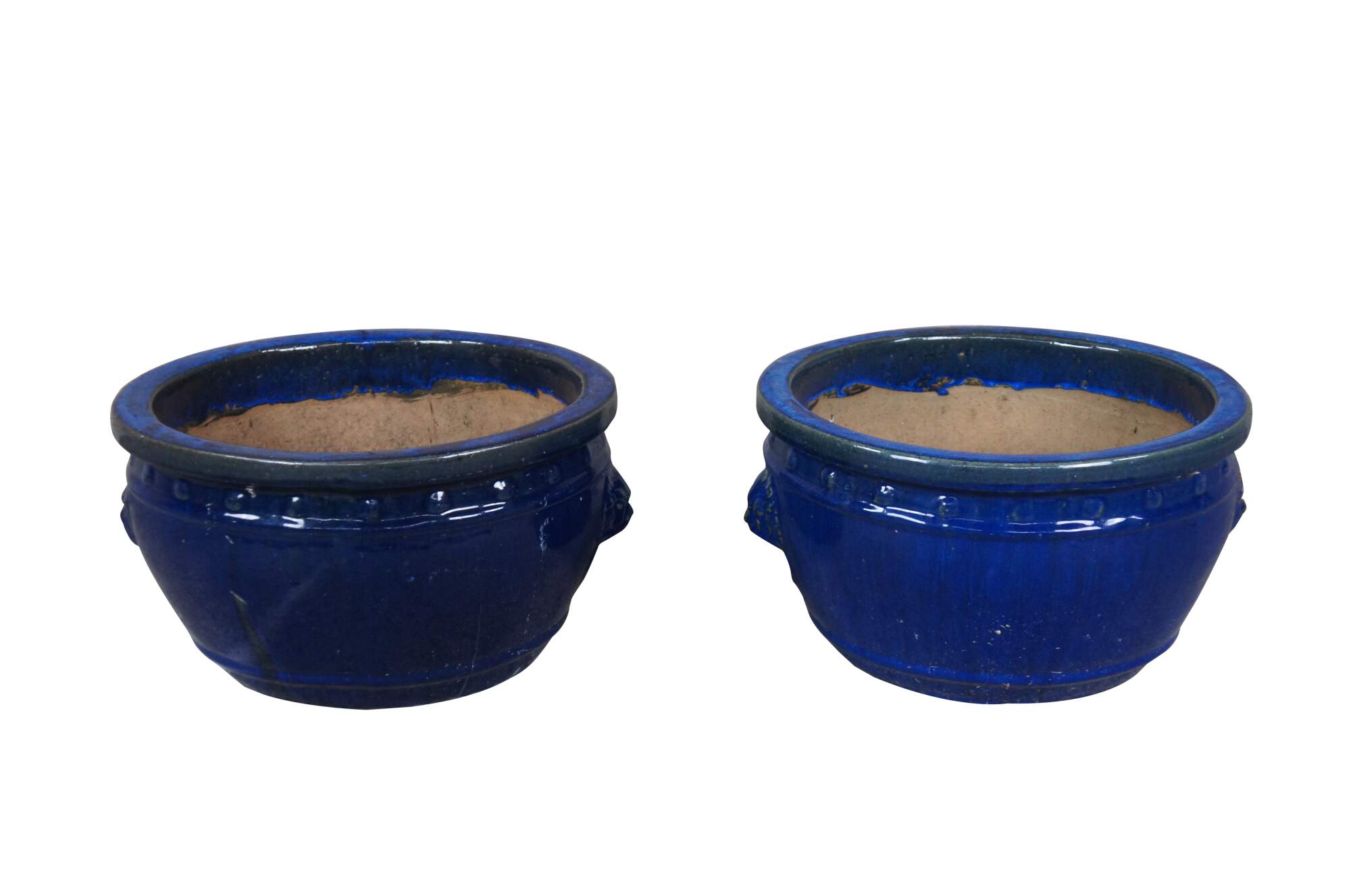 2 Handmade ceramic blue urns. Glazed in blue with lion heads and knockers. Features raised dots beneath the top lip and a drip hole in the base.