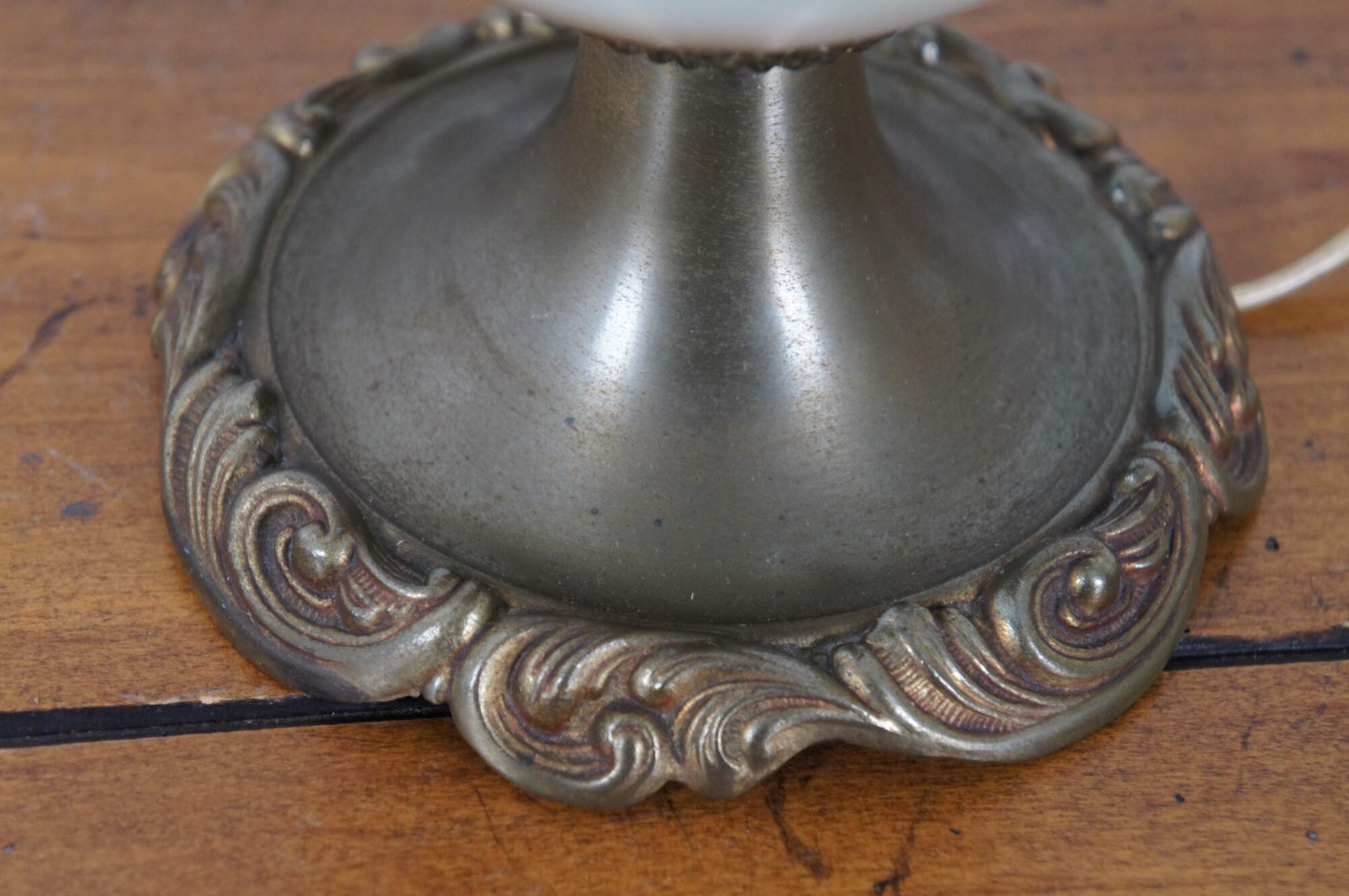 1940’s hand painted porcelain table lamp featuring trophy form with serpentine reticulated handles and Art Nouveau style metal base by Coronet. Features hand painted flowers on a pink and teal green ground, framed at the sides with gilded leaves. Includes fixed harp, off-white plastic finial, and white shade with braided trim. Base marked 93 and an ampersand (&).
