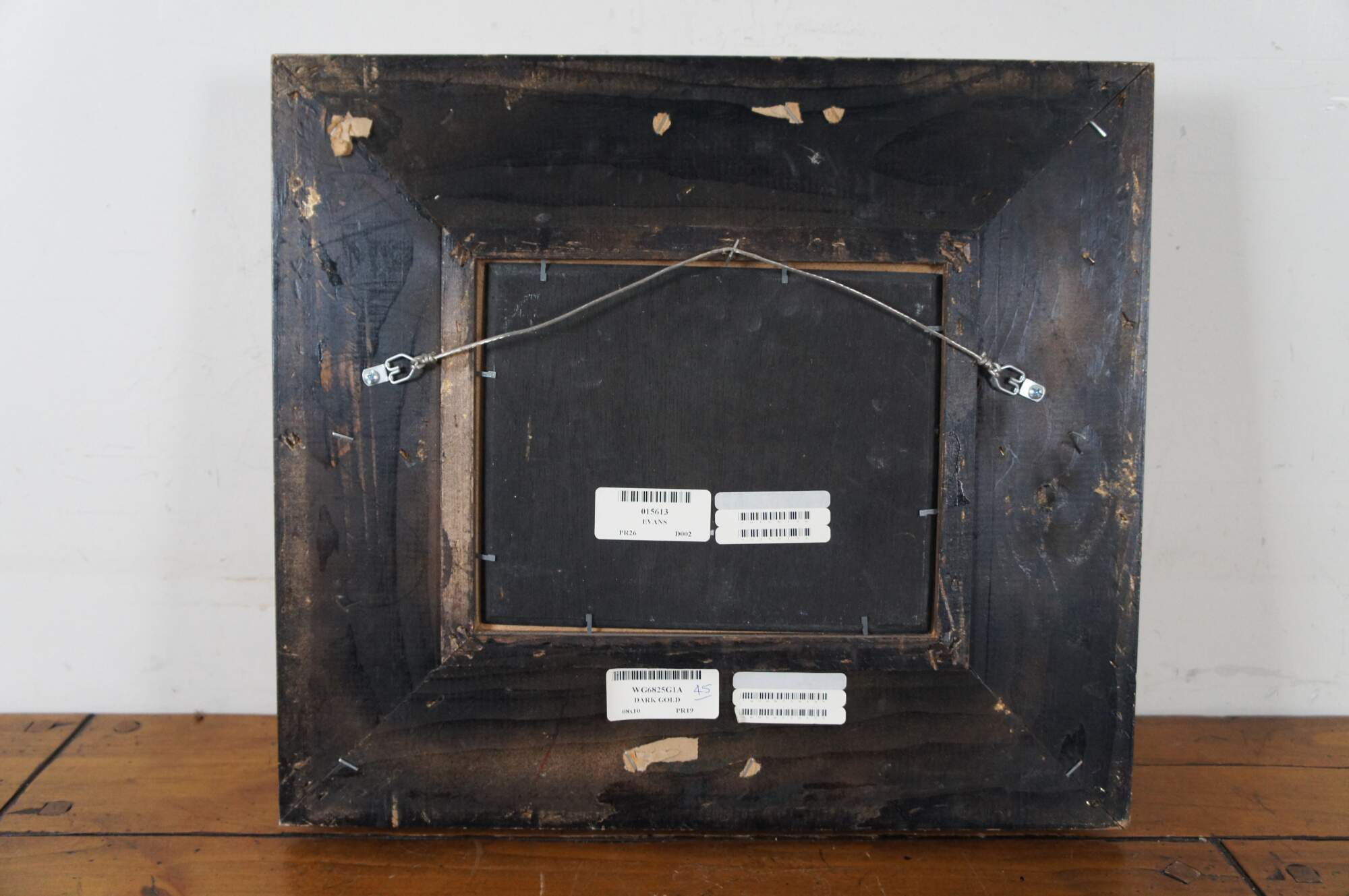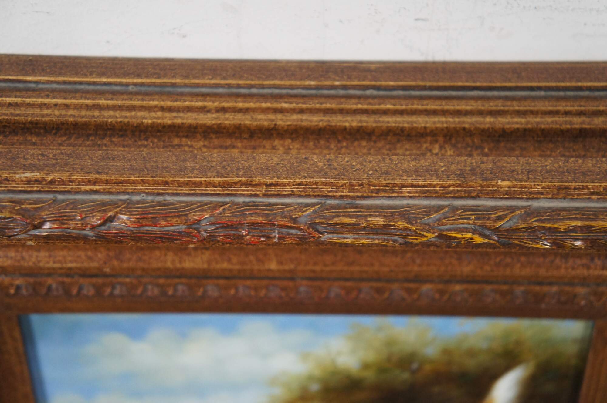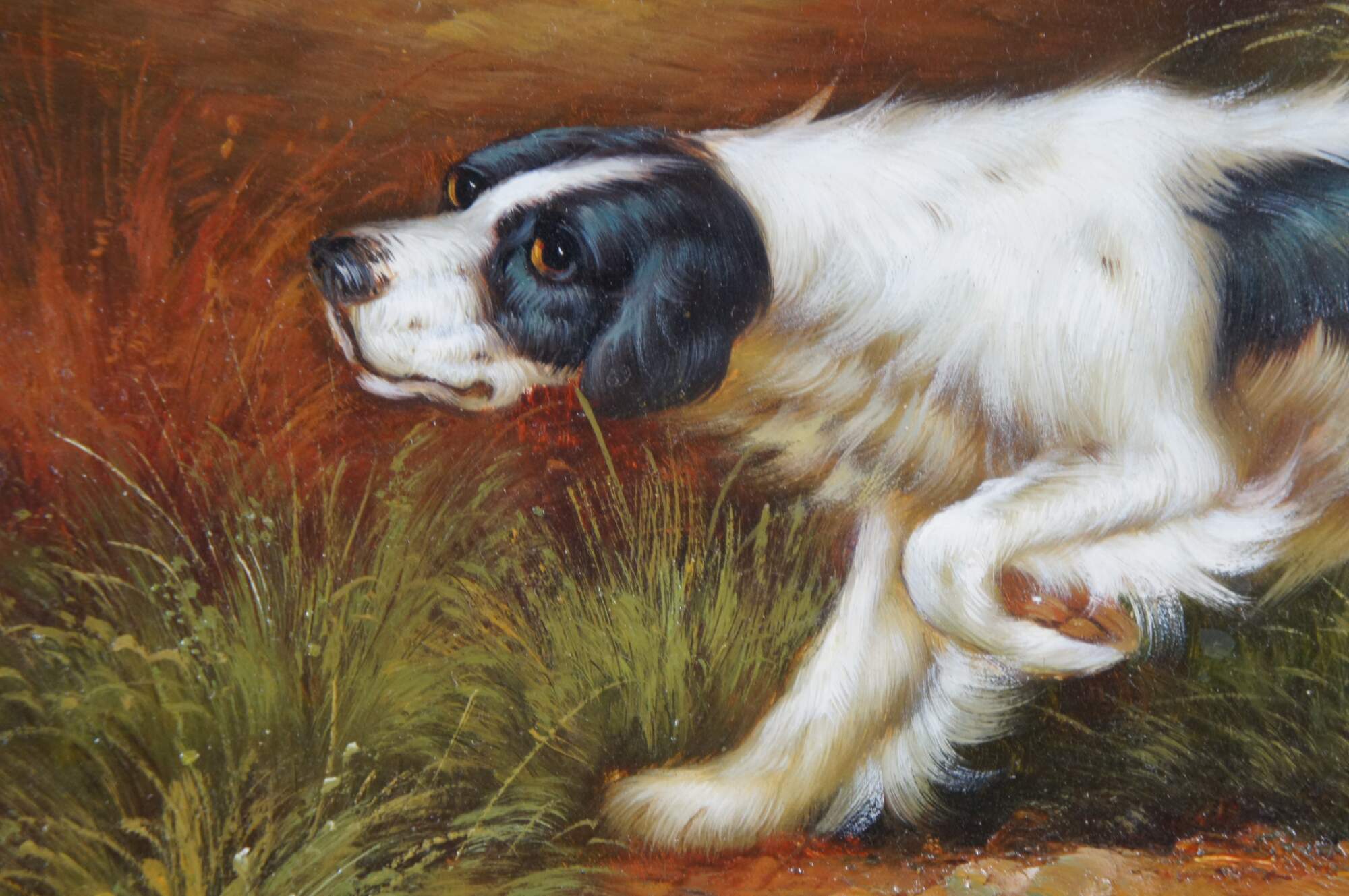 Vintage oil on board painting of a pair of British style hunting dogs / setters in an idyllic landscape. Set in an antique style, carved and deeply beveled giltwood frame with scalloped corners. Signed Evans in lower left, partially obscured by frame.