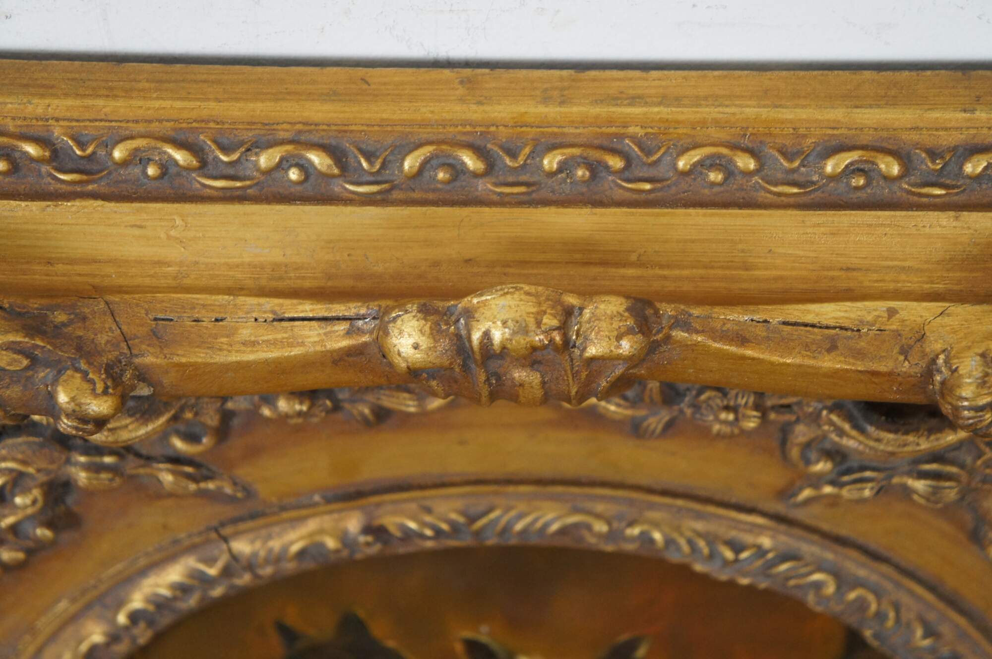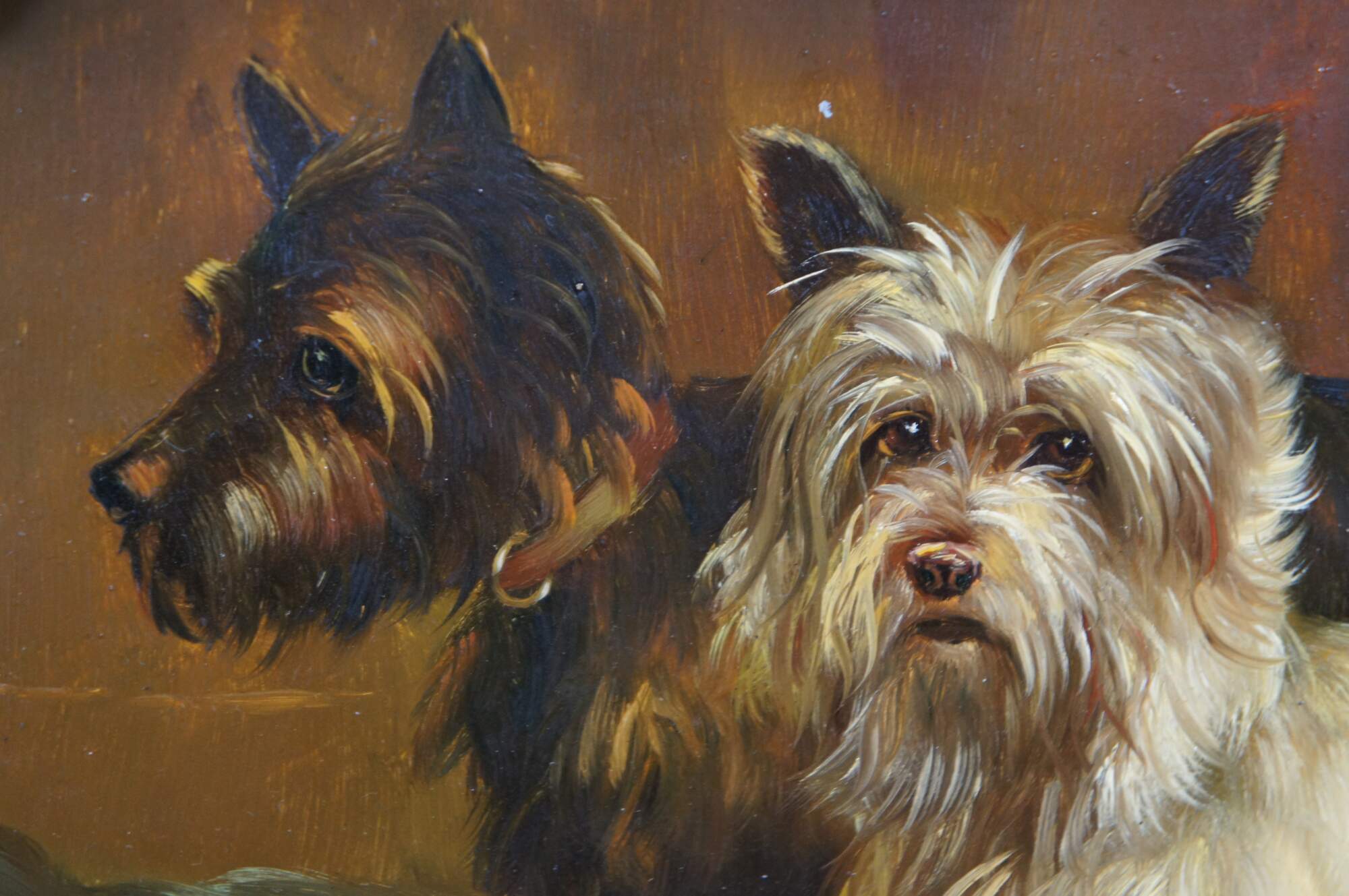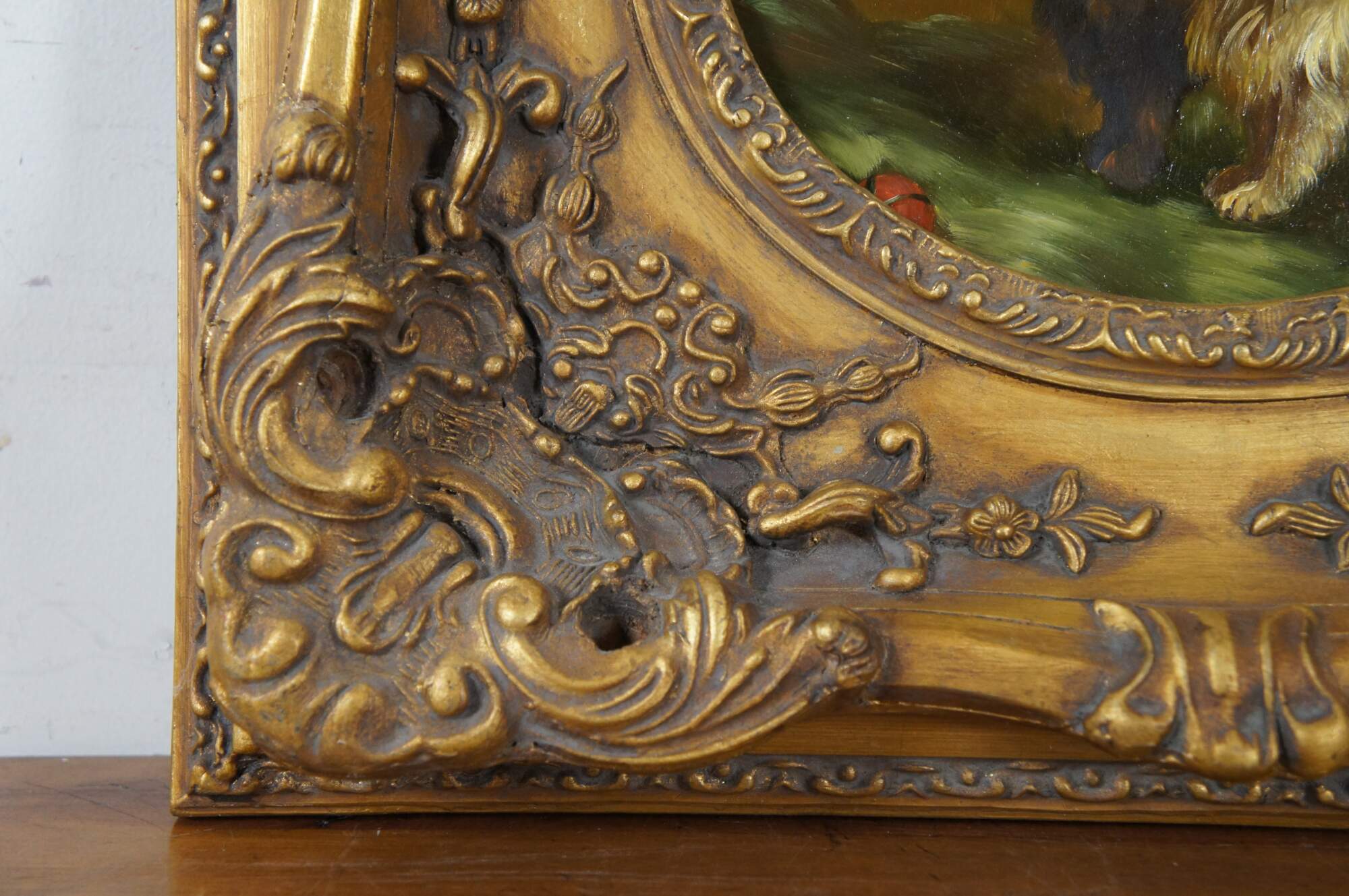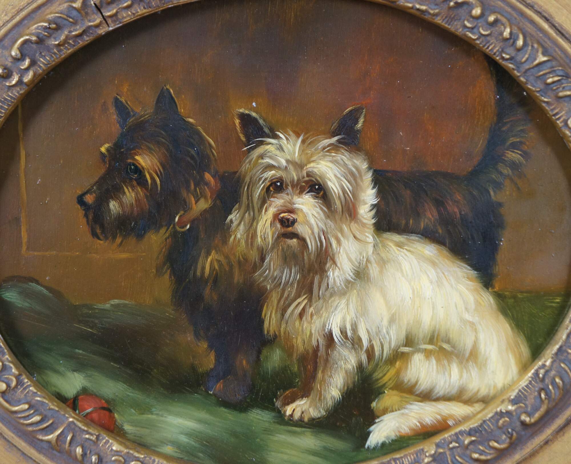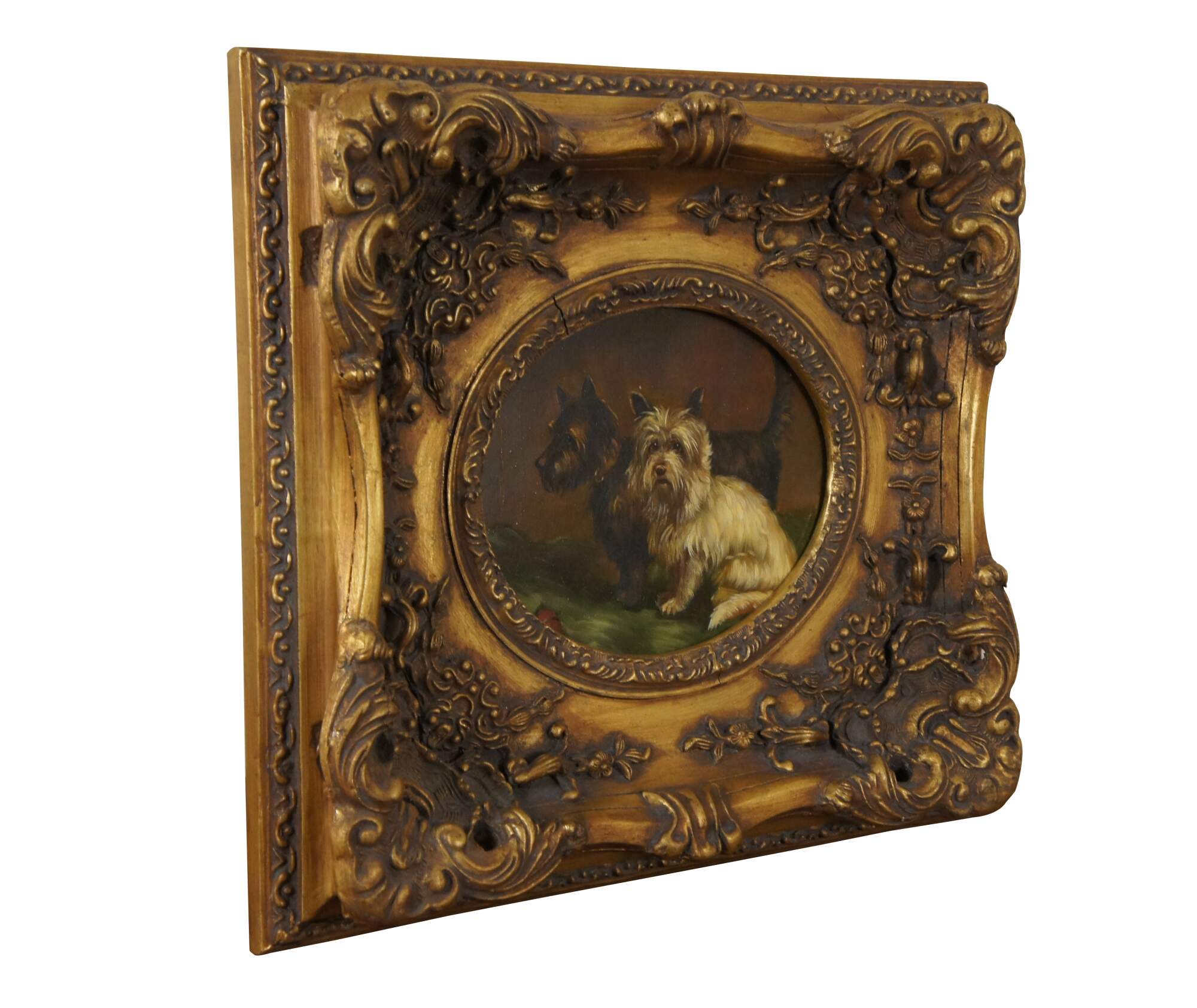 Vintage oval portait oil painting on board of a pair of Scottish Terriers seated on a green cloth. A tomato pin cushion is just visible along the lower edge. Set in a deeplay carved ornate giltwood frame.