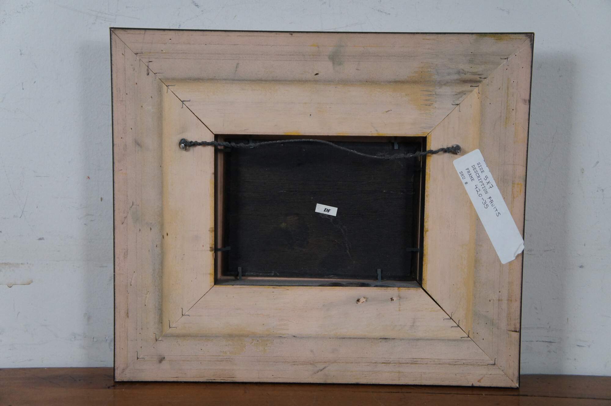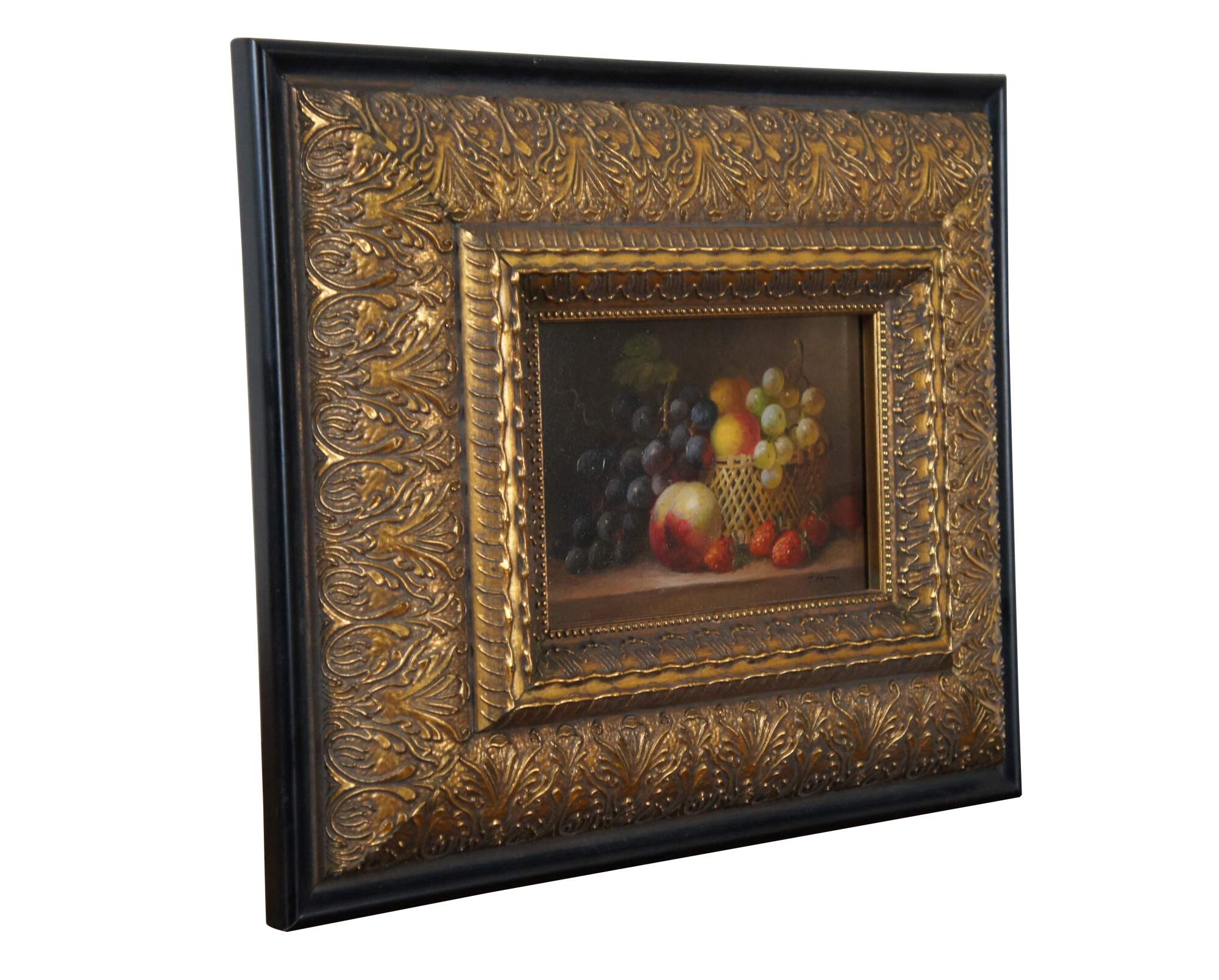 Vintage oil on board realistic miniature still life painting of grapes, peaches and strawberries in and around a basket on a table. Set in an ornately carved giltwood frame with a black edge. Signed T. Ferrai in lower right.