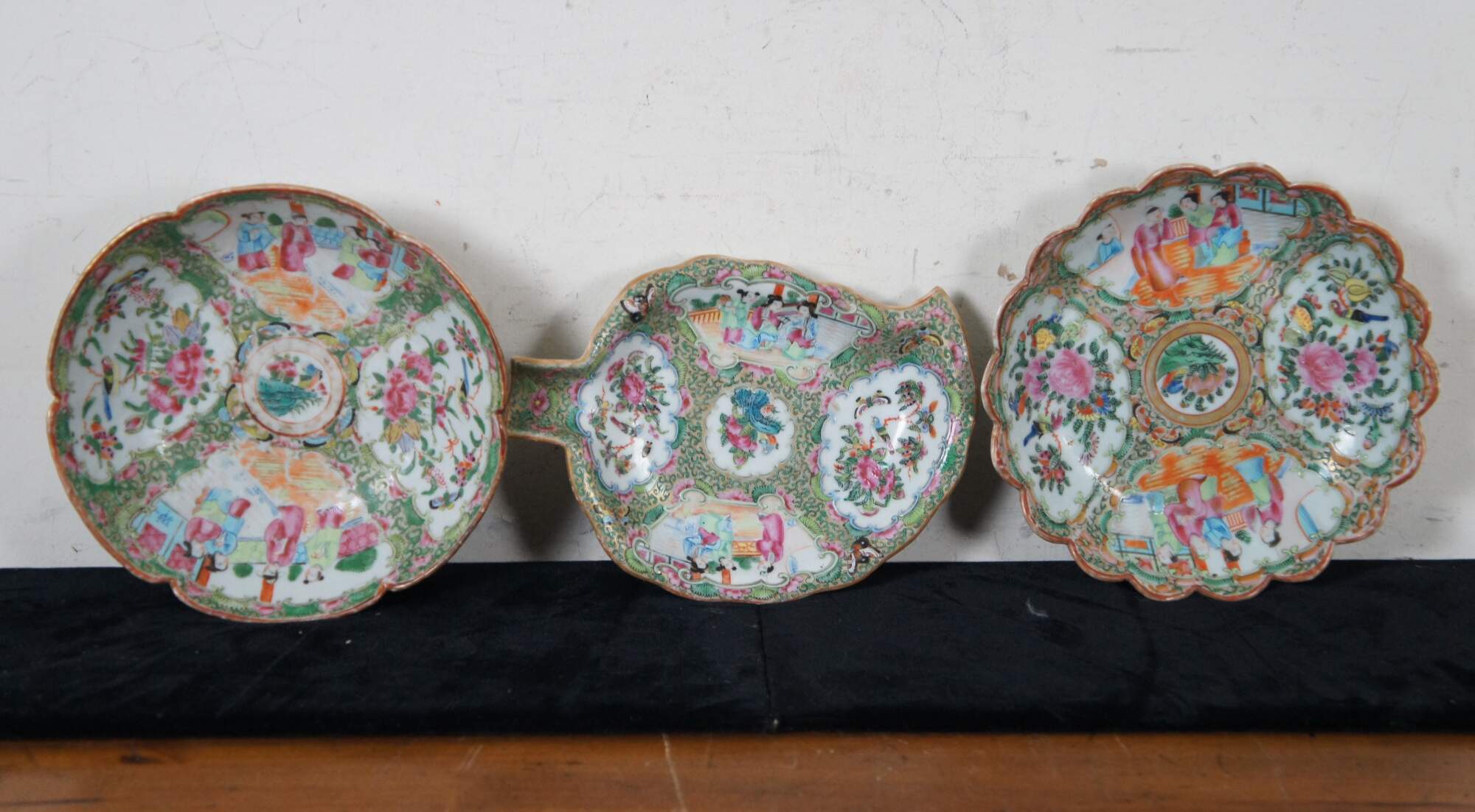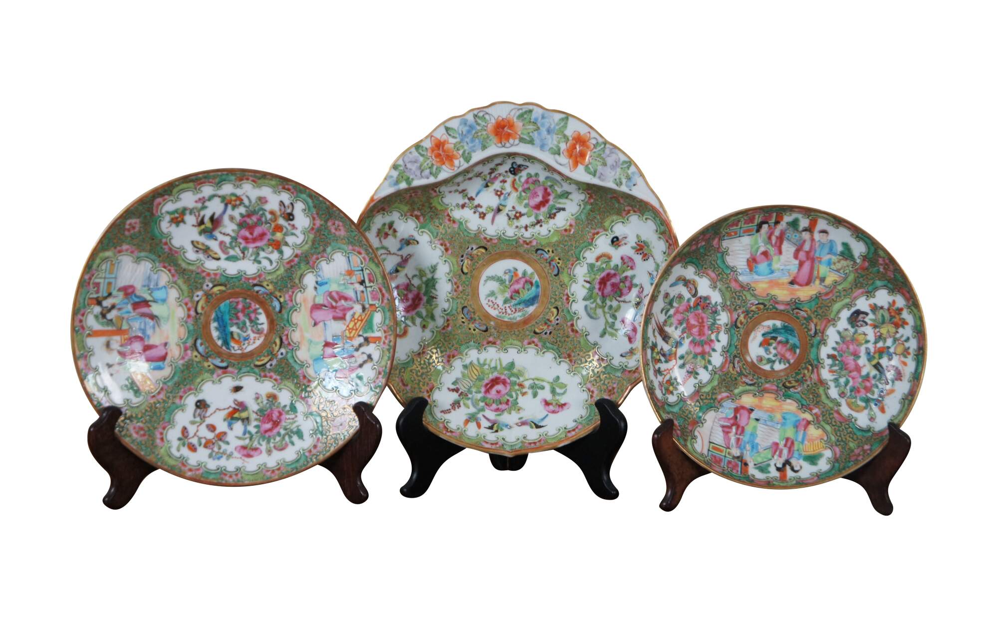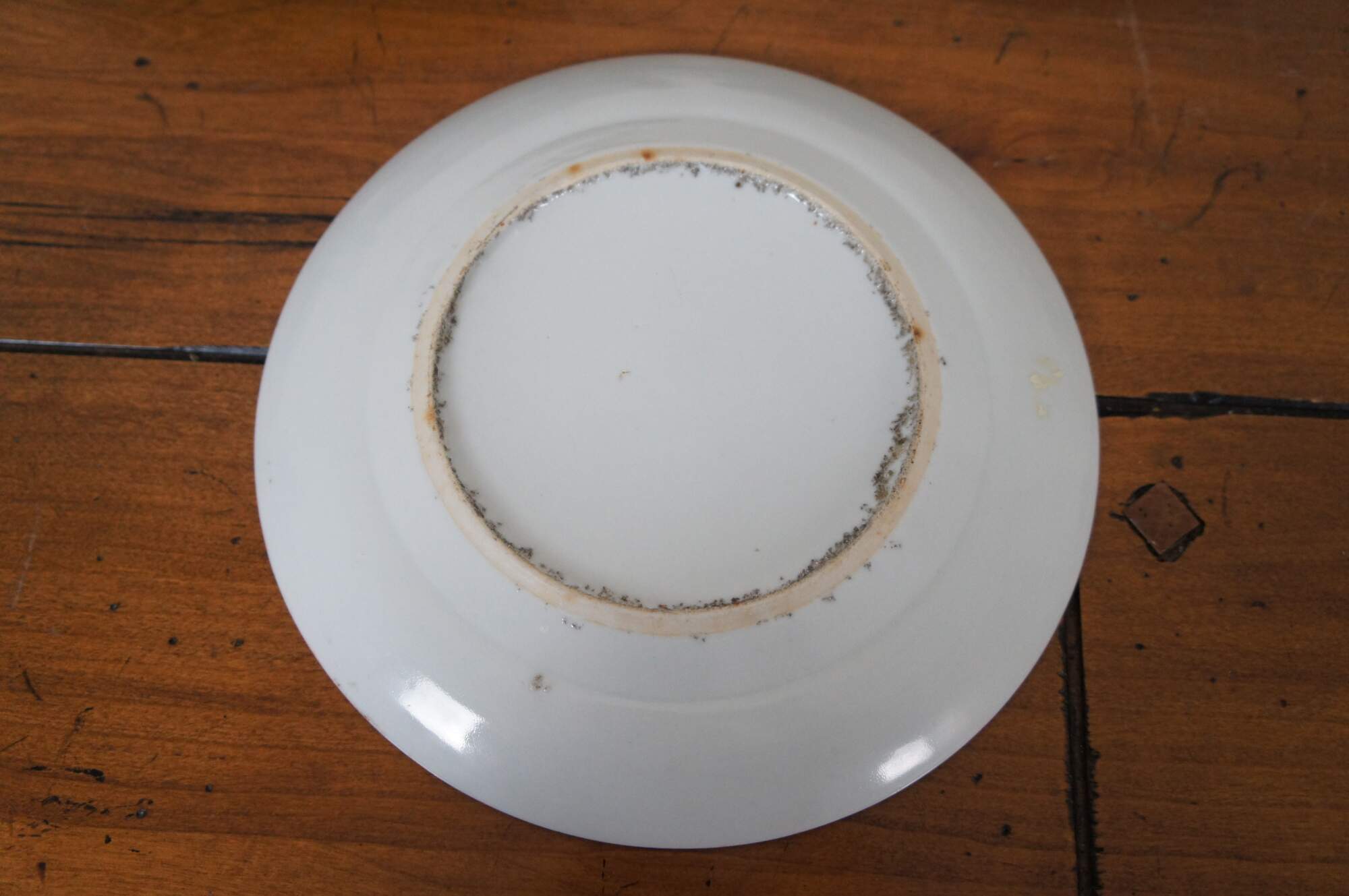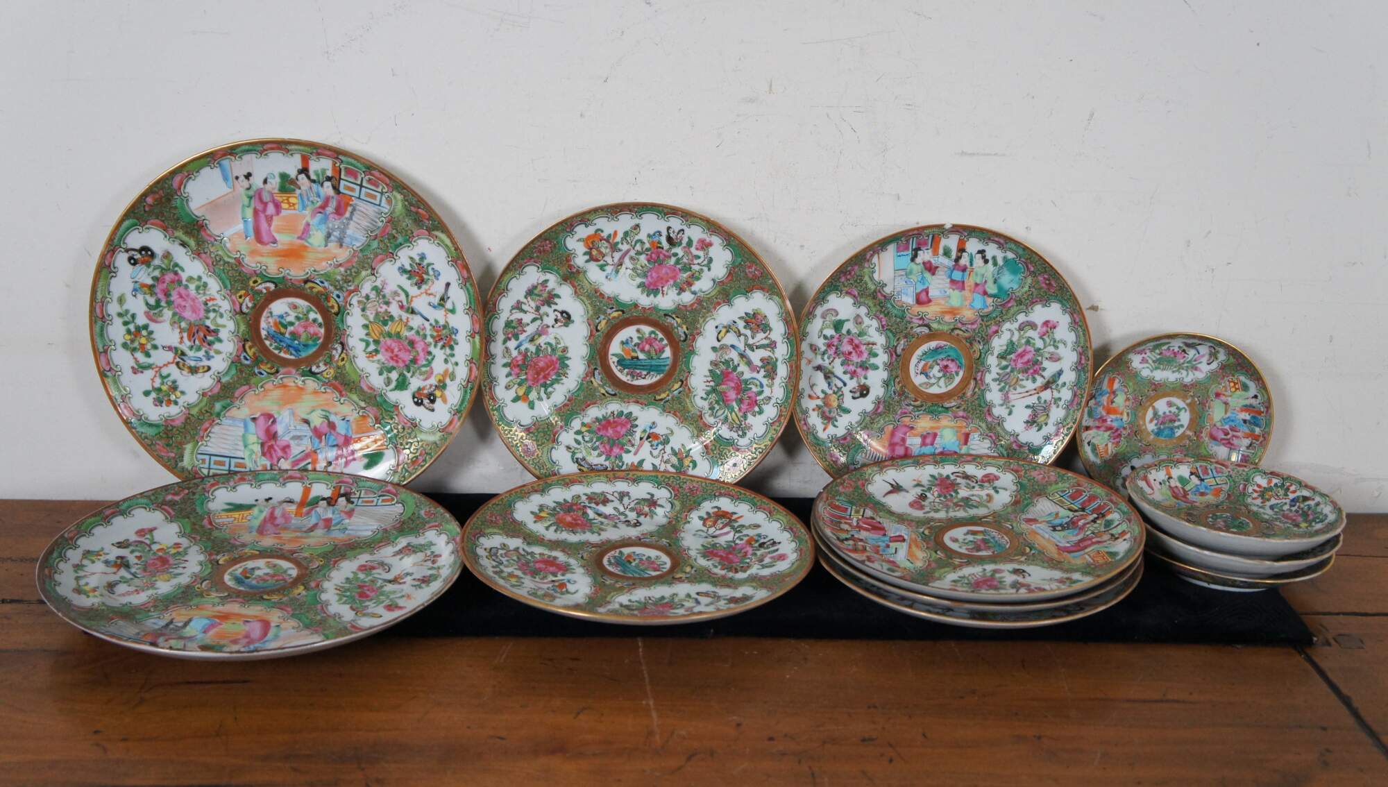Antique 32 piece Chinese Export porcelain china featuring the Famille Rose Mandarin pattern. Set features a ginger jar mantel urn, plates, platters, a vase, serving plates / trays, lidded dish and tea / coffee cups / saucers. Scenes feature Geishas, Pagodas, Greek Key, Flowers, Birds and Butteryflys / Insects.