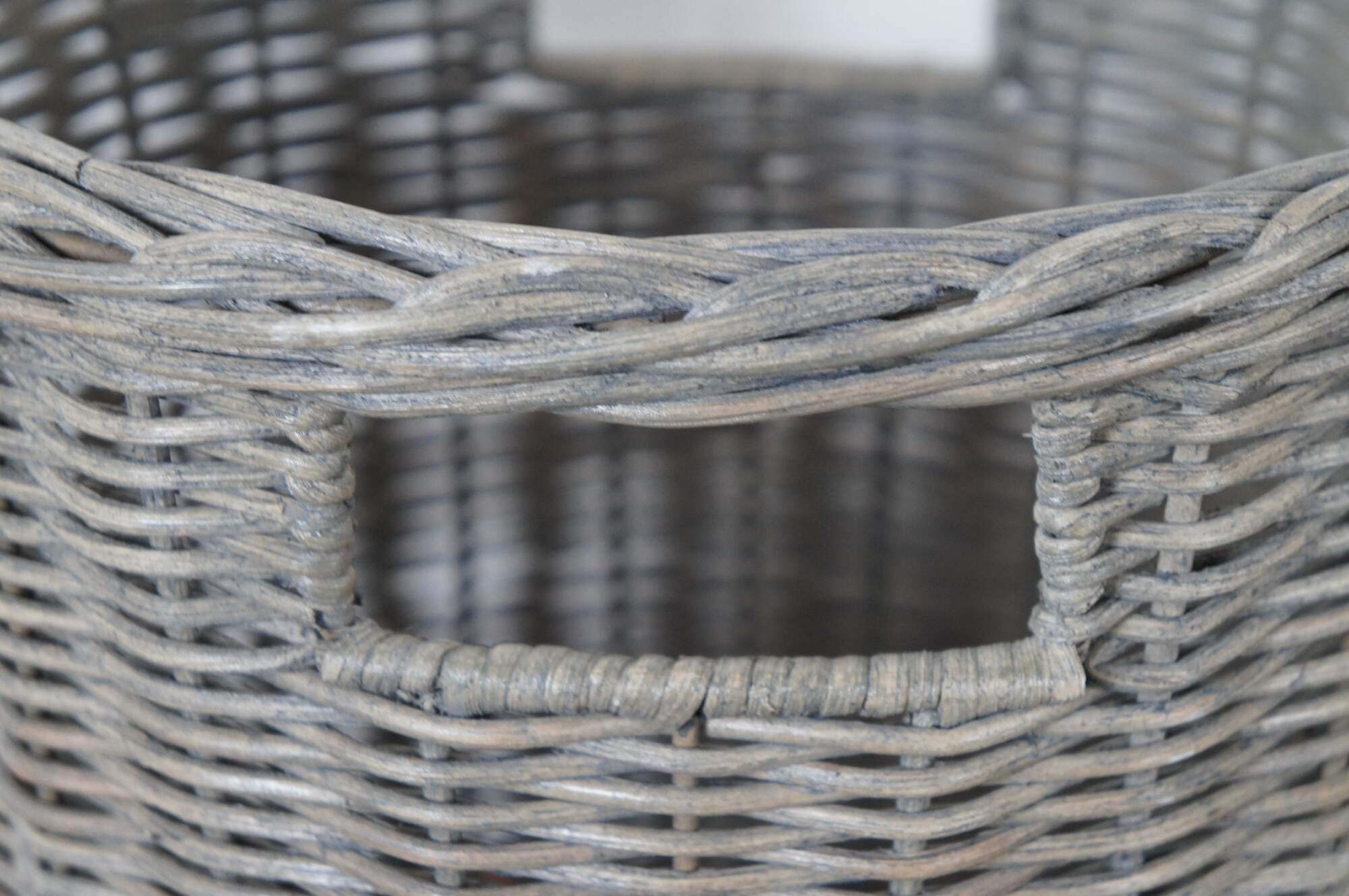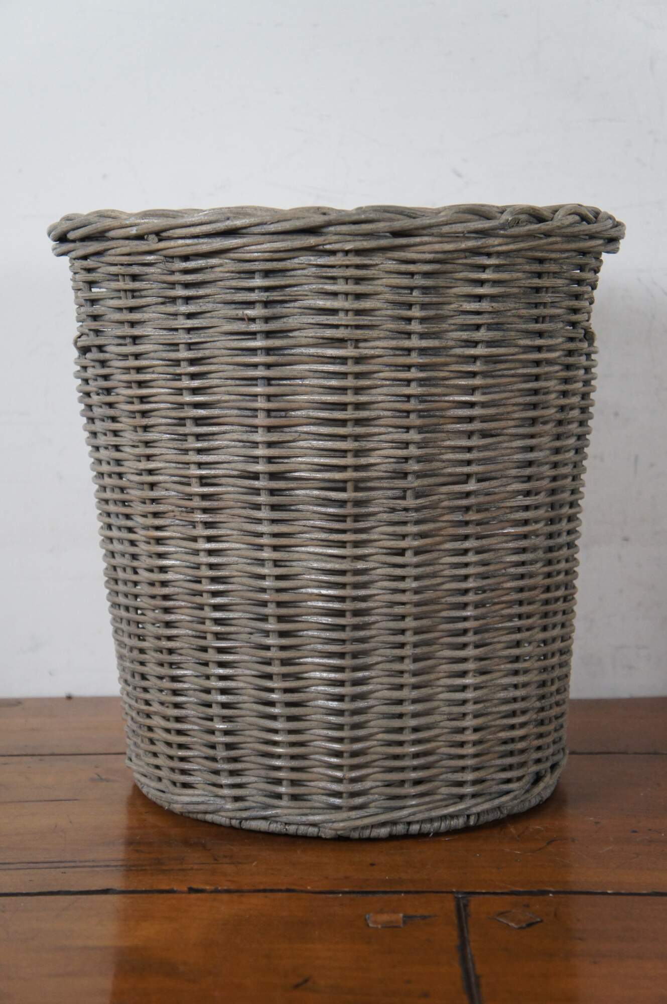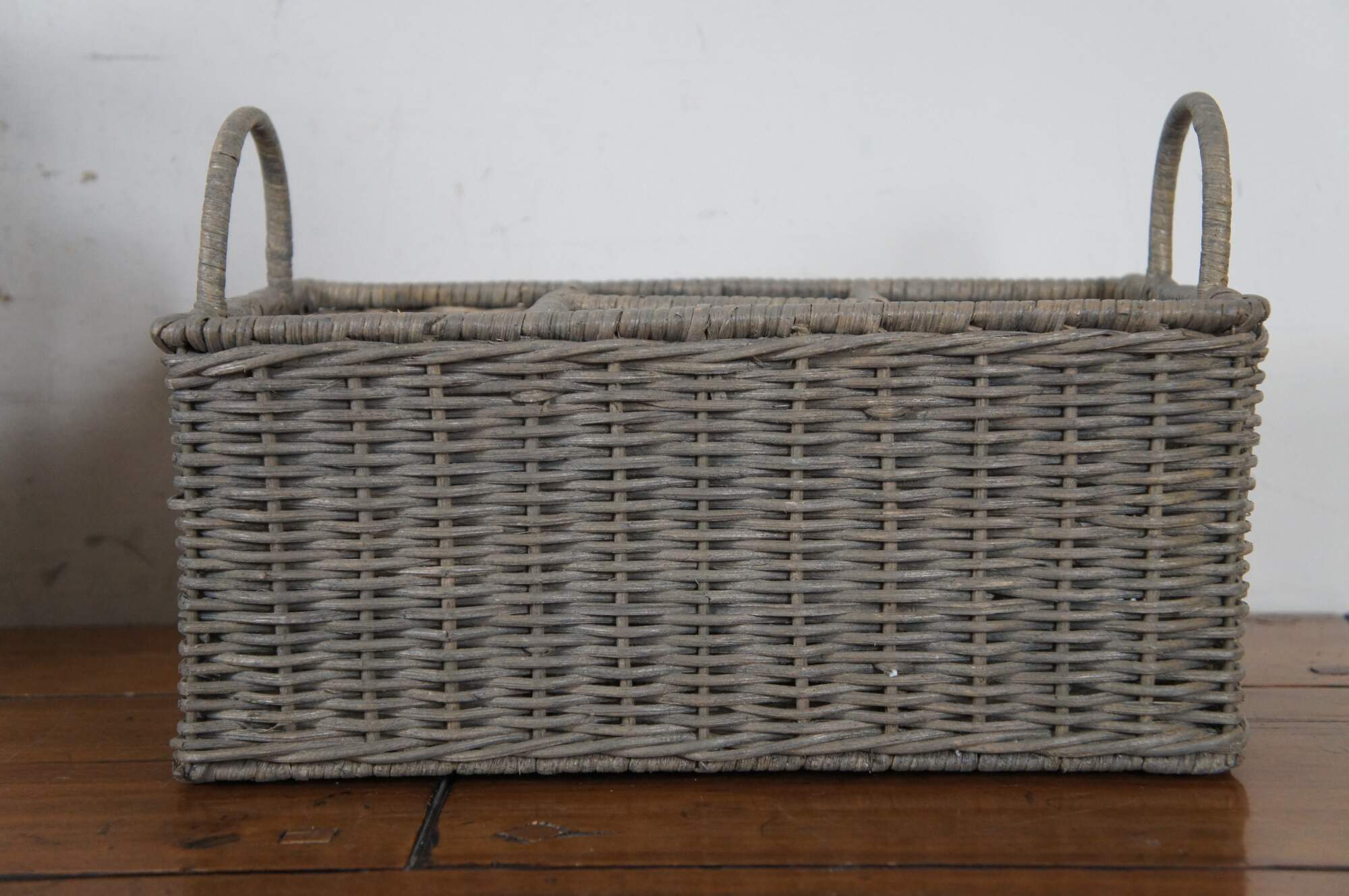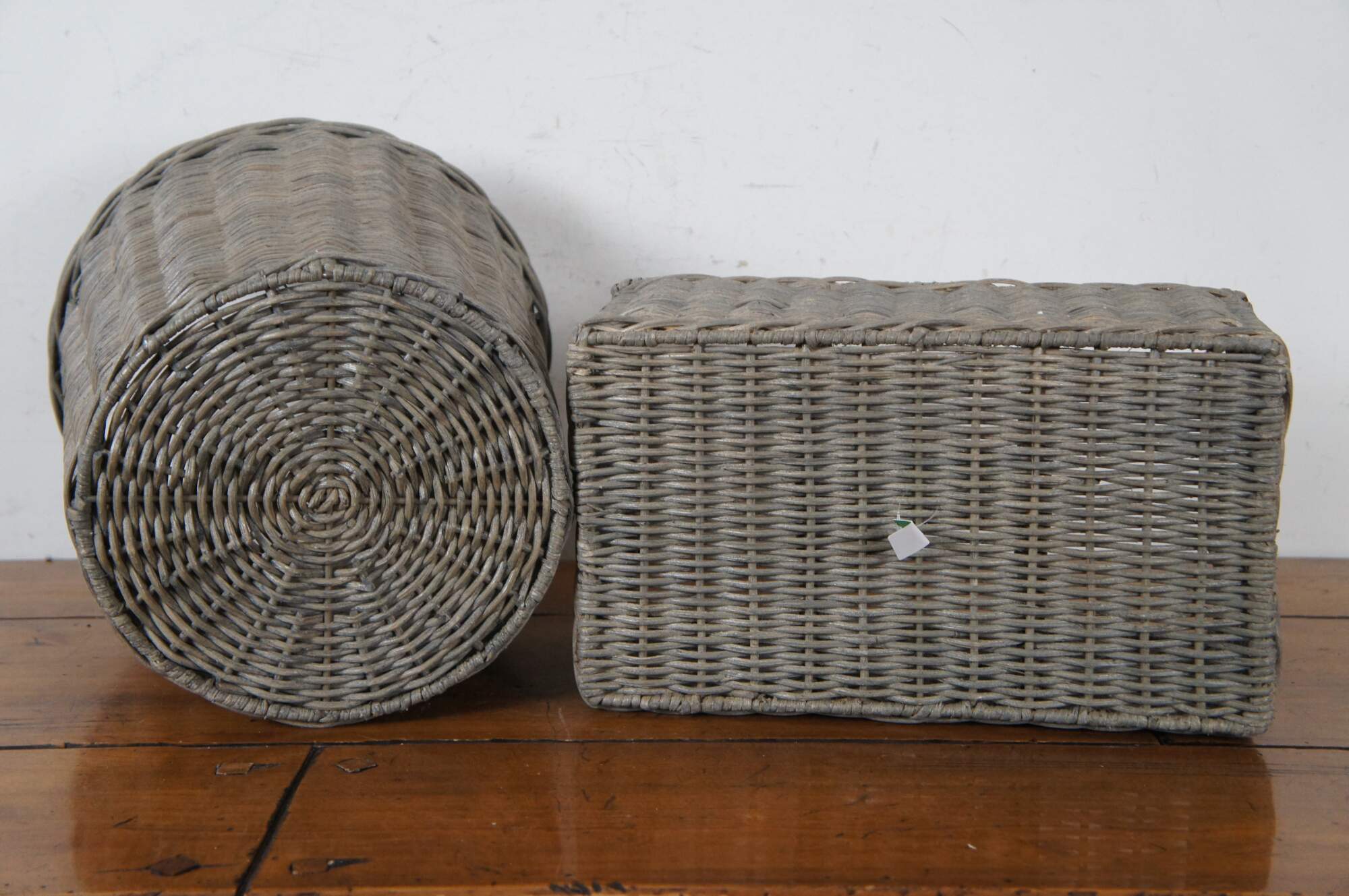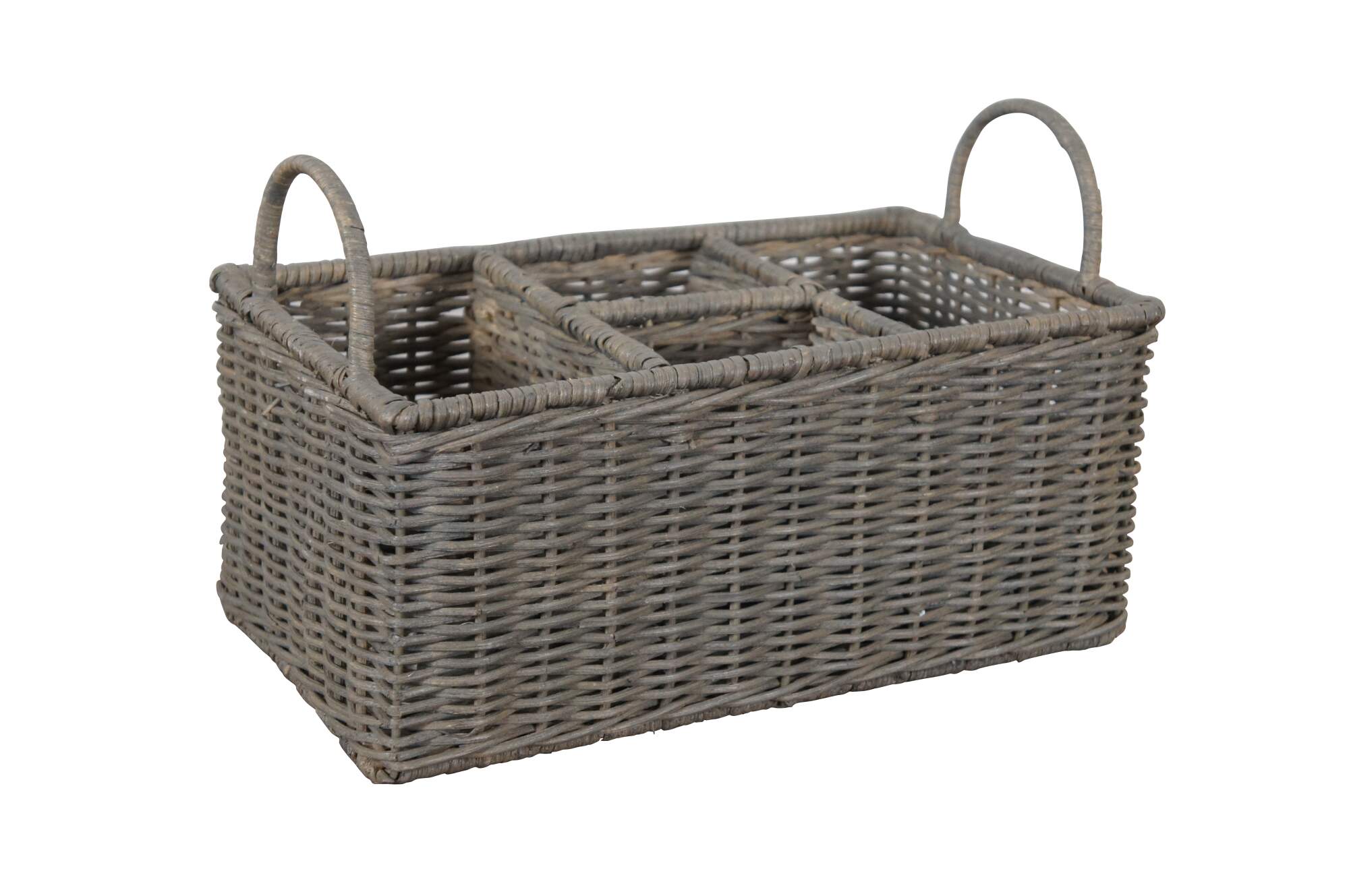 Both are woven from natural rattan with gray Ash finish. Waste basket / trash can is cylindrical with two cut out handles. Caddy / organizer is rectangular with two raised handles and four divided sections. Original Prices $99.00 / $89.00.