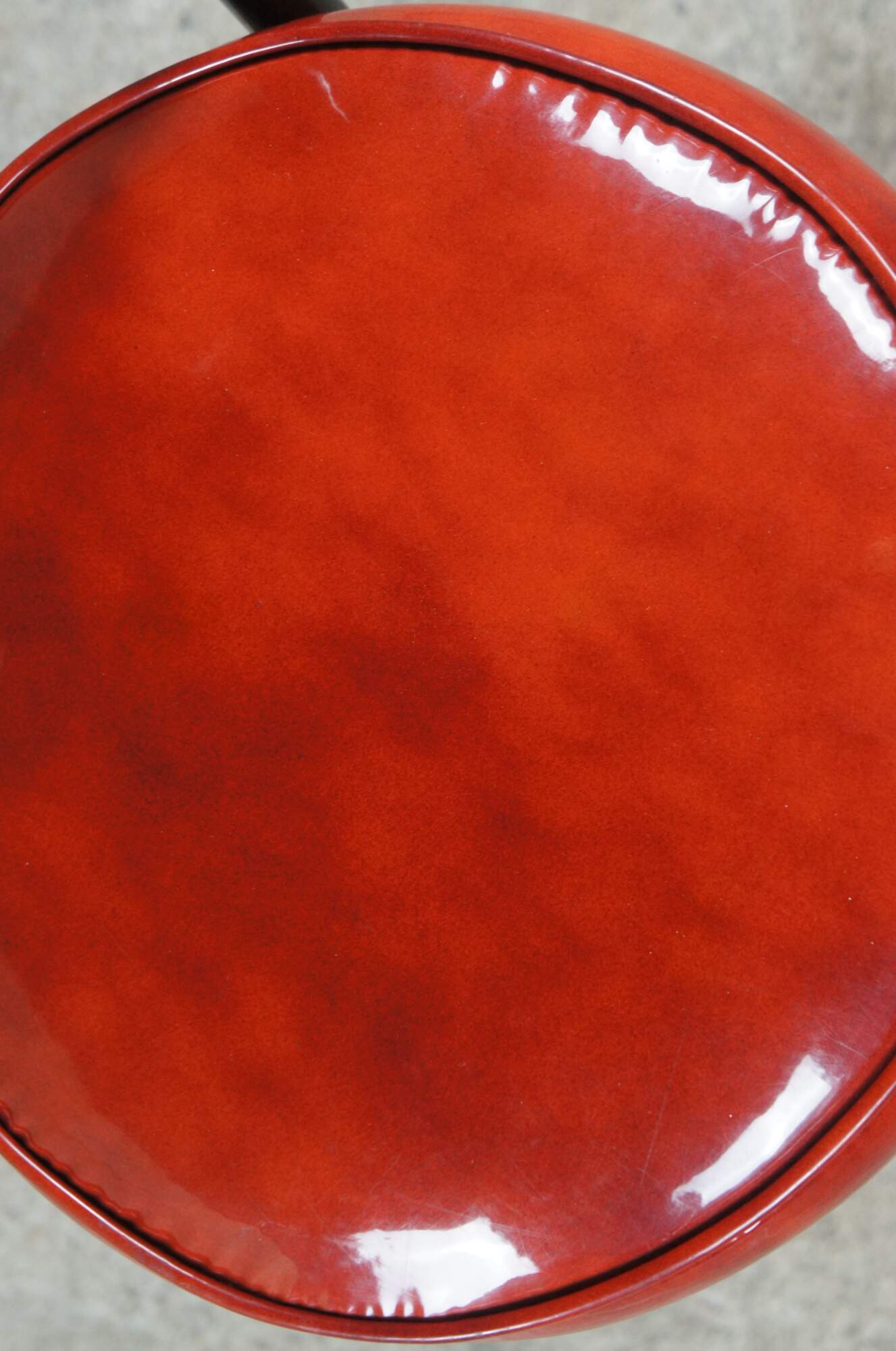 Set of 4 of Late Art Deco Retro Soda / Fountain stools by Chromodern (no. 14). Made with a baked enamel fiinish over aluminumn base and red seats. Each stool swivels.