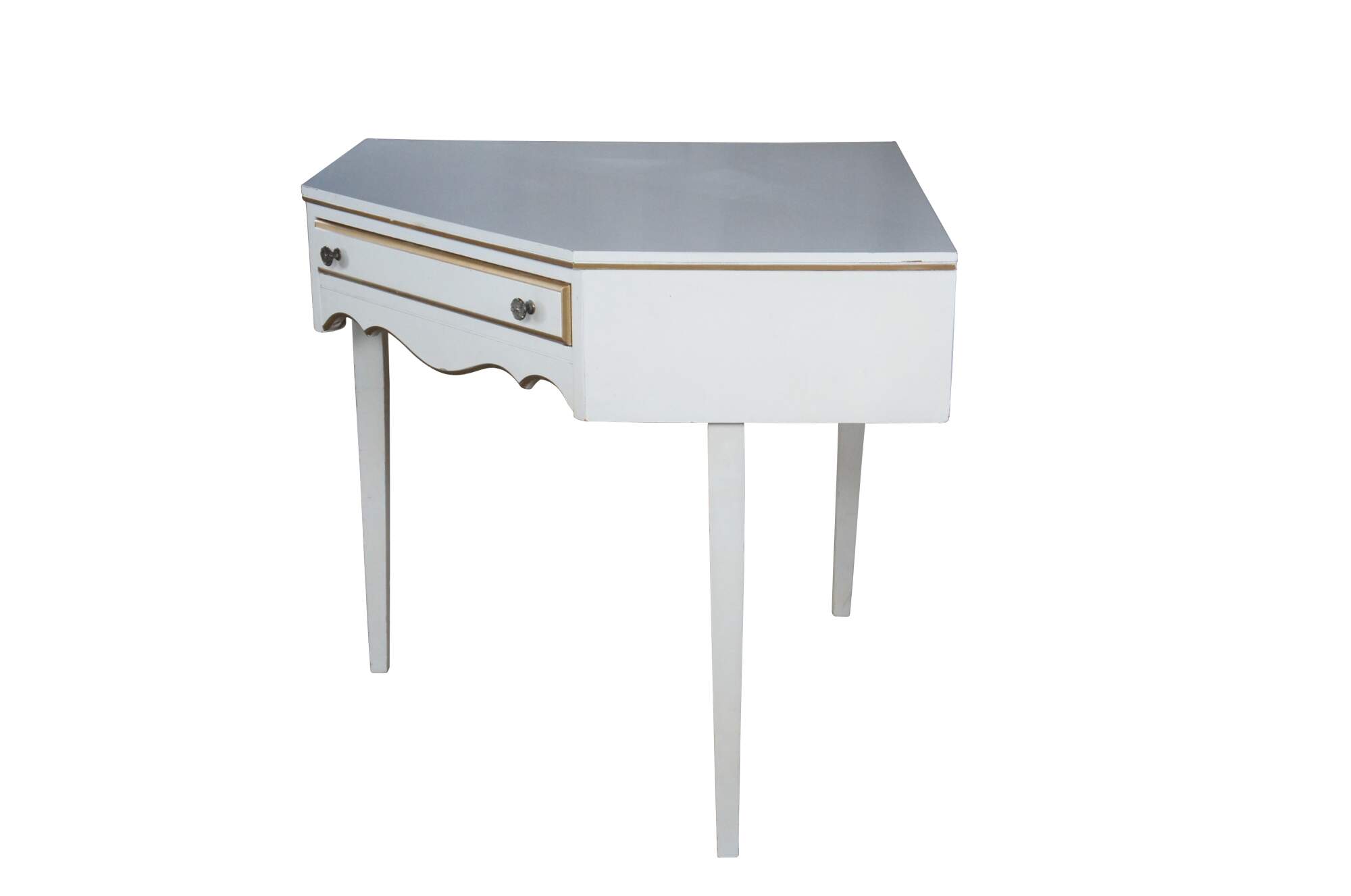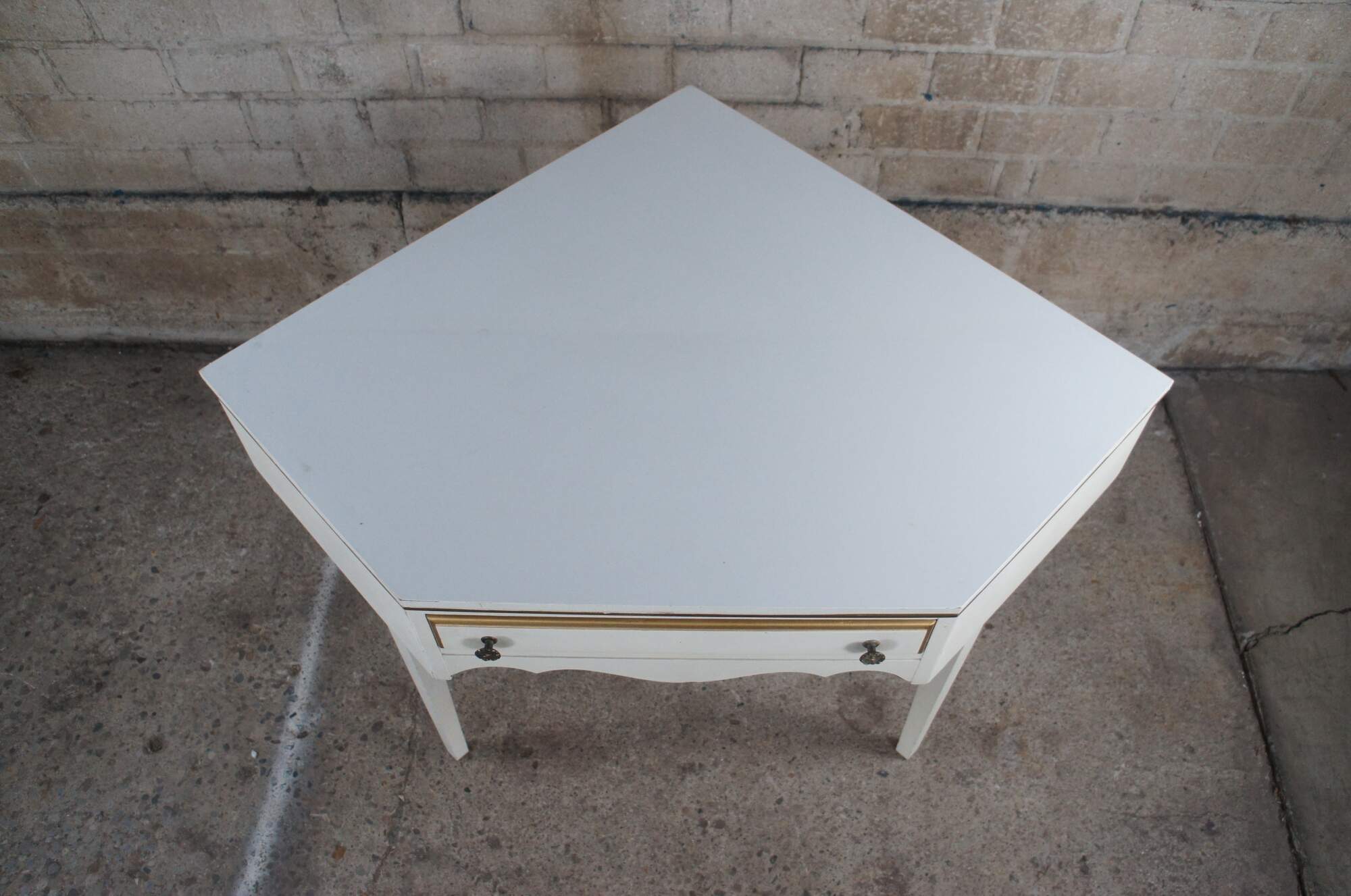 Intriguing French Provincial Corner desk or side table, circa 1970s. Features a central dovetailed drawer and work surface Supported by square tapered legs. Believed to be Kindel Furniture out of Grand rapids, Mi