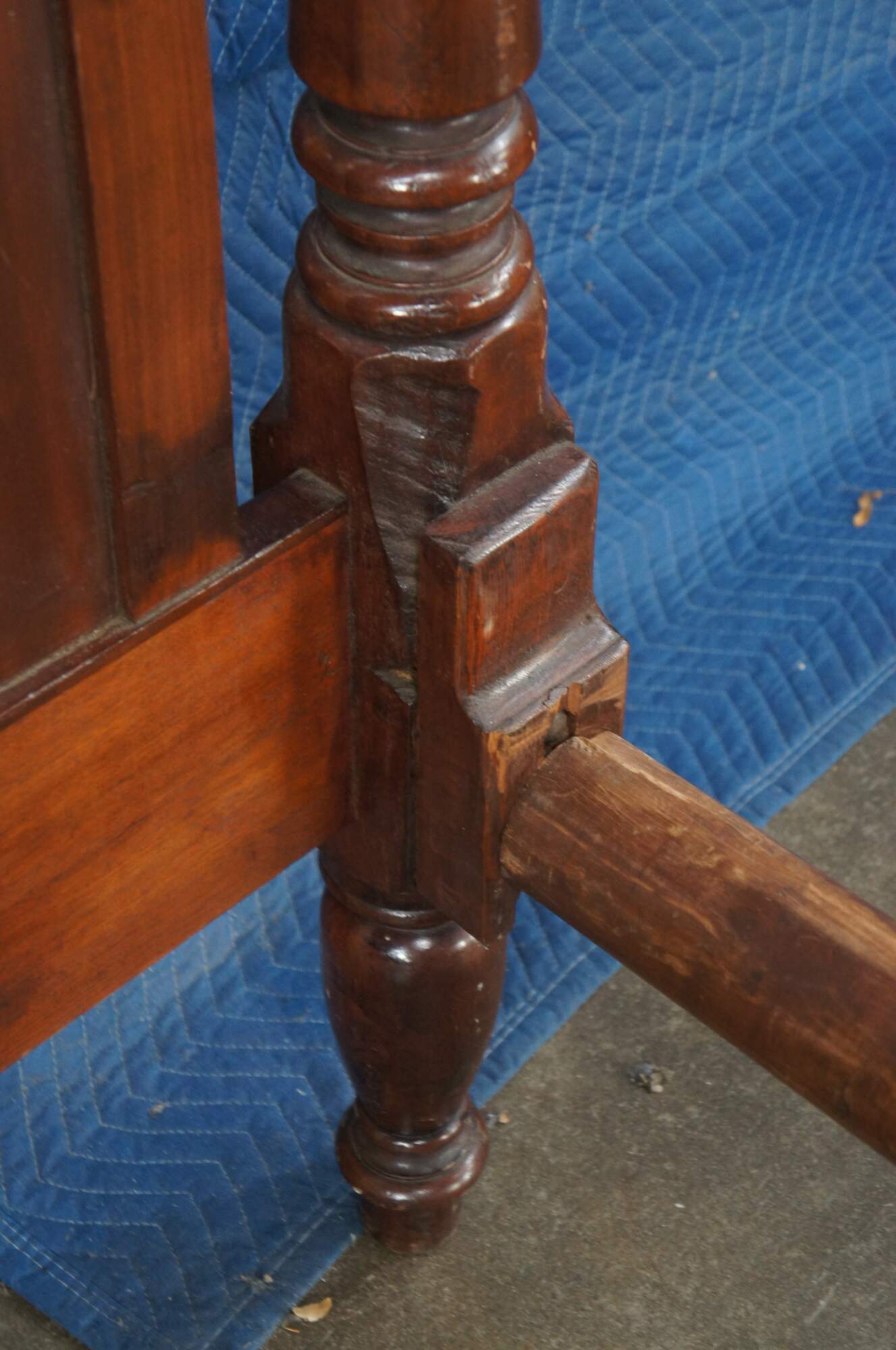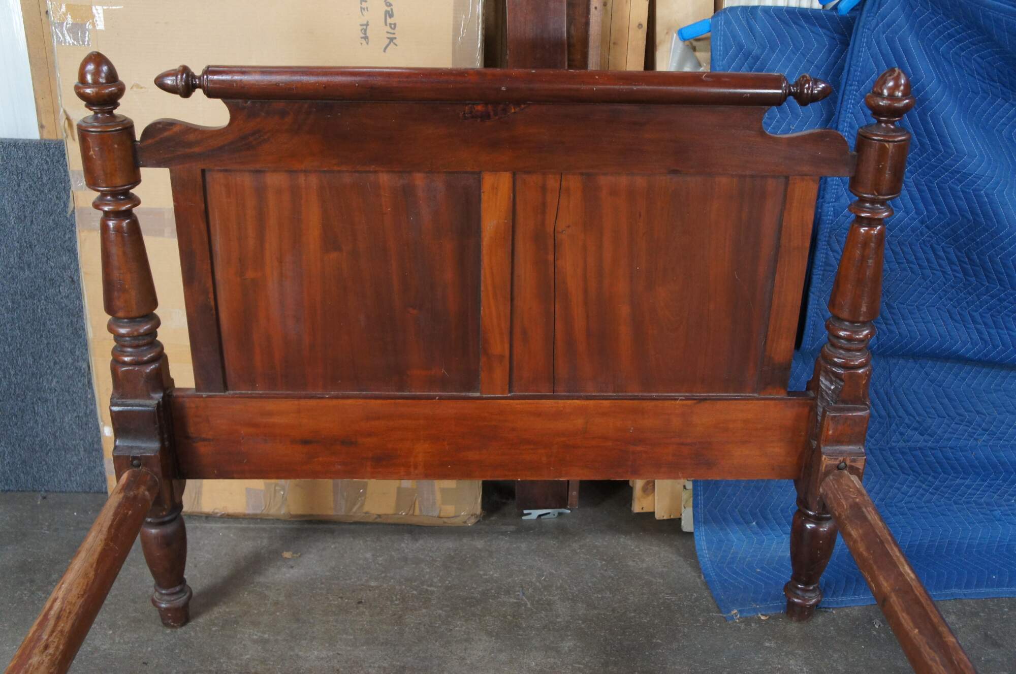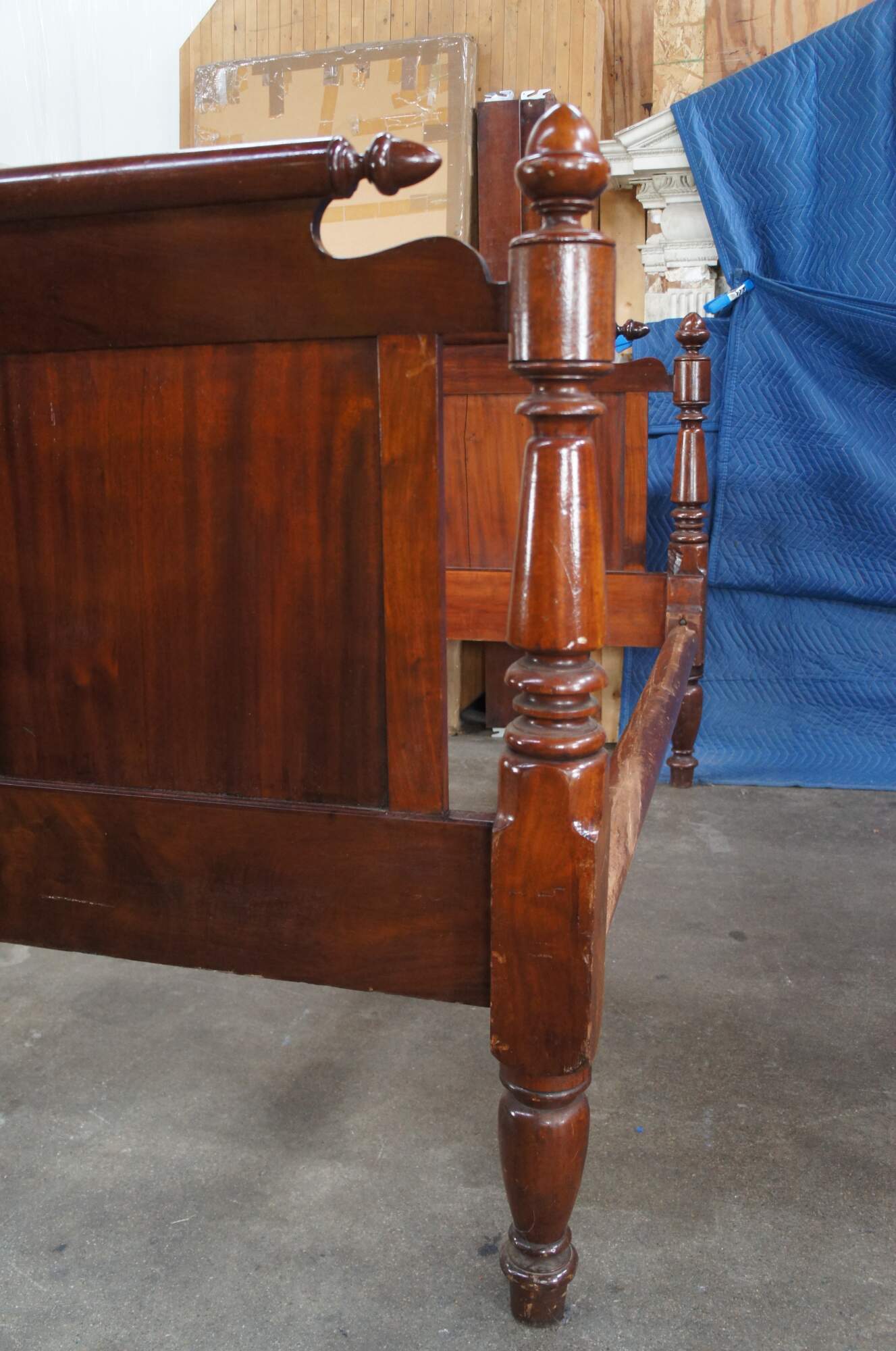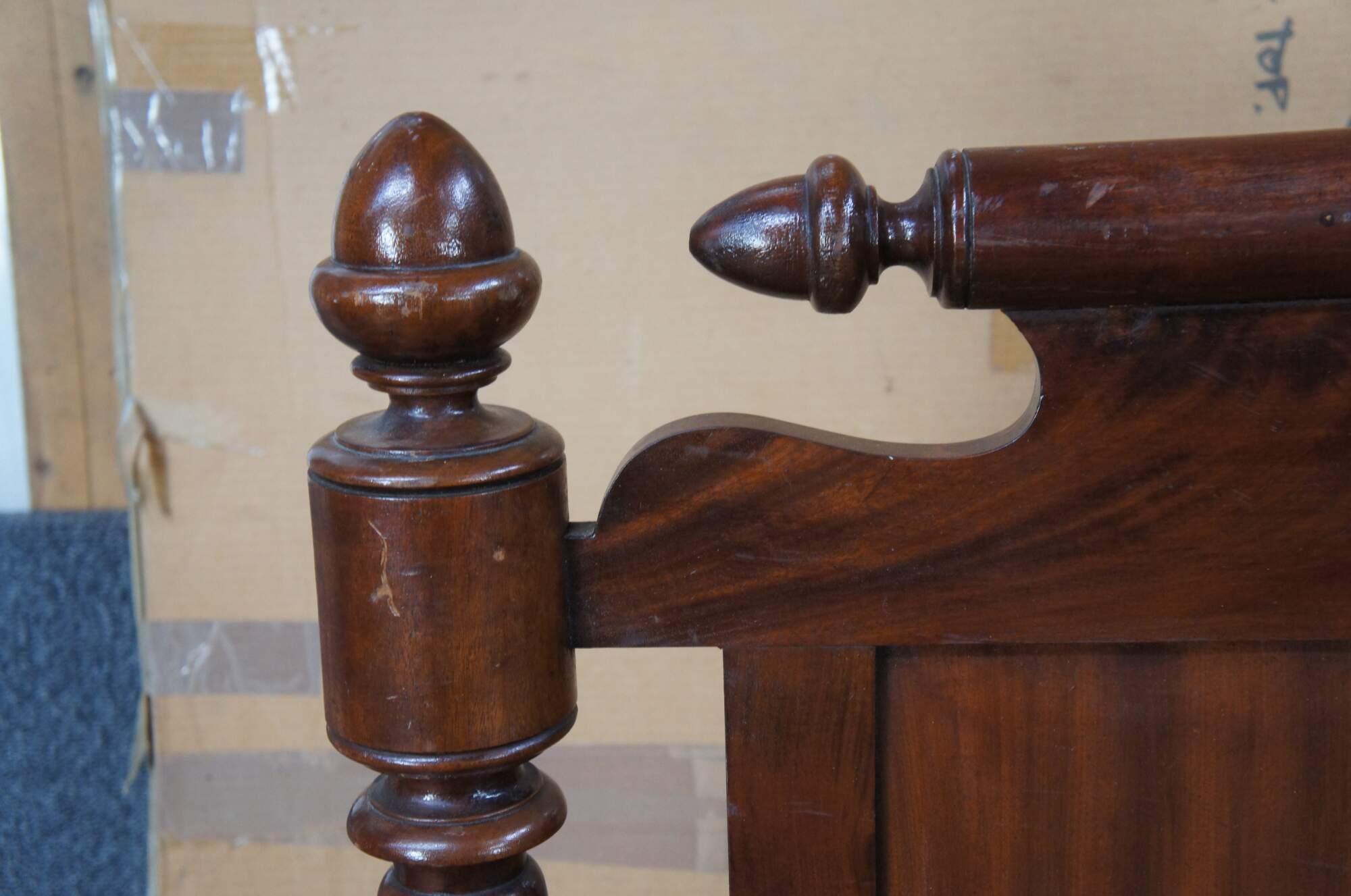 Early 19th century Sheraton Period poster bed. Made from mahogany with hand turned posts and acorn finials. Unique mechanism allows slats turn into place via wooden thread. Can be used with a full size mattress. Supports or plywood will need to be cut to go across the slats to support a matress.