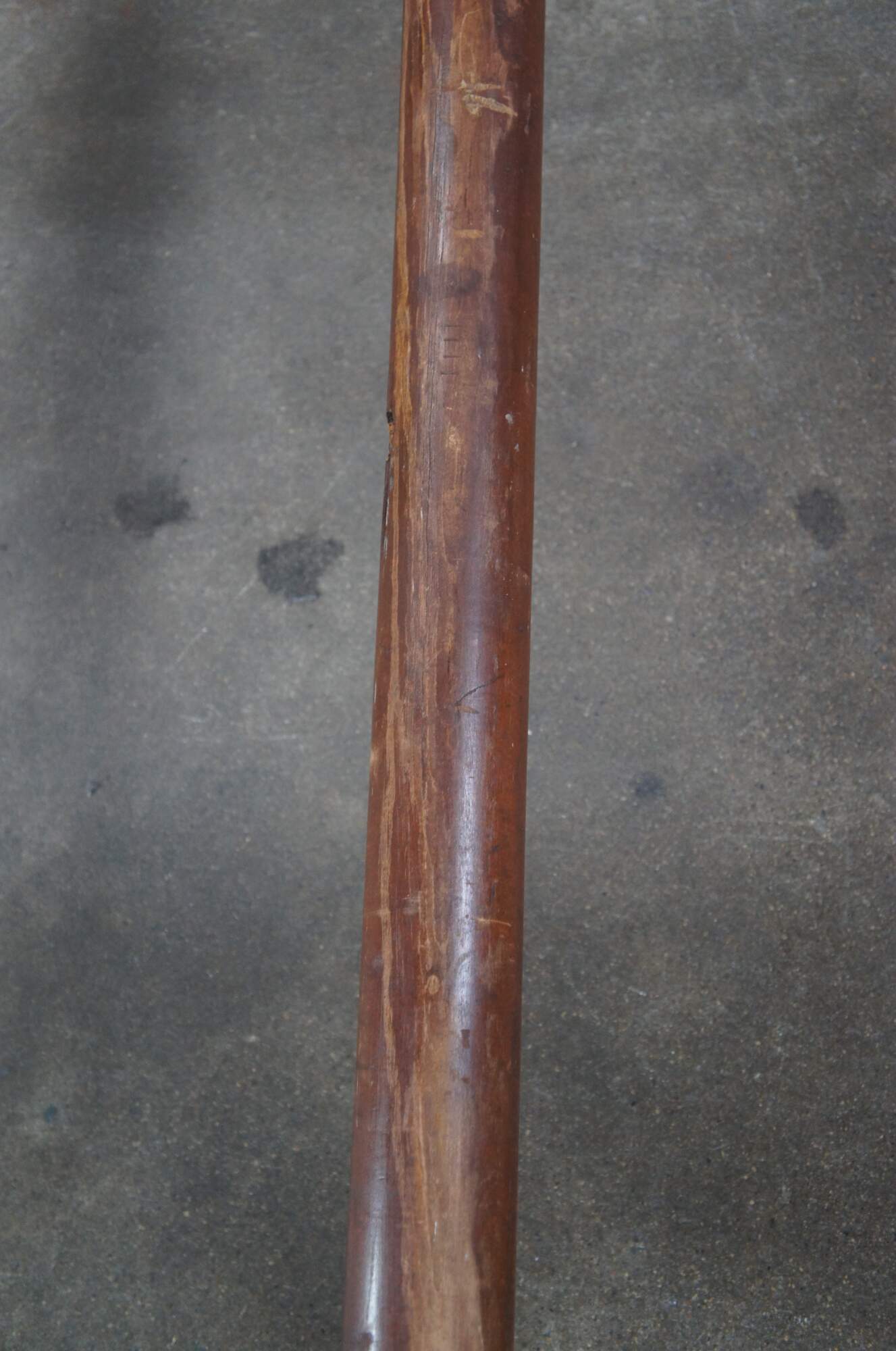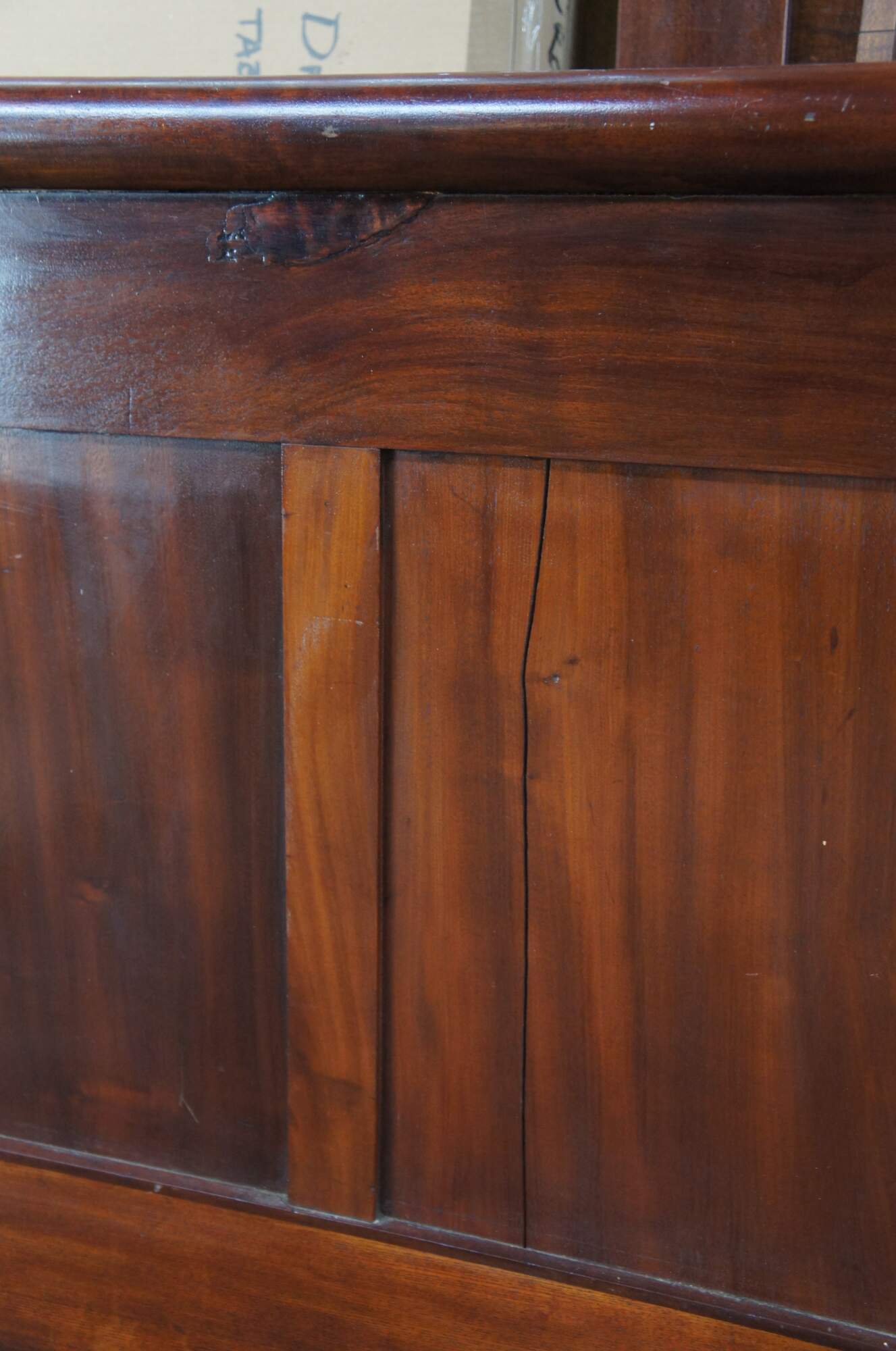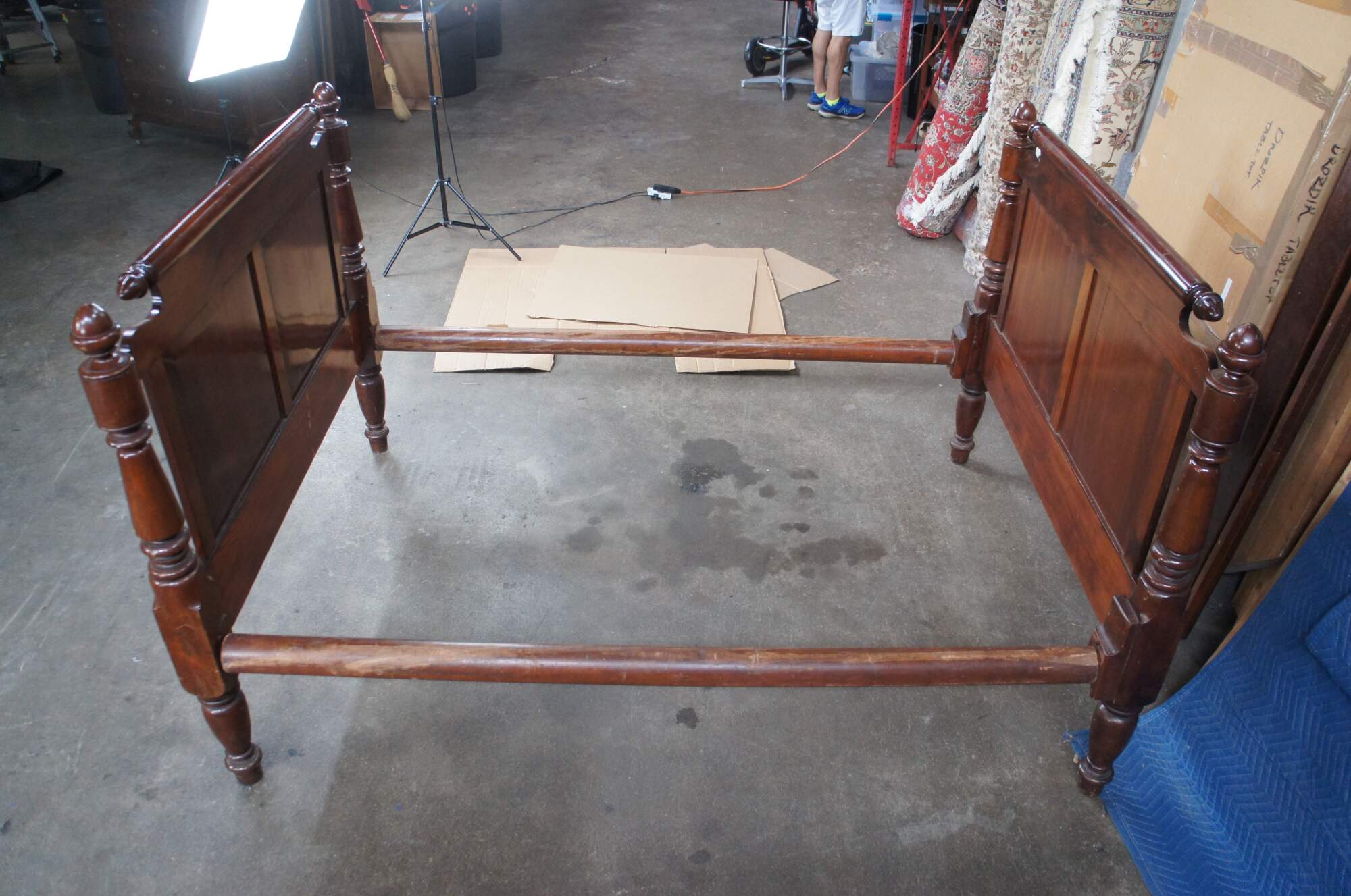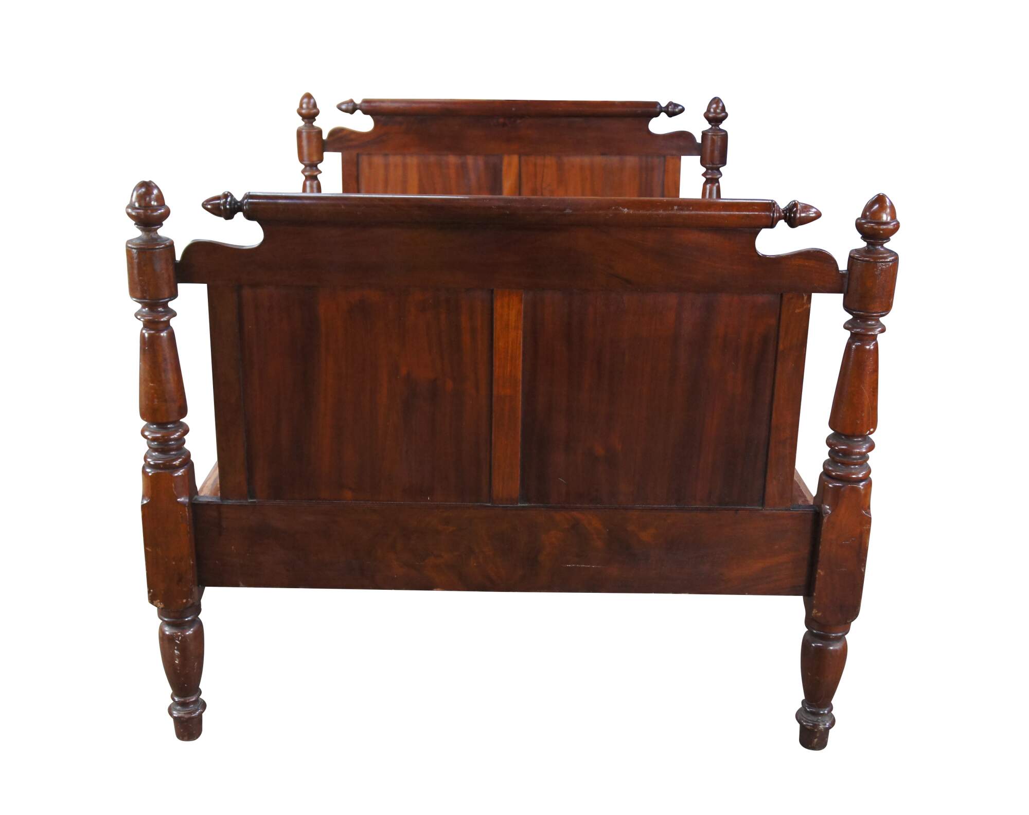 Early 19th century Sheraton Period poster bed. Made from mahogany with hand turned posts and acorn finials. Unique mechanism allows slats turn into place via wooden thread. Can be used with a full size mattress. Supports or plywood will need to be cut to go across the slats to support a matress.