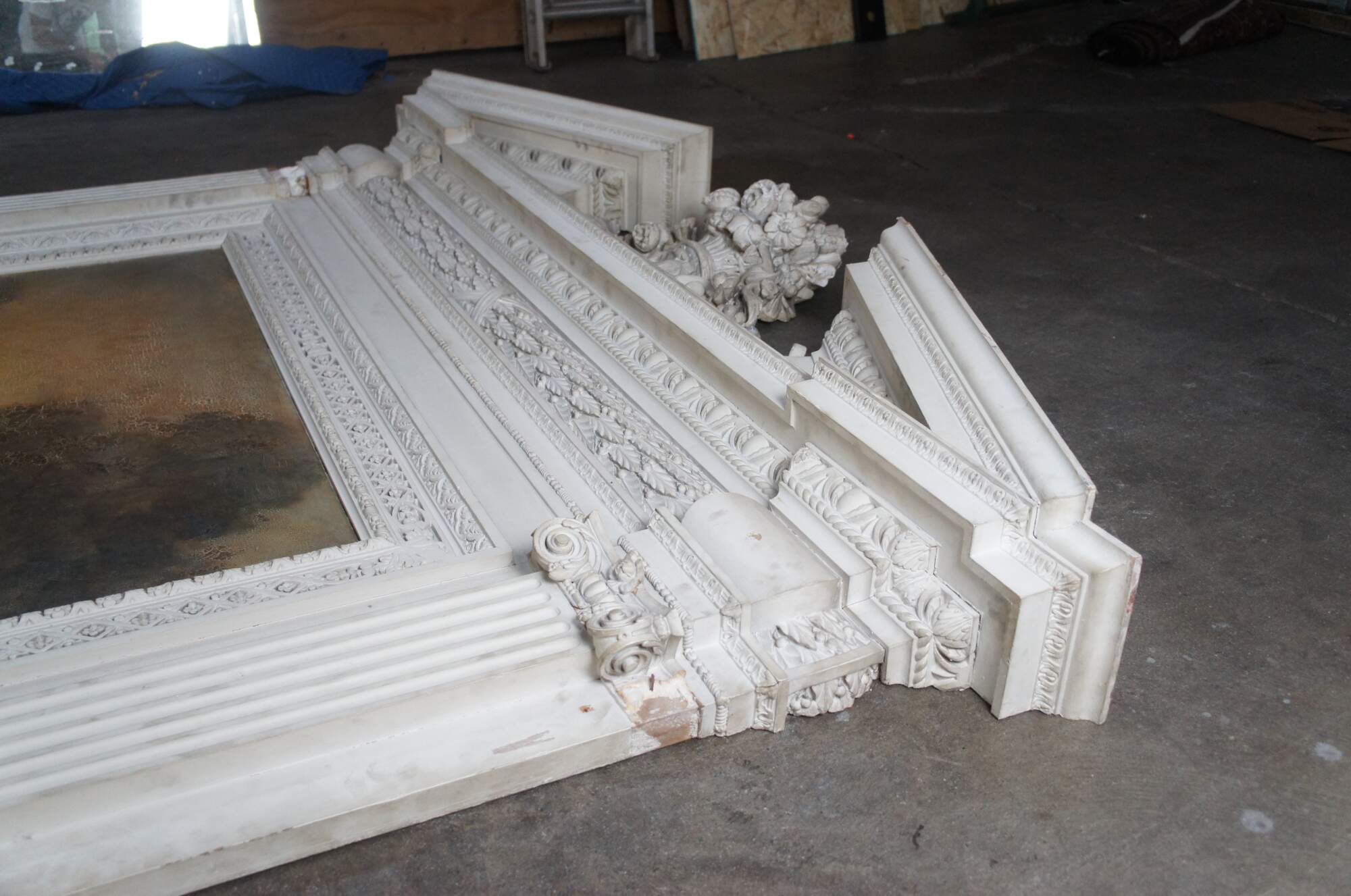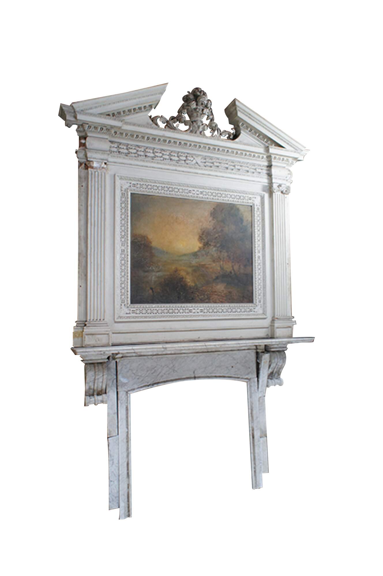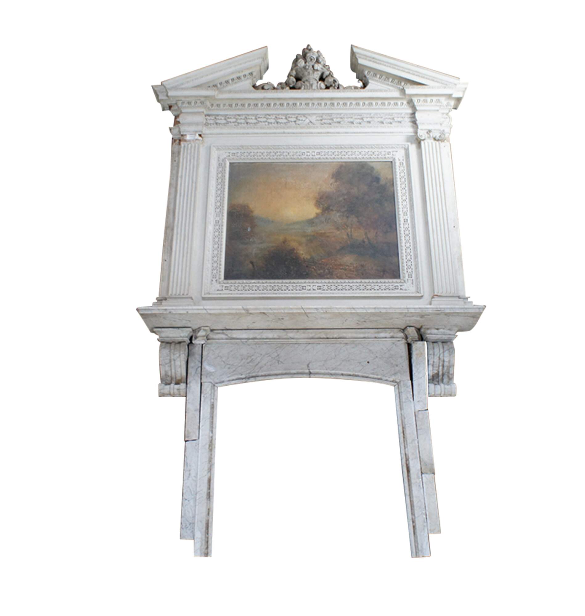 A very large and impressive fireplace mantel with Neoclassical and Grecian styling that features an impressive carved over mantel with open pediment design and ornate flower urn with acanthus accents. Features fluted columns, egg and dart molding, a sheath of wheat with ribbon, and carved reticulated flowers framing the 19th century impressionist landscape oil painting. The fireplace mantel and surround are made from Carrera marble mantel and paneling surround the fireplace
