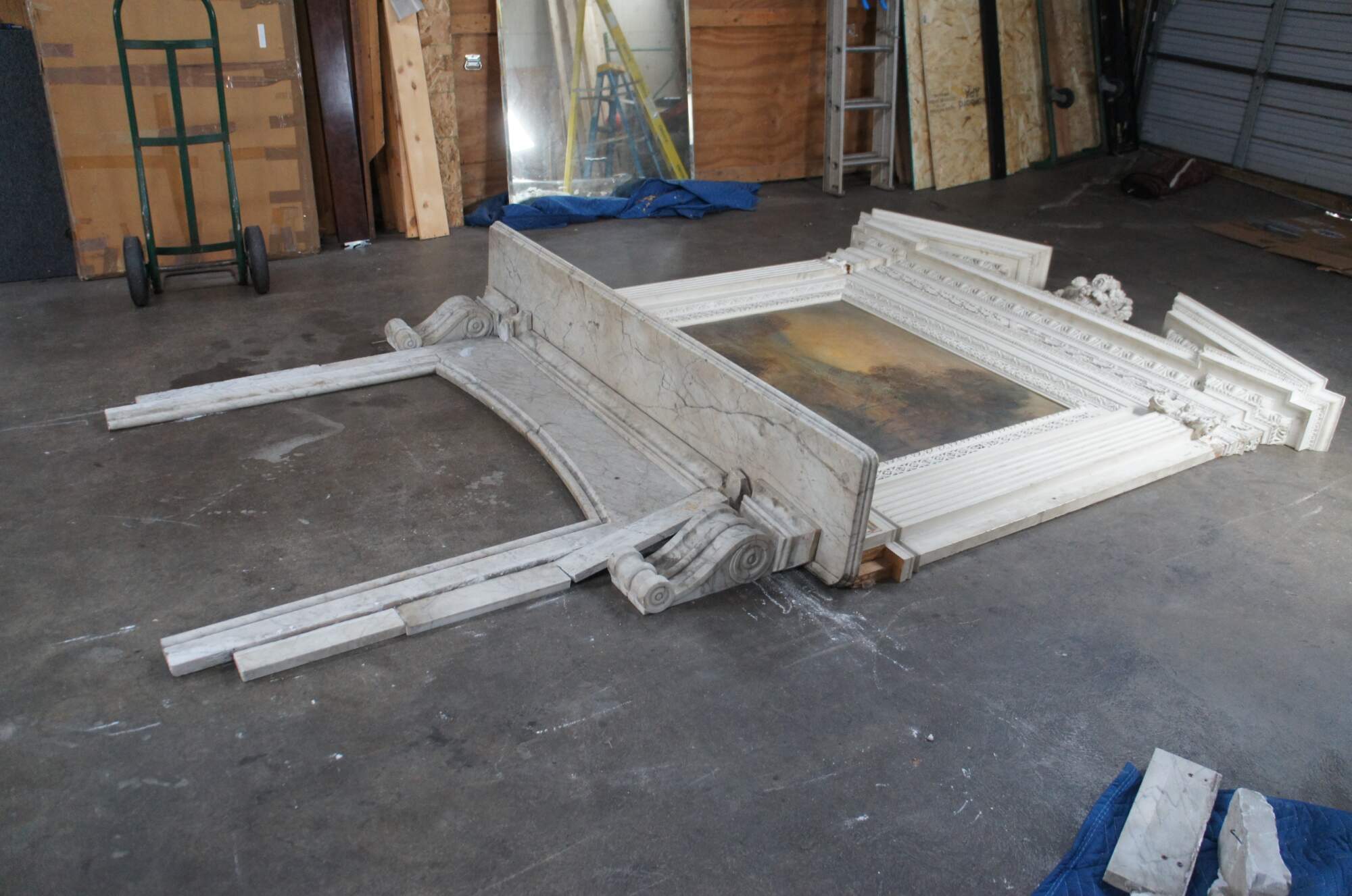 Wear and distressing commensurate with age and use, damage to carved topper, missing pieces of molding, broken marble, Will require fabricating some new pieces, heavy crazing to oil painting. Assembly required